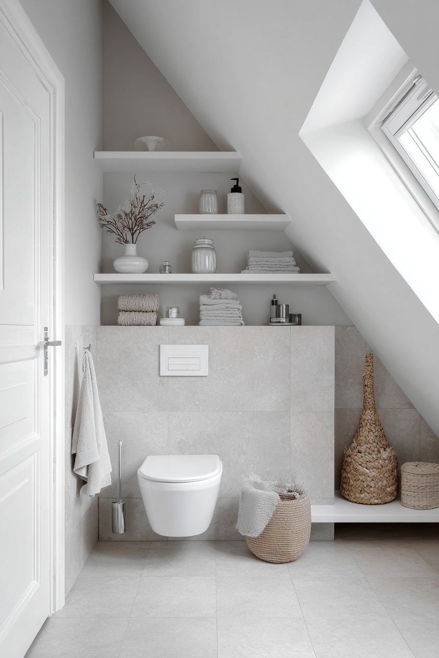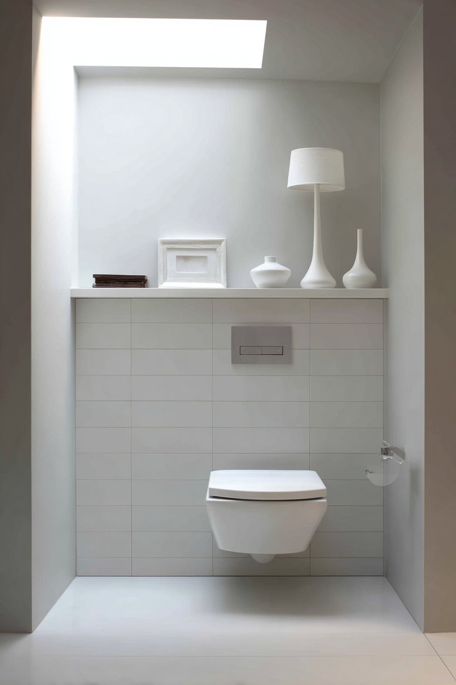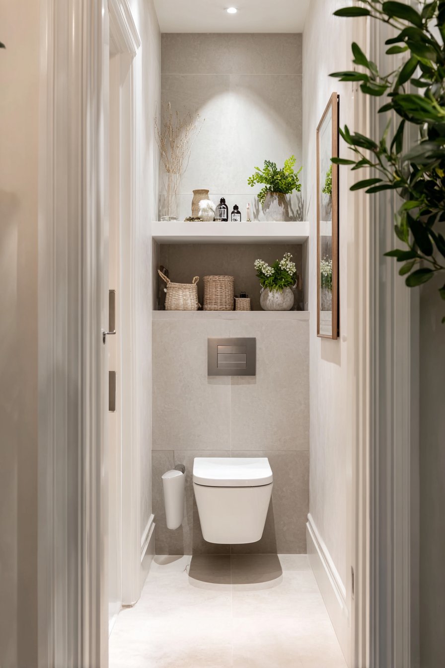 The concealed tank system hidden behind a tiled wall represents smart use of wall depth that would otherwise remain unutilized, effectively moving the plumbing infrastructure out of sight without sacrificing functionality. Above the toilet, a narrow floating shelf provides a practical surface for decorative items or essential storage without the bulk of traditional over-toilet cabinets that can make small bathrooms feel top-heavy and cramped. The choice of matte white fixtures creates a cohesive, seamless look when paired with pale grey walls, allowing the architectural elements rather than surface treatments to define the space.