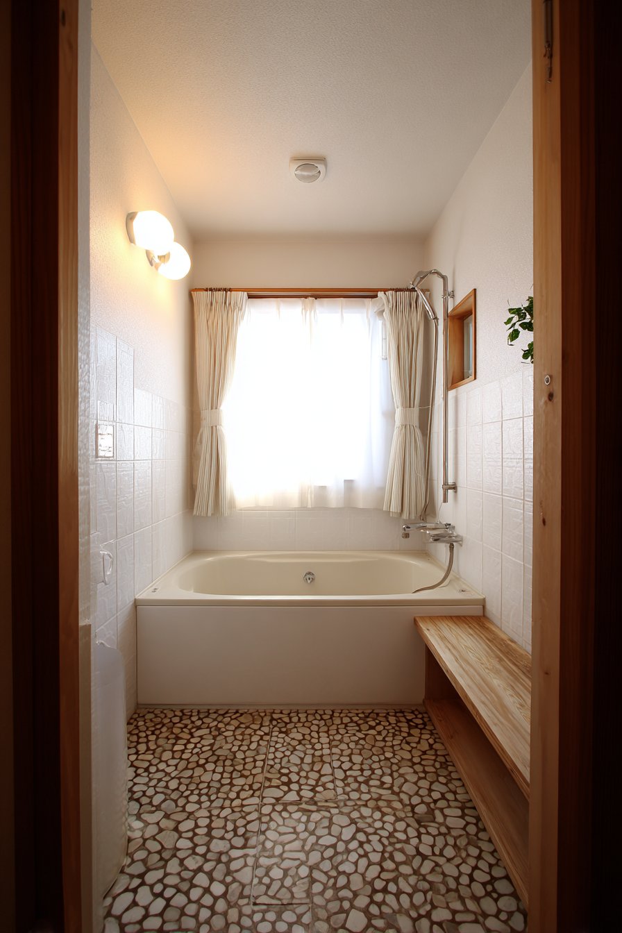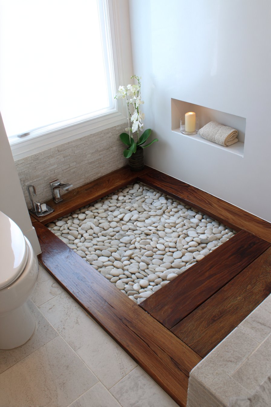 A small shelf niche built into the tile holds bath essentials within easy reach without requiring separate caddies or corner shelves that would intrude into the compact bathing space. Pebble floor tiles create spa-like texture underfoot, their natural forms and varying sizes adding organic interest to the otherwise rectilinear bathroom. Soft natural lighting through a frosted window creates tranquil ambiance that supports the meditative bathing experience that deep soaking tubs facilitate.