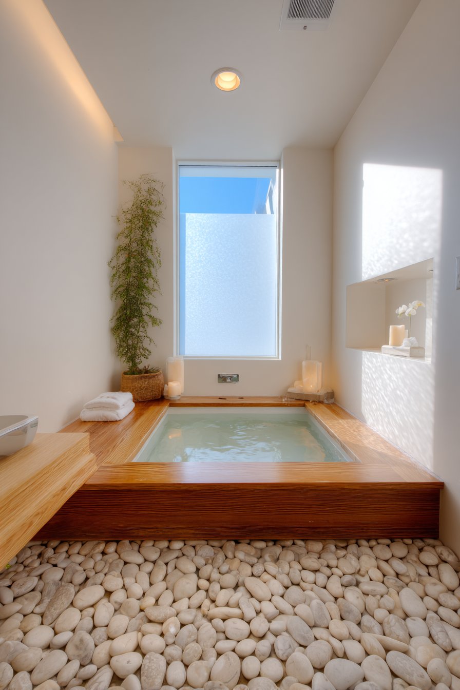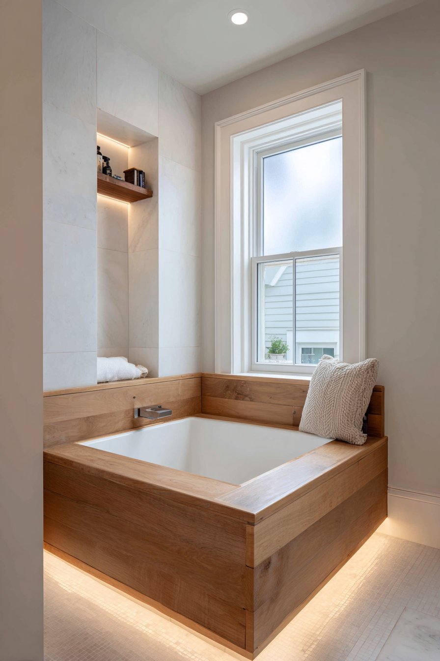 Western bathrooms typically prioritize tub length to accommodate reclining, but Japanese soaking tub design takes a radically different approach—maximizing depth while minimizing floor footprint to create an immersive bathing experience in minimal space. A compact deep square tub only 36 inches wide provides luxurious bathing in a 5×6 foot bathroom, its depth allowing users to sit upright with water covering shoulders rather than reclining in shallow water. Natural wood accents on the tub surround add warmth against white walls, referencing traditional Japanese bathing culture while adapting it to contemporary contexts.