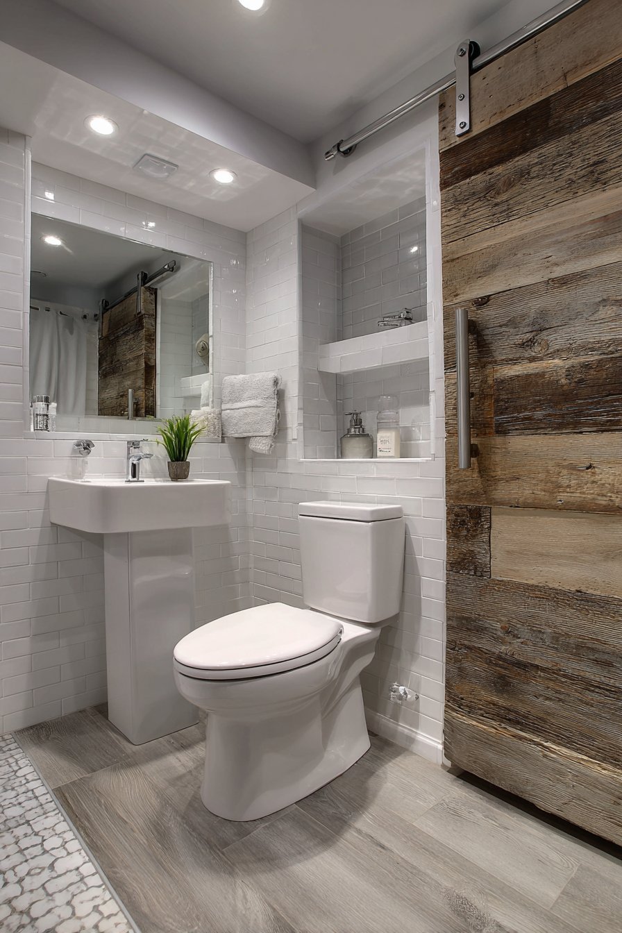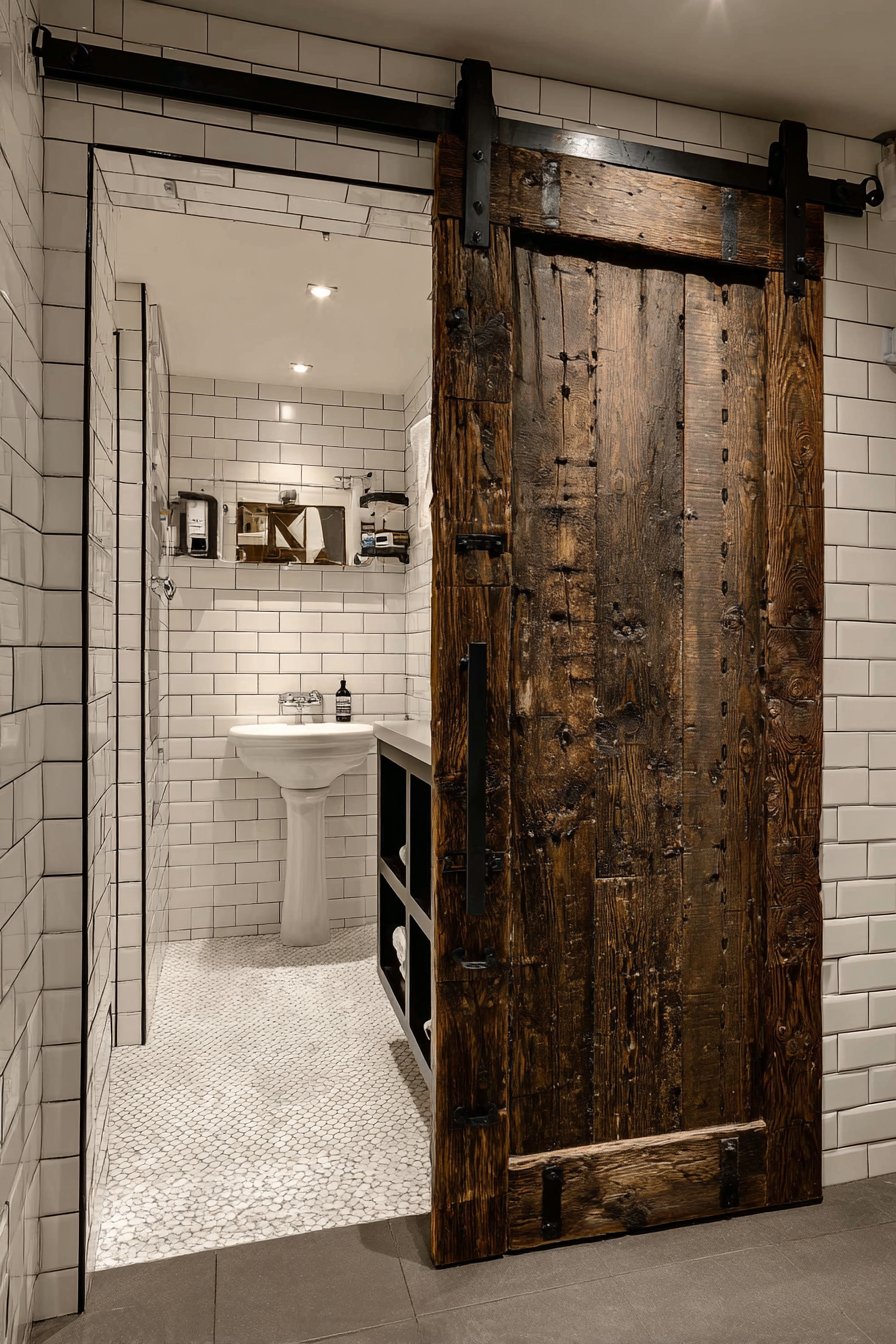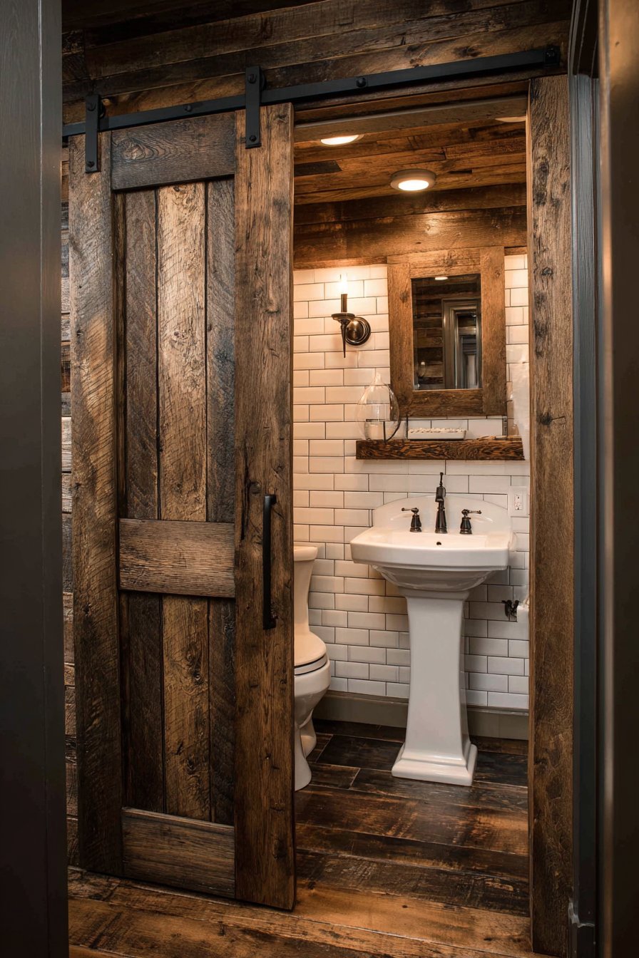 Wide-angle interior design photography effectively captures both the space-saving door mechanism and the efficiently arranged interior, demonstrating how these two elements work together to create a functional bathroom in an extremely limited footprint. The barn door itself becomes a design feature rather than merely functional hardware, with its visible track and rustic aesthetic adding visual interest to the hallway or bedroom from which the bathroom is accessed.