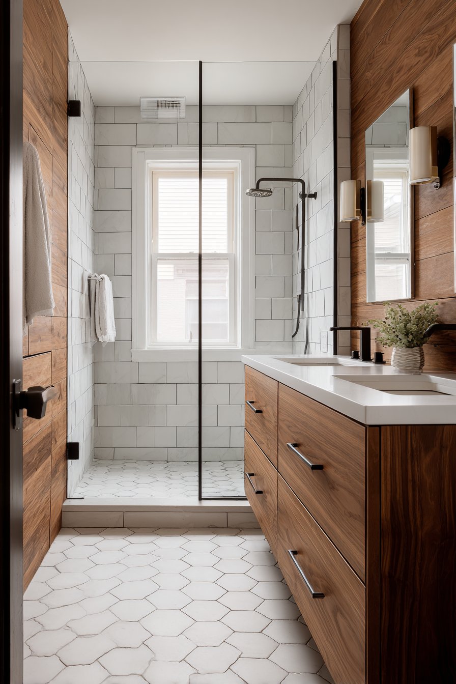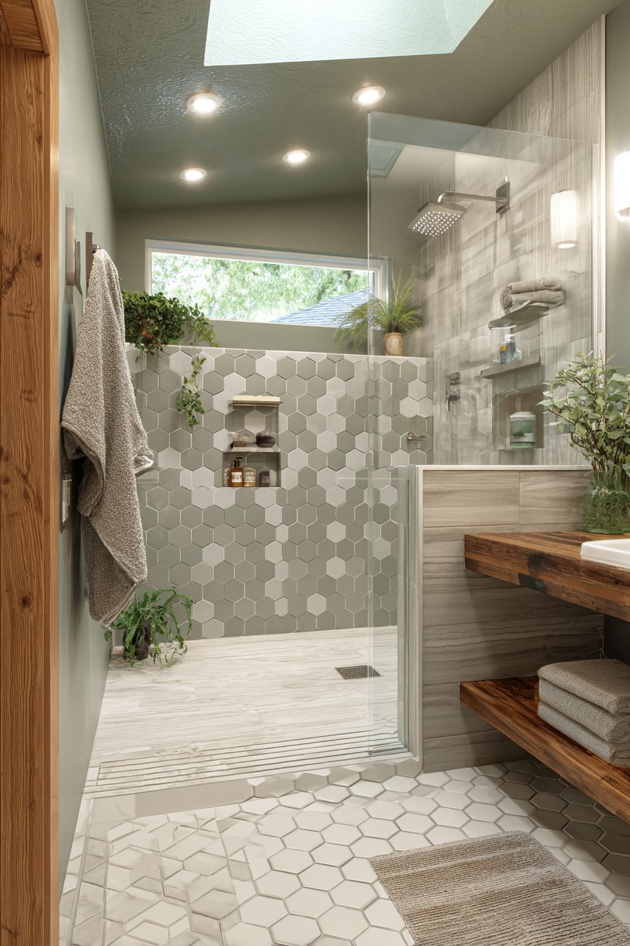 The wet room concept represents one of the most radical approaches to tiny bathroom design, eliminating traditional shower enclosures entirely and instead creating one continuous waterproof surface that functions as both bathroom floor and shower floor. This approach proves particularly effective in 45-square-foot spaces where traditional shower stalls would consume disproportionate amounts of the available area. A curbless shower floor with a linear drain integrated into white hexagonal tile pattern creates a seamless transition that allows the entire floor plane to read as one unified surface, dramatically expanding the perceived size of the bathroom.