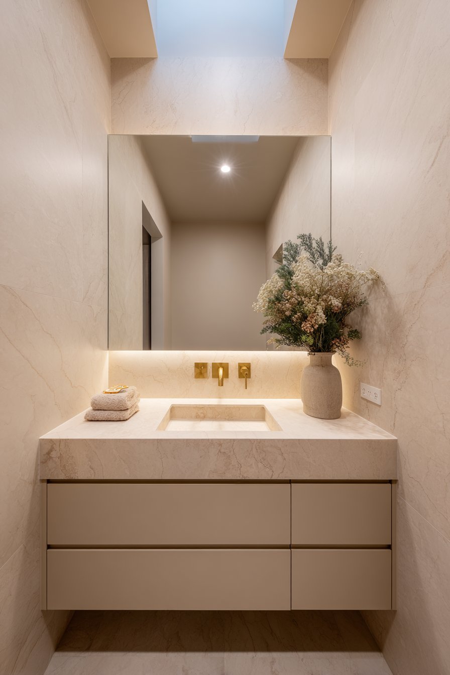 A large mirror extending wall-to-wall creates one of the most effective optical illusions in small bathroom design, visually doubling the perceived depth of the space by reflecting the opposite wall and creating the impression that the bathroom extends much further than it actually does. Brushed gold fixtures add a touch of elegance and warmth that prevents the narrow space from feeling cold or institutional, while the metallic finish catches and reflects light throughout the day. Soft natural lighting from above creates gentle highlights that emphasize the fixtures and fittings without creating harsh shadows that can make narrow spaces feel more constricted.
