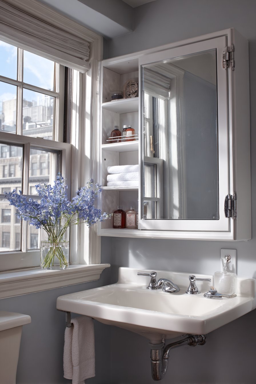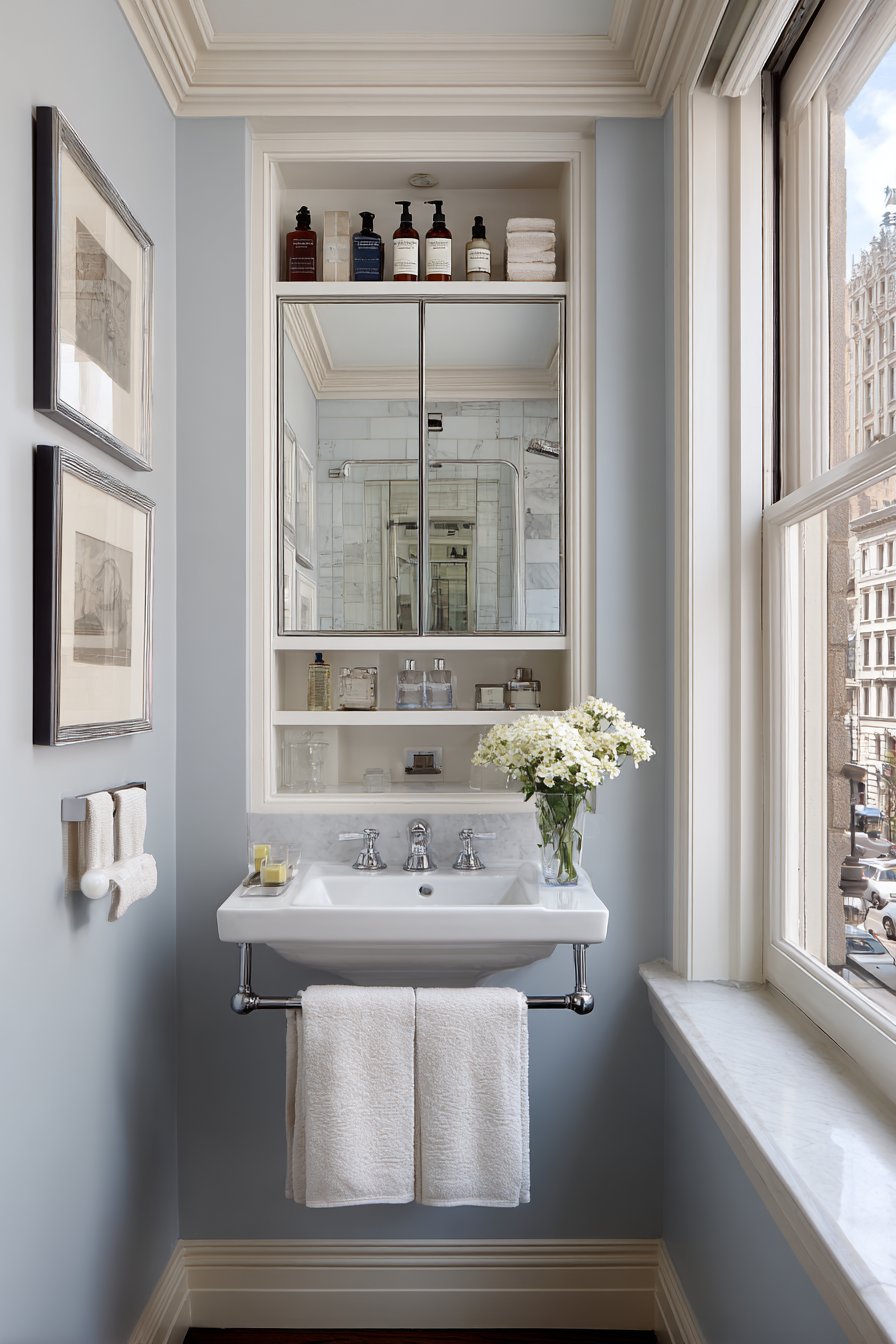 Inside the bathroom, a pedestal sink and wall-mounted storage maximize the limited footprint by keeping the floor as clear as possible, a crucial strategy in bathrooms where every square foot counts. The pedestal sink’s slim profile provides essential washing functionality without the bulk of vanity cabinets, while wall-mounted storage keeps toiletries and towels accessible without encroaching on movement space. Recessed lighting provides even illumination without requiring surface-mounted fixtures that would protrude into the limited overhead space.