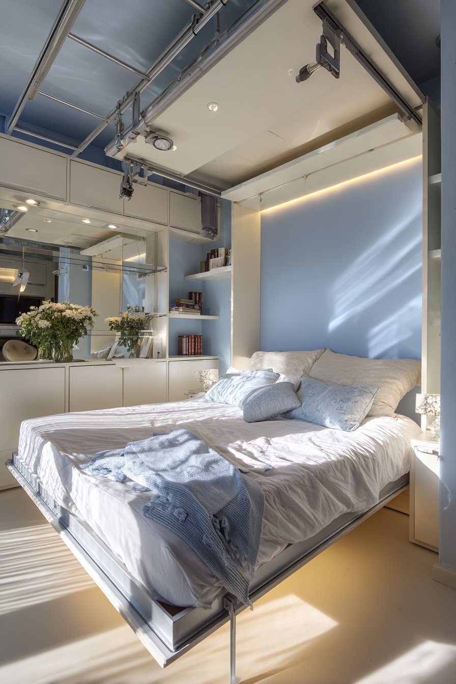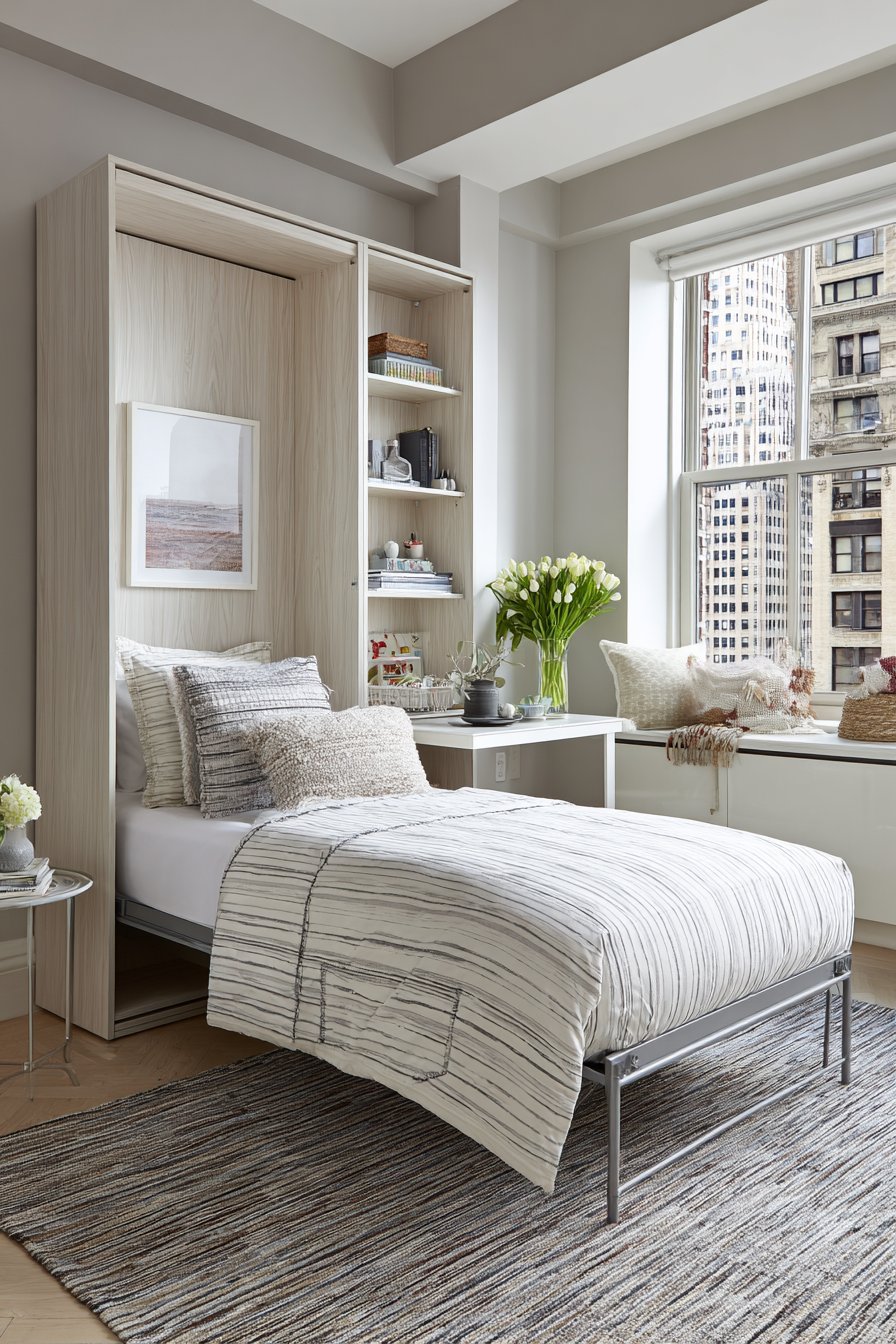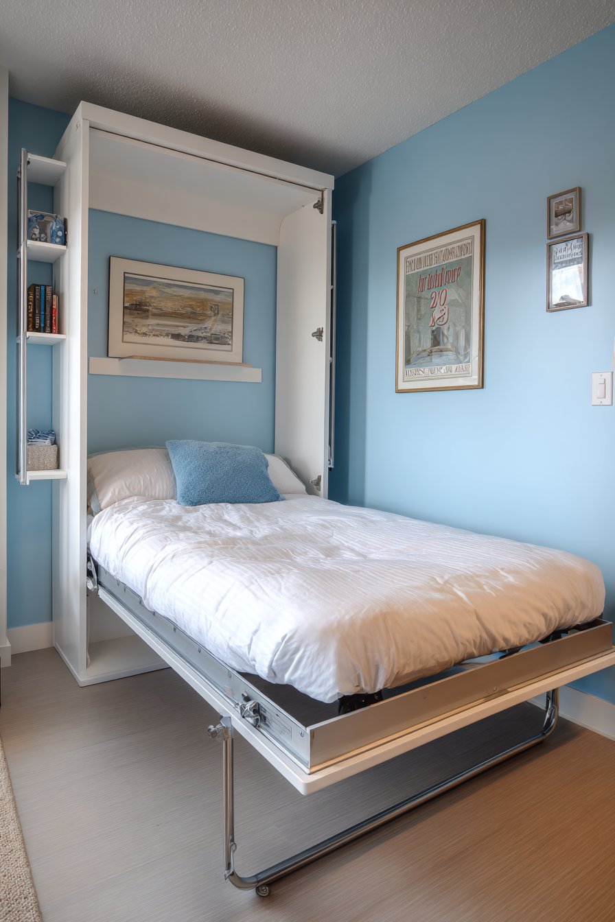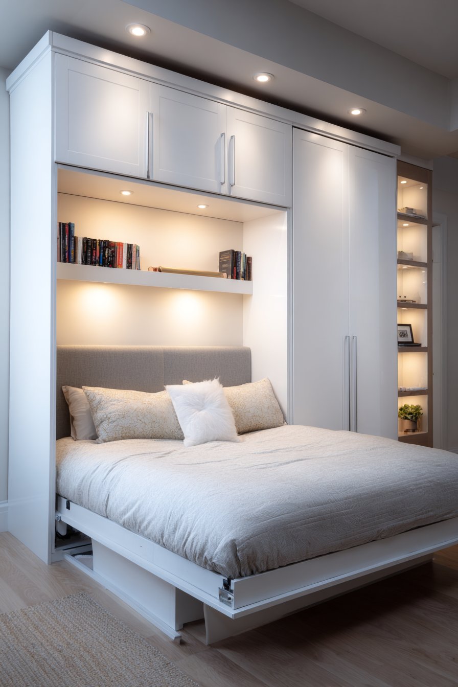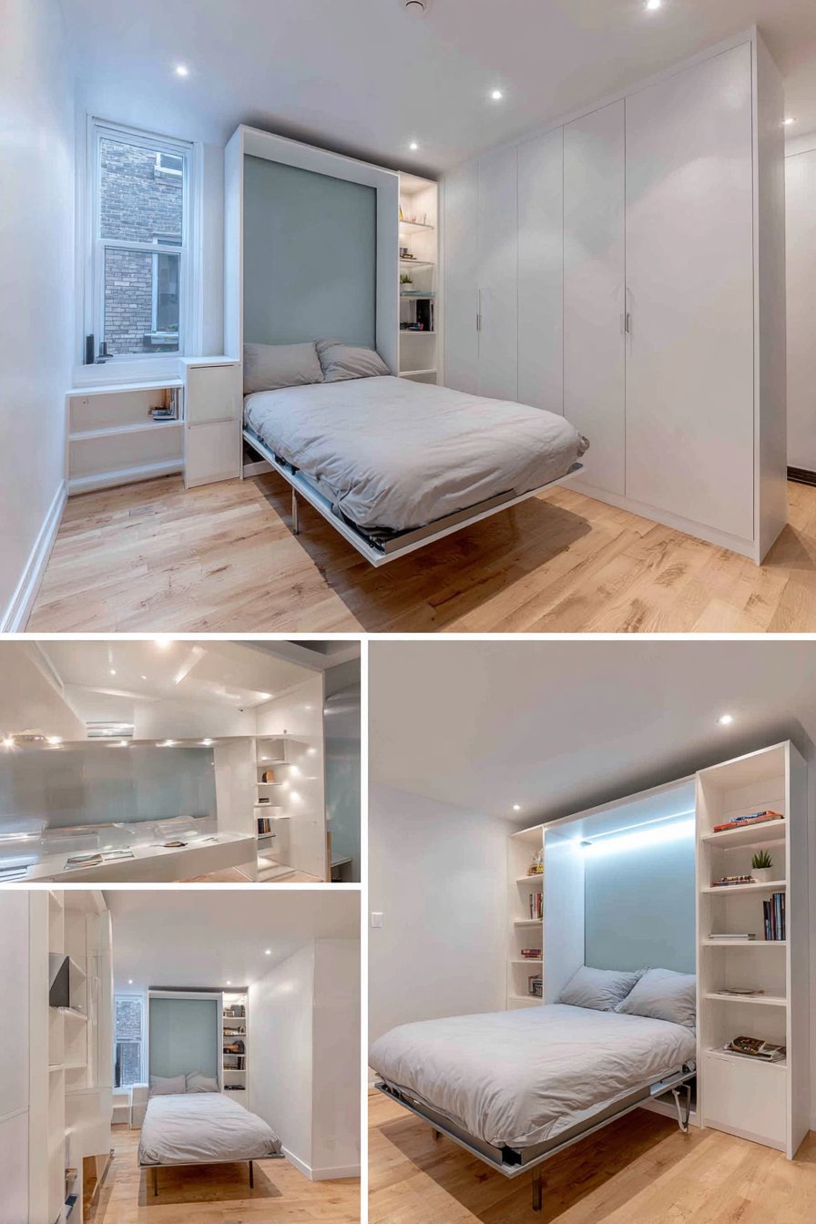 The beauty of this tiny bedroom idea lies in its dual functionality. During the day, your bedroom can serve as a home office, yoga studio, or entertainment space, with the bed completely concealed behind what appears to be an attractive wall unit or cabinet system. When evening arrives, simply pull down the bed mechanism to reveal a comfortable sleeping surface complete with your regular mattress and bedding. The surrounding shelving provides convenient storage for books, decorative items, and bedtime essentials, keeping everything within arm’s reach without cluttering valuable floor space.
