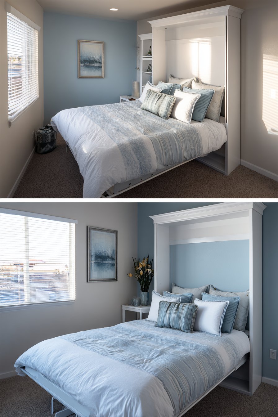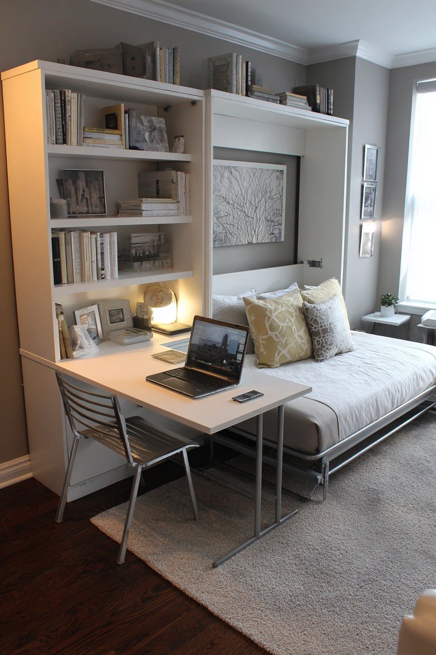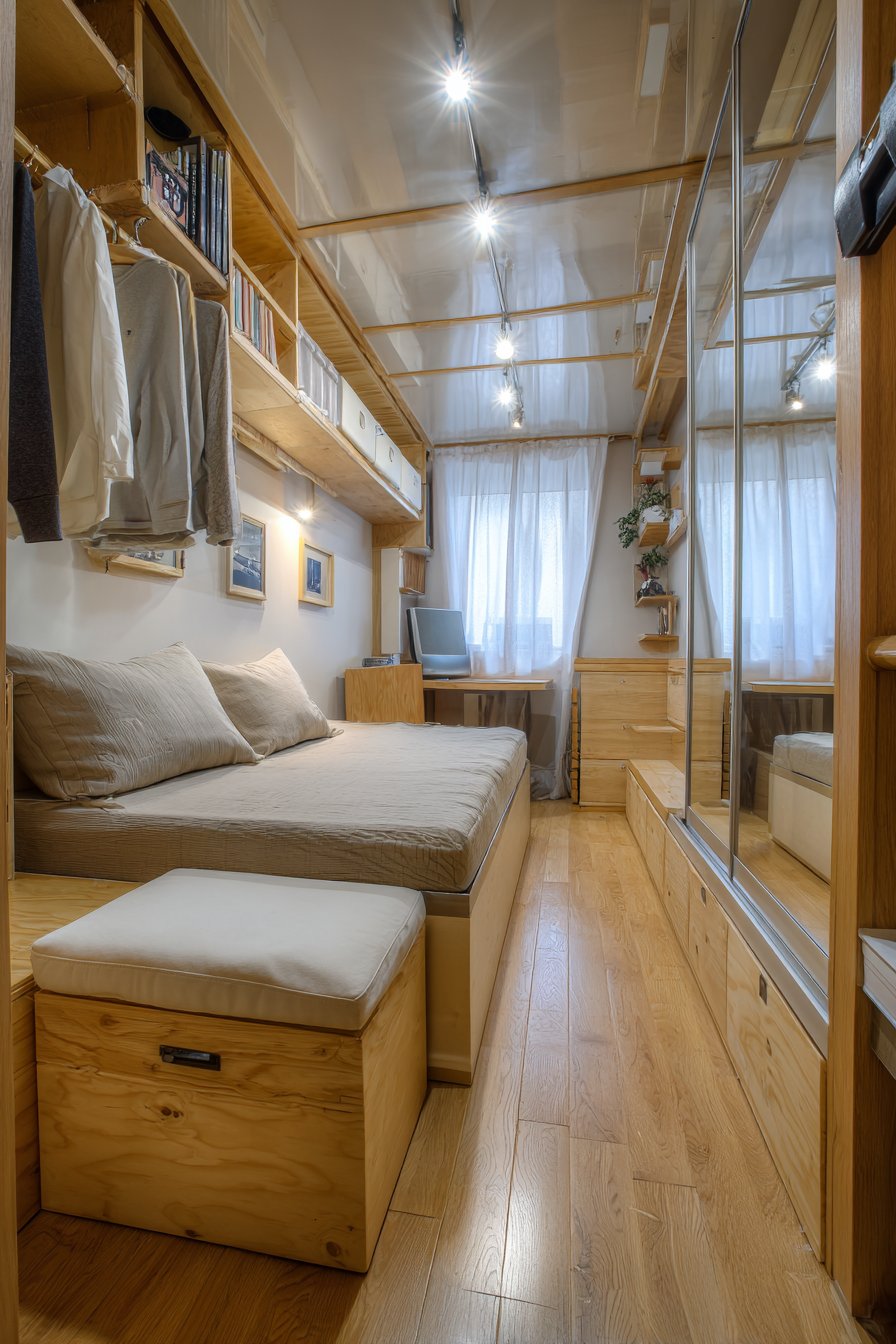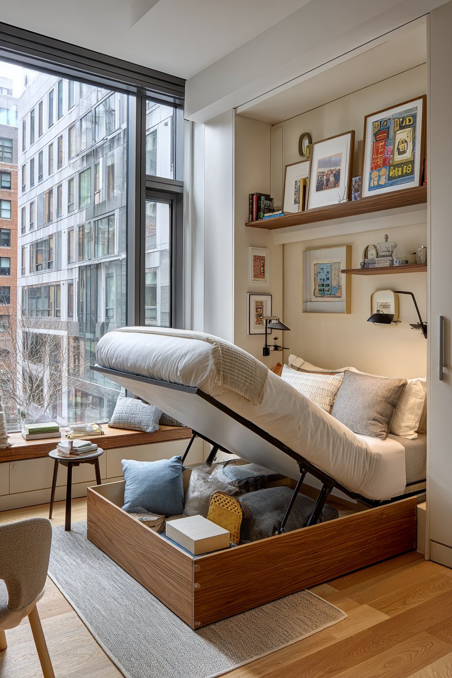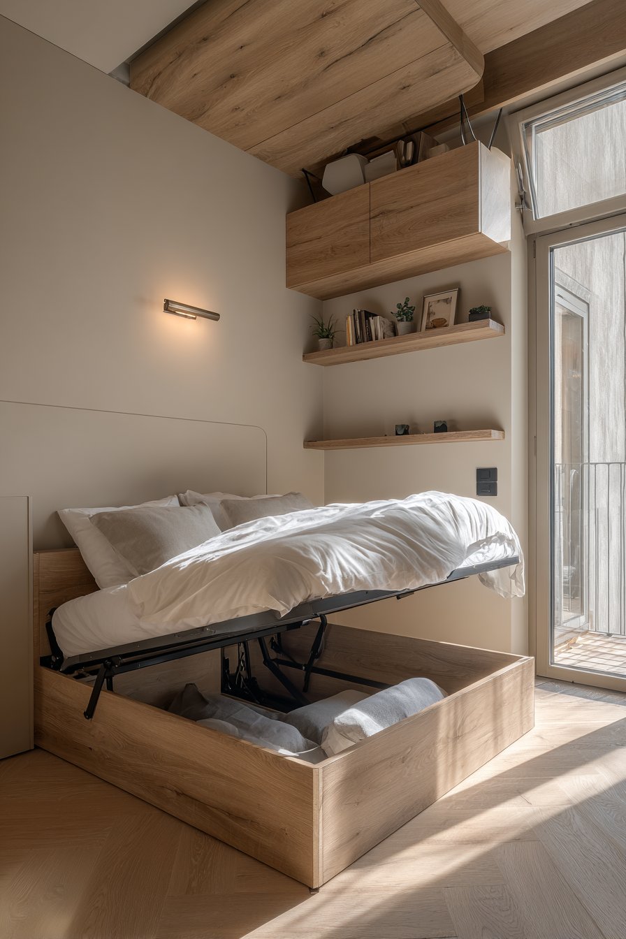 The beauty of this tiny bedroom idea lies in its dual functionality. During the day, your bedroom can serve as a home office, yoga studio, or entertainment space, with the bed completely concealed behind what appears to be an attractive wall unit or cabinet system. When evening arrives, simply pull down the bed mechanism to reveal a comfortable sleeping surface complete with your regular mattress and bedding. The surrounding shelving provides convenient storage for books, decorative items, and bedtime essentials, keeping everything within arm’s reach without cluttering valuable floor space.
