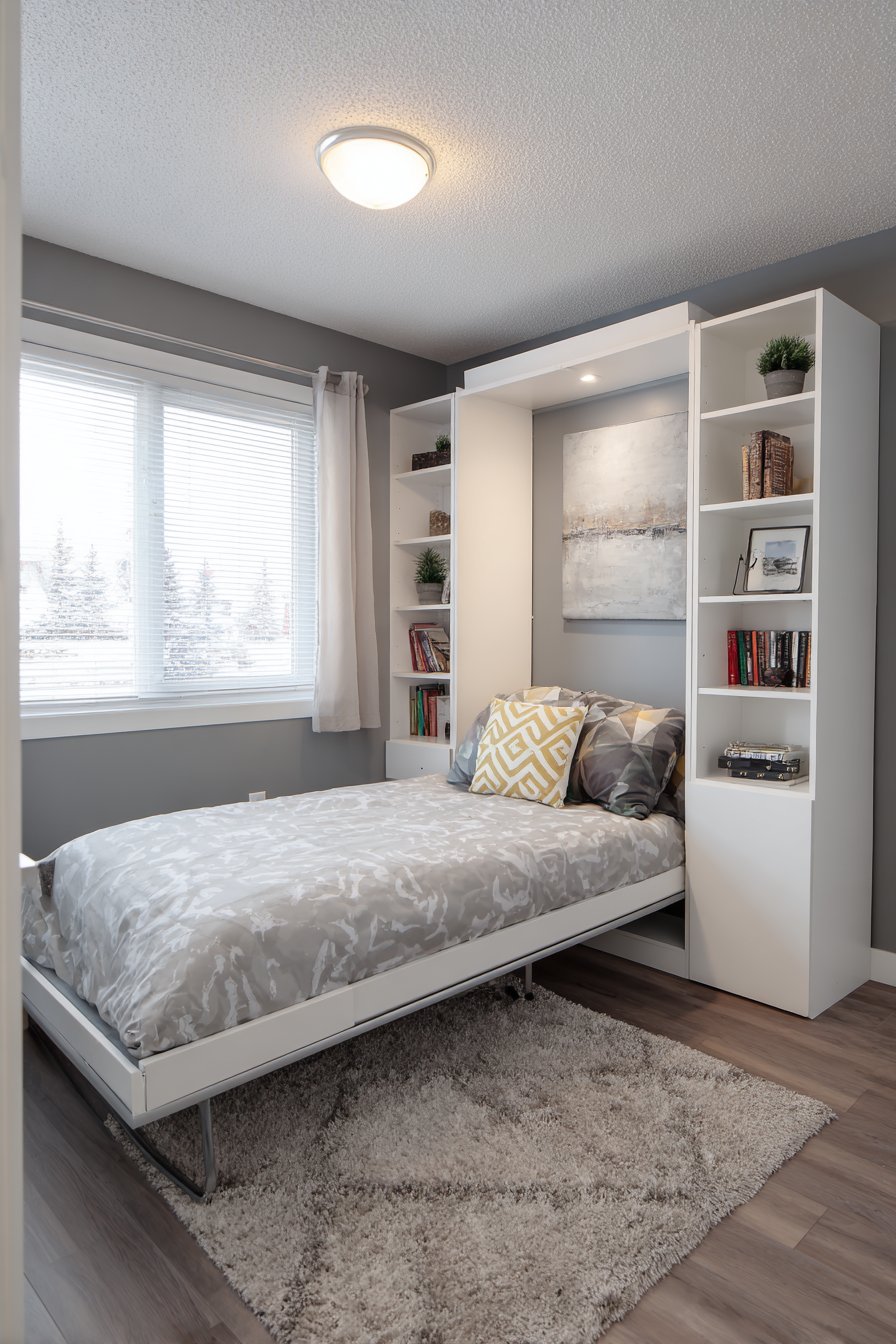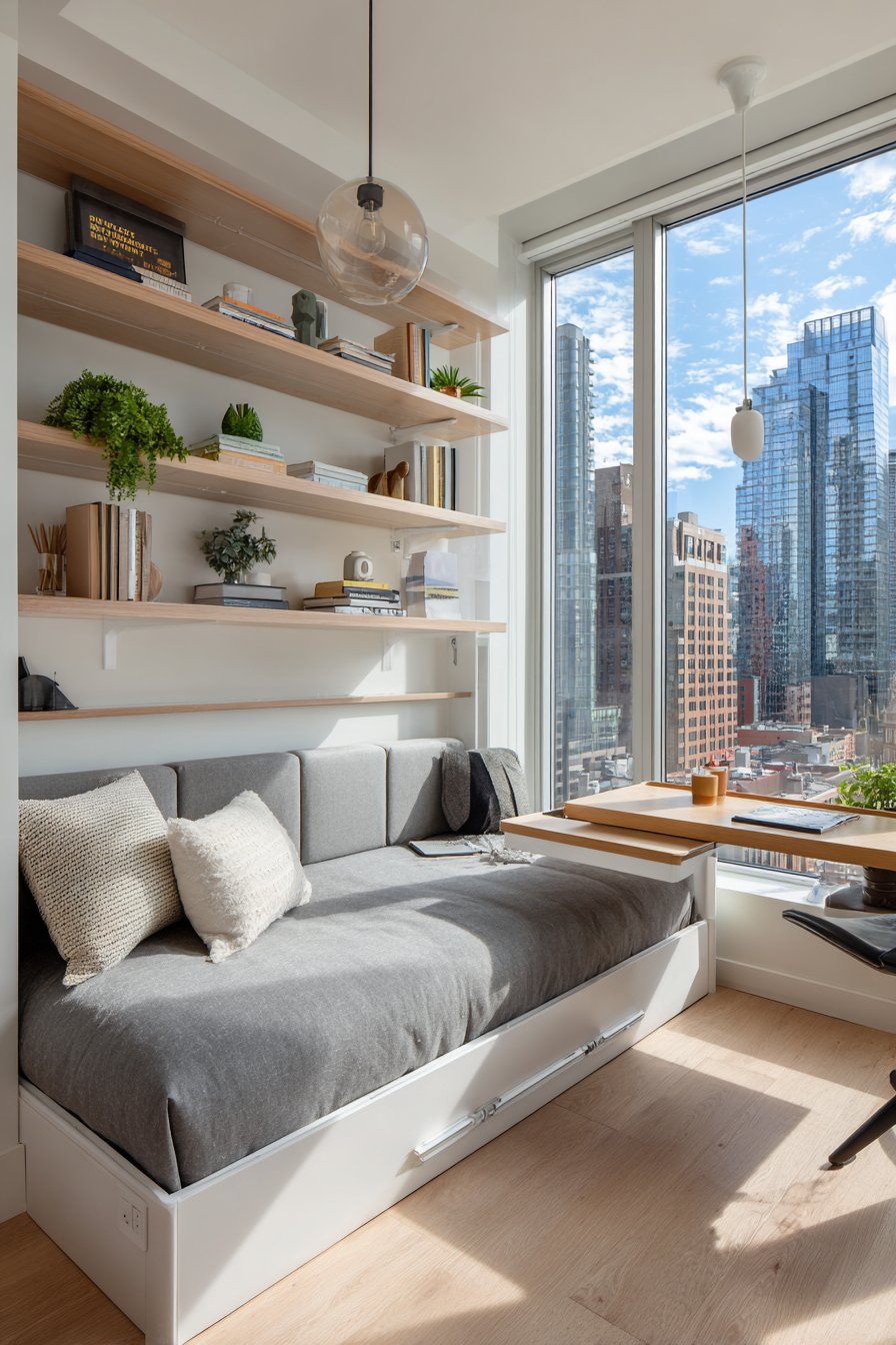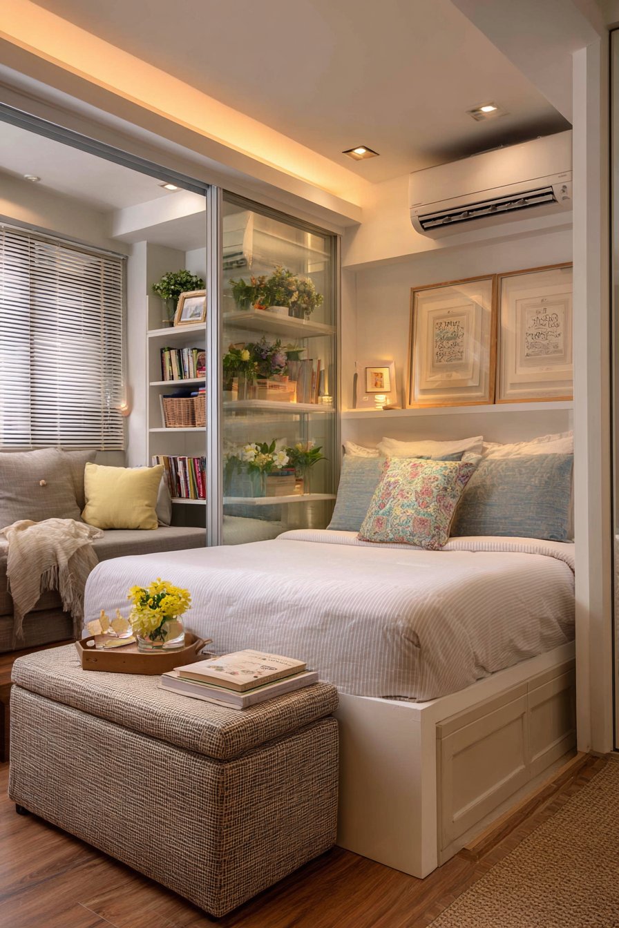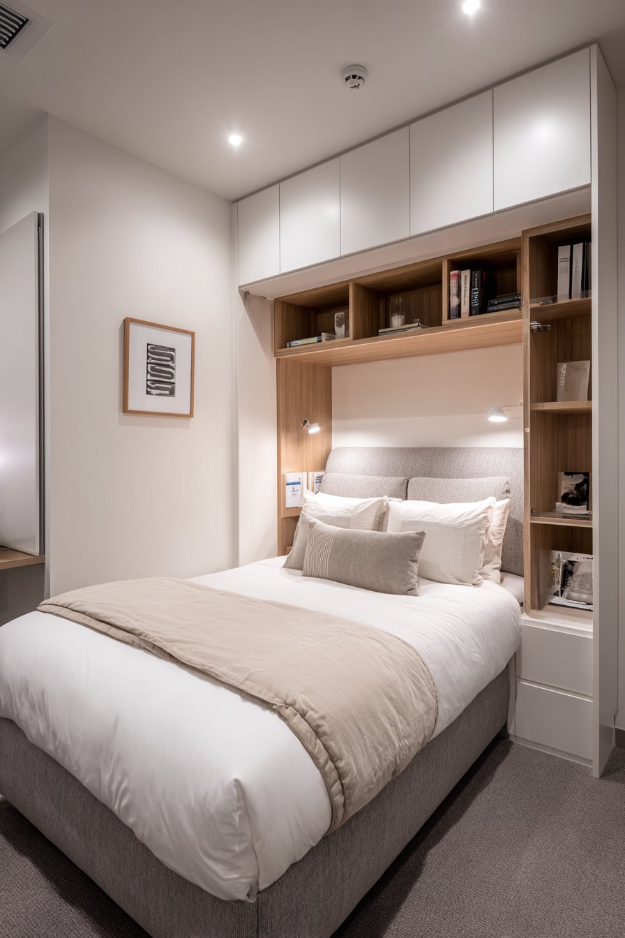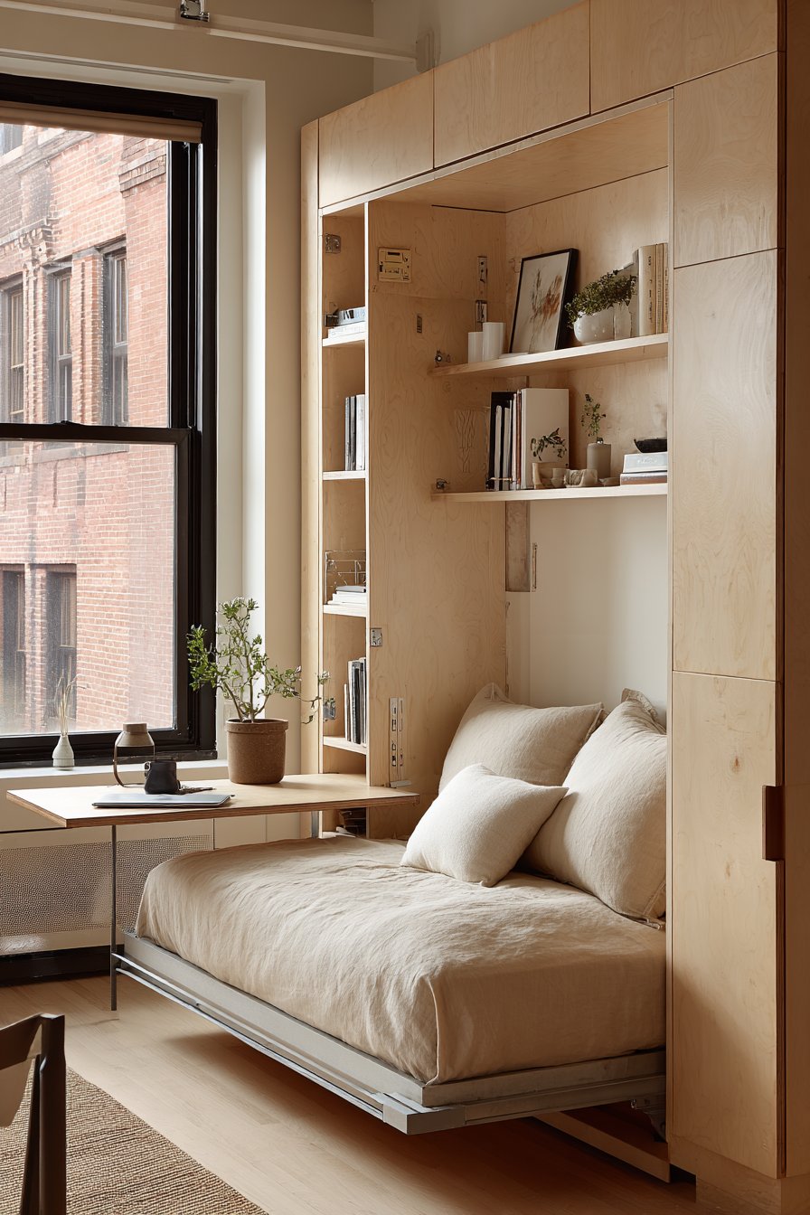 The beauty of this tiny bedroom idea lies in its dual functionality. During the day, your bedroom can serve as a home office, yoga studio, or entertainment space, with the bed completely concealed behind what appears to be an attractive wall unit or cabinet system. When evening arrives, simply pull down the bed mechanism to reveal a comfortable sleeping surface complete with your regular mattress and bedding. The surrounding shelving provides convenient storage for books, decorative items, and bedtime essentials, keeping everything within arm’s reach without cluttering valuable floor space.