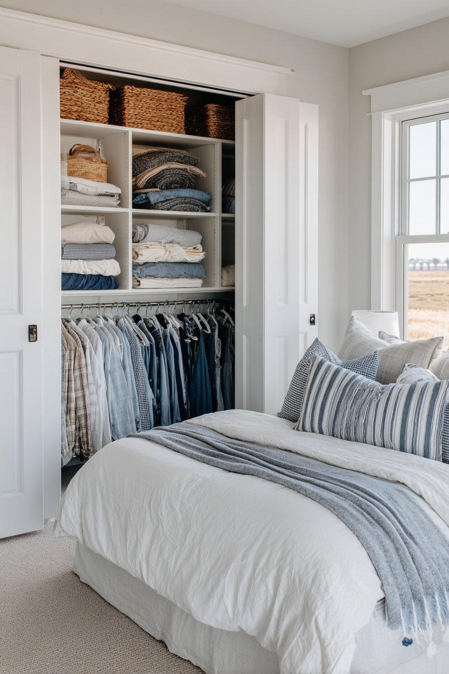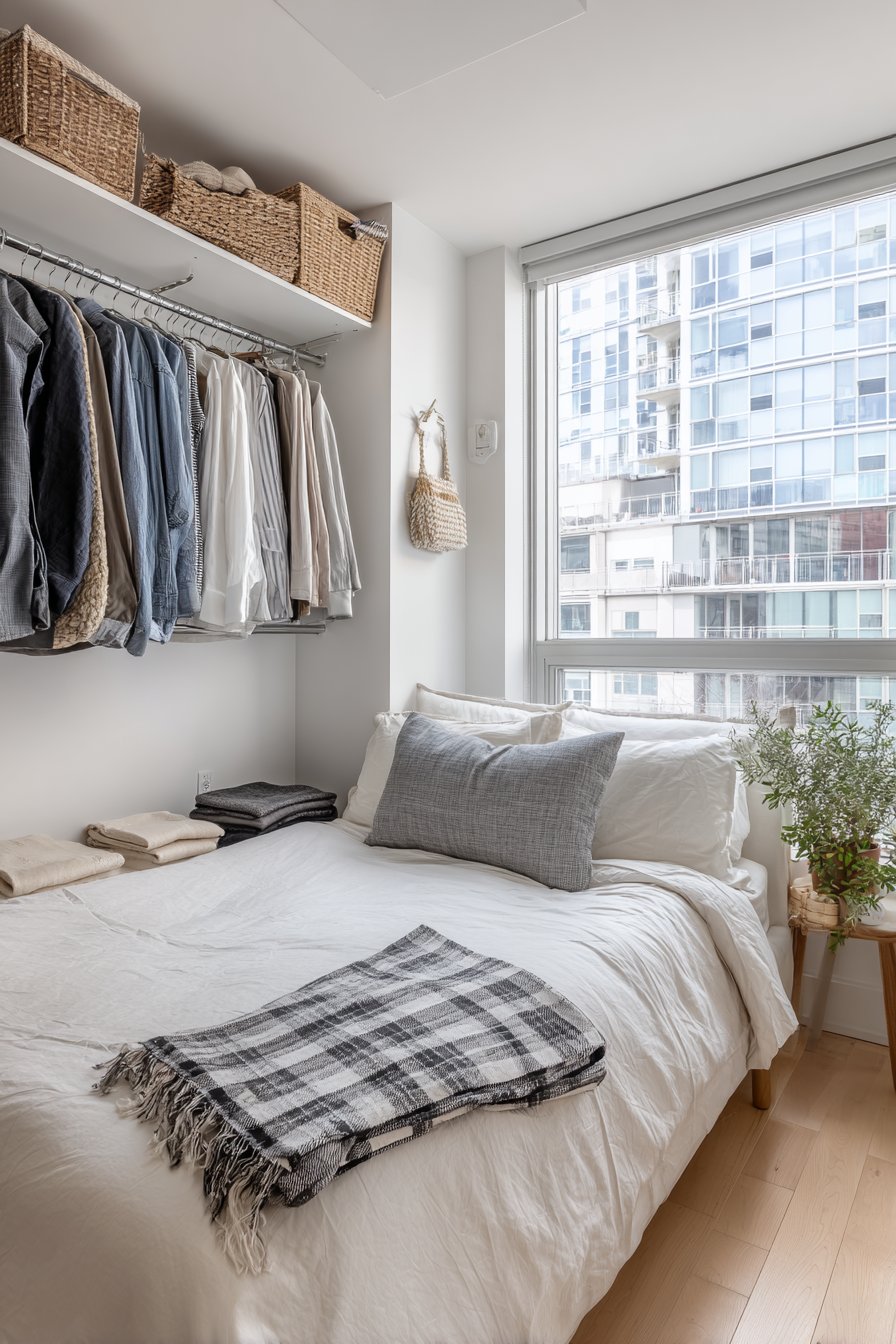 - Use a compact clothing rack for current-season items only, storing off-season clothing elsewhere