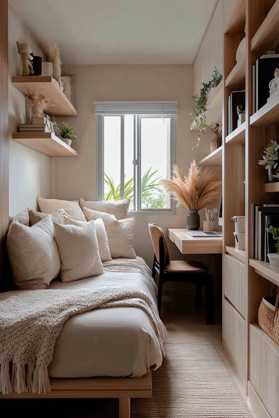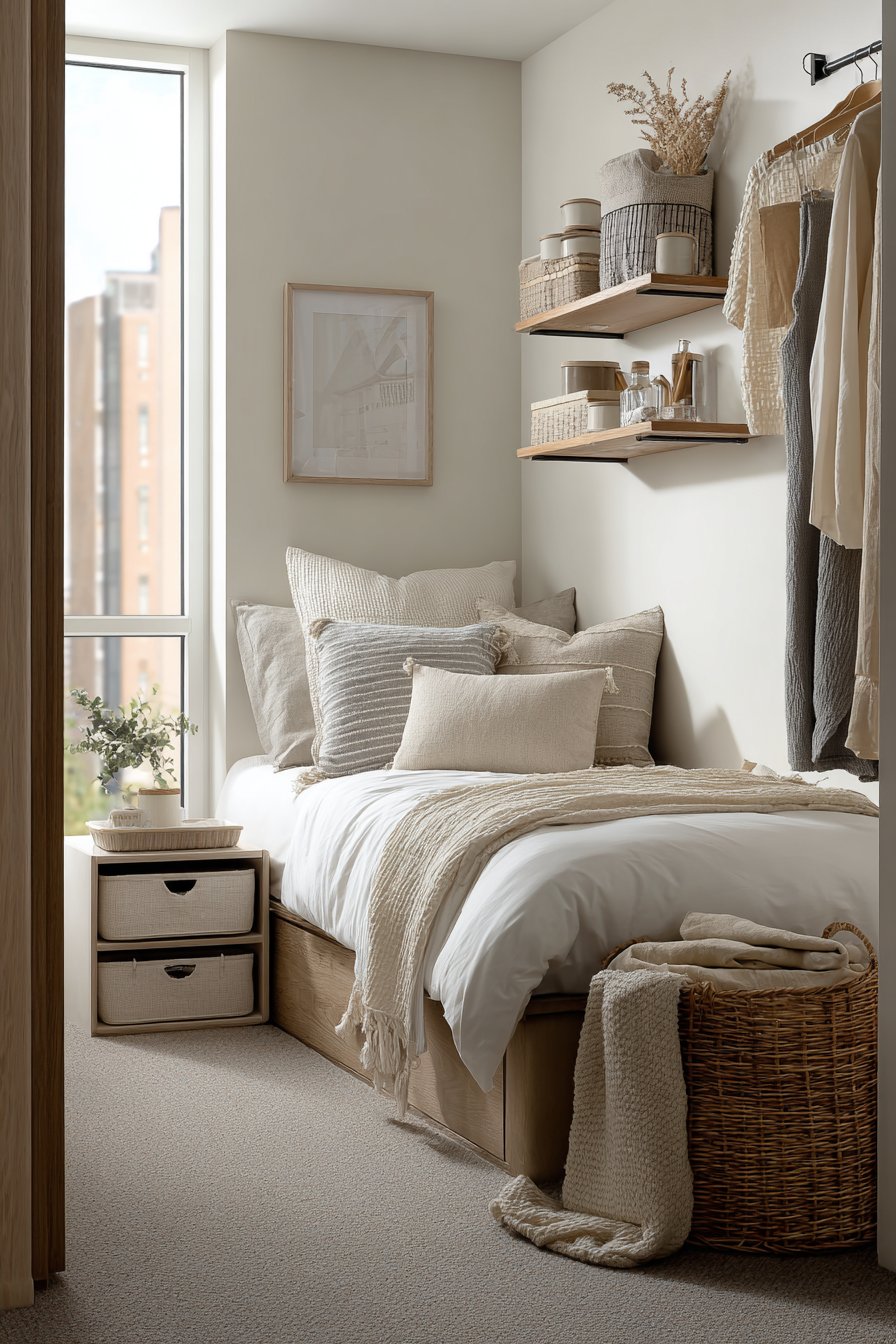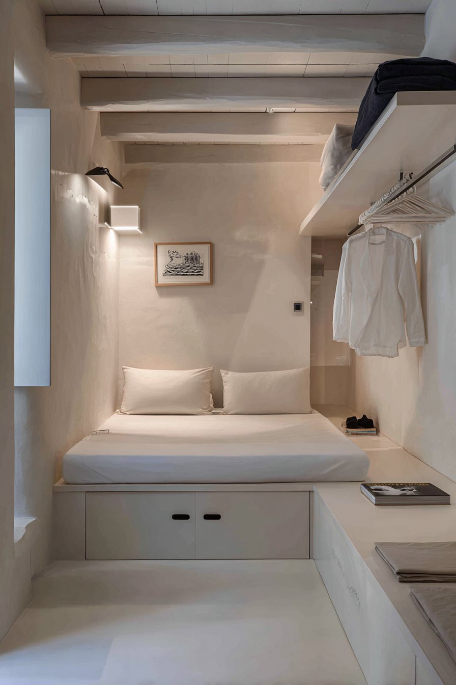 A single floating shelf mounted at headboard height serves as a minimalist nightstand, holding only essential items like an alarm clock, reading glasses, and perhaps a single small plant or meaningful object. This edited approach prevents the accumulation of clutter that can make tiny bedrooms feel chaotic and cramped. The walls, painted in warm white tones, provide a serene backdrop that maximizes light reflection while creating a sense of peace and tranquility. One small piece of carefully chosen artwork adds personality without overwhelming the intentionally spare aesthetic.