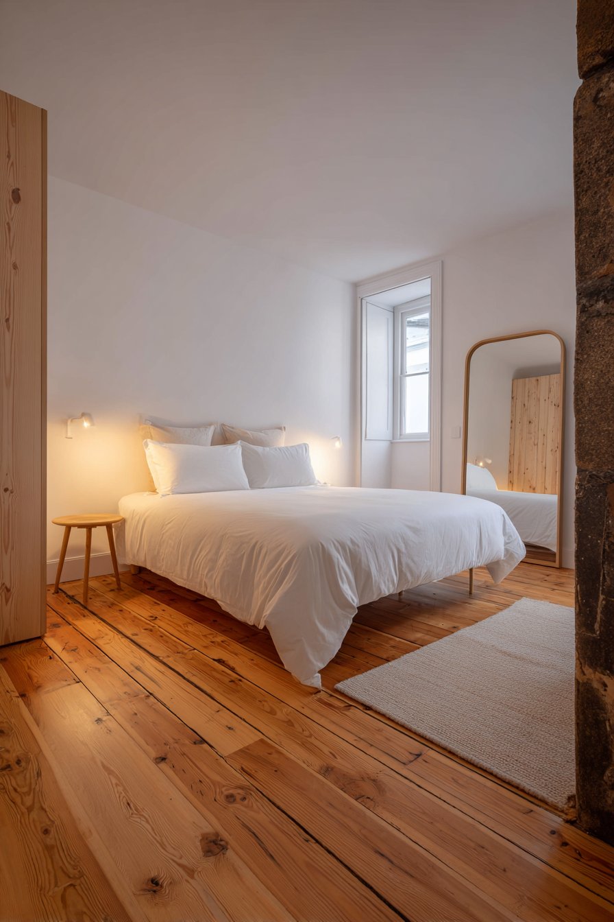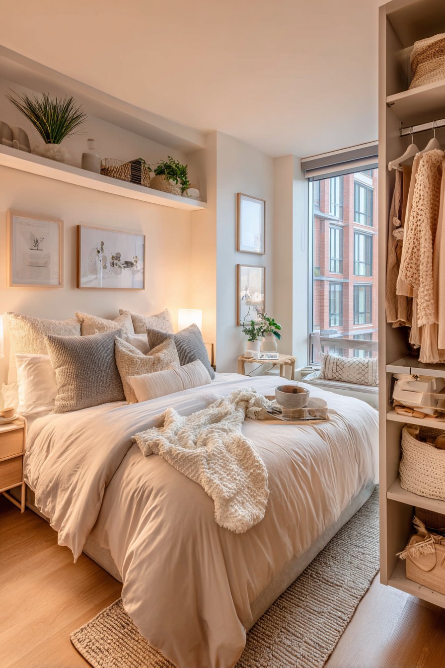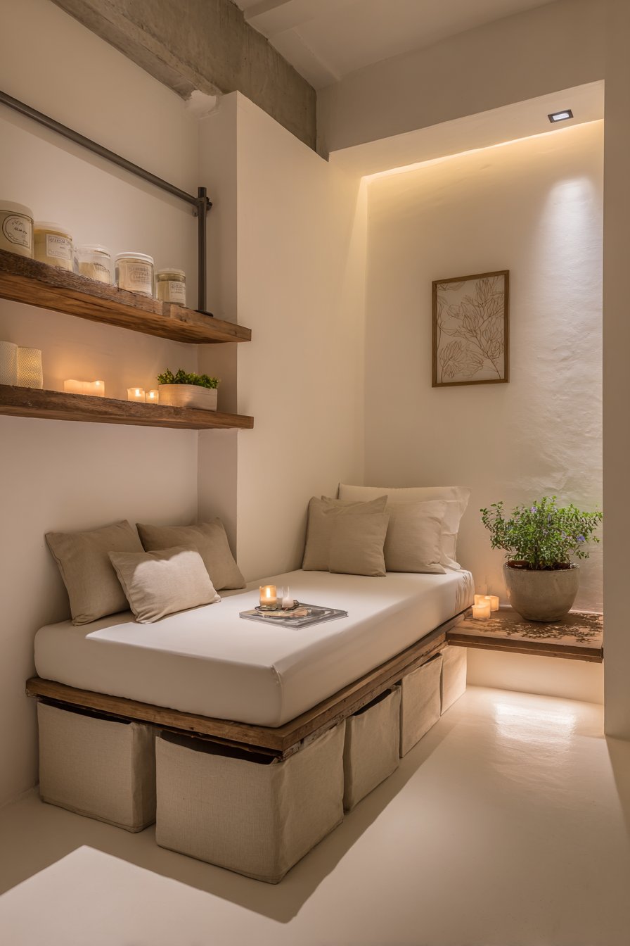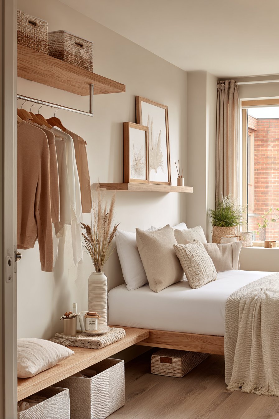 A single floating shelf mounted at headboard height serves as a minimalist nightstand, holding only essential items like an alarm clock, reading glasses, and perhaps a single small plant or meaningful object. This edited approach prevents the accumulation of clutter that can make tiny bedrooms feel chaotic and cramped. The walls, painted in warm white tones, provide a serene backdrop that maximizes light reflection while creating a sense of peace and tranquility. One small piece of carefully chosen artwork adds personality without overwhelming the intentionally spare aesthetic.