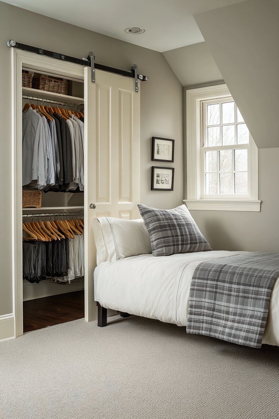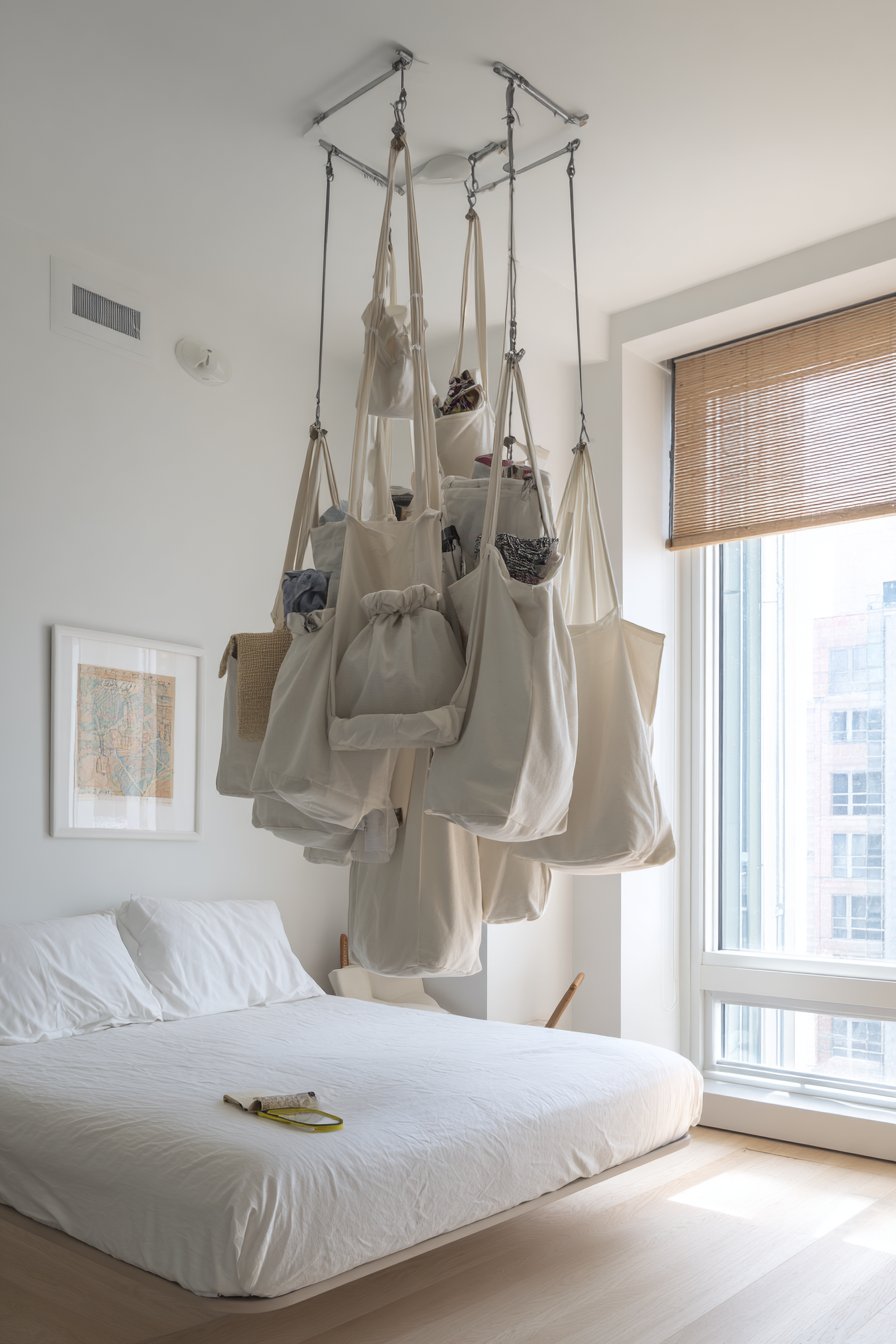 Thinking beyond conventional storage locations offers creative tiny room ideas for bedrooms, and hanging storage solutions maximize overhead space that typically goes unused. These systems feature fabric organizers or rigid bins suspended from ceiling-mounted rods, keeping items accessible without using valuable floor or wall space. The hanging organizers in neutral canvas materials maintain visual continuity with the room’s aesthetic while providing storage for clothing, accessories, shoes, and small items. The storage hangs at heights that keep items easily accessible while ensuring head clearance for walking beneath.