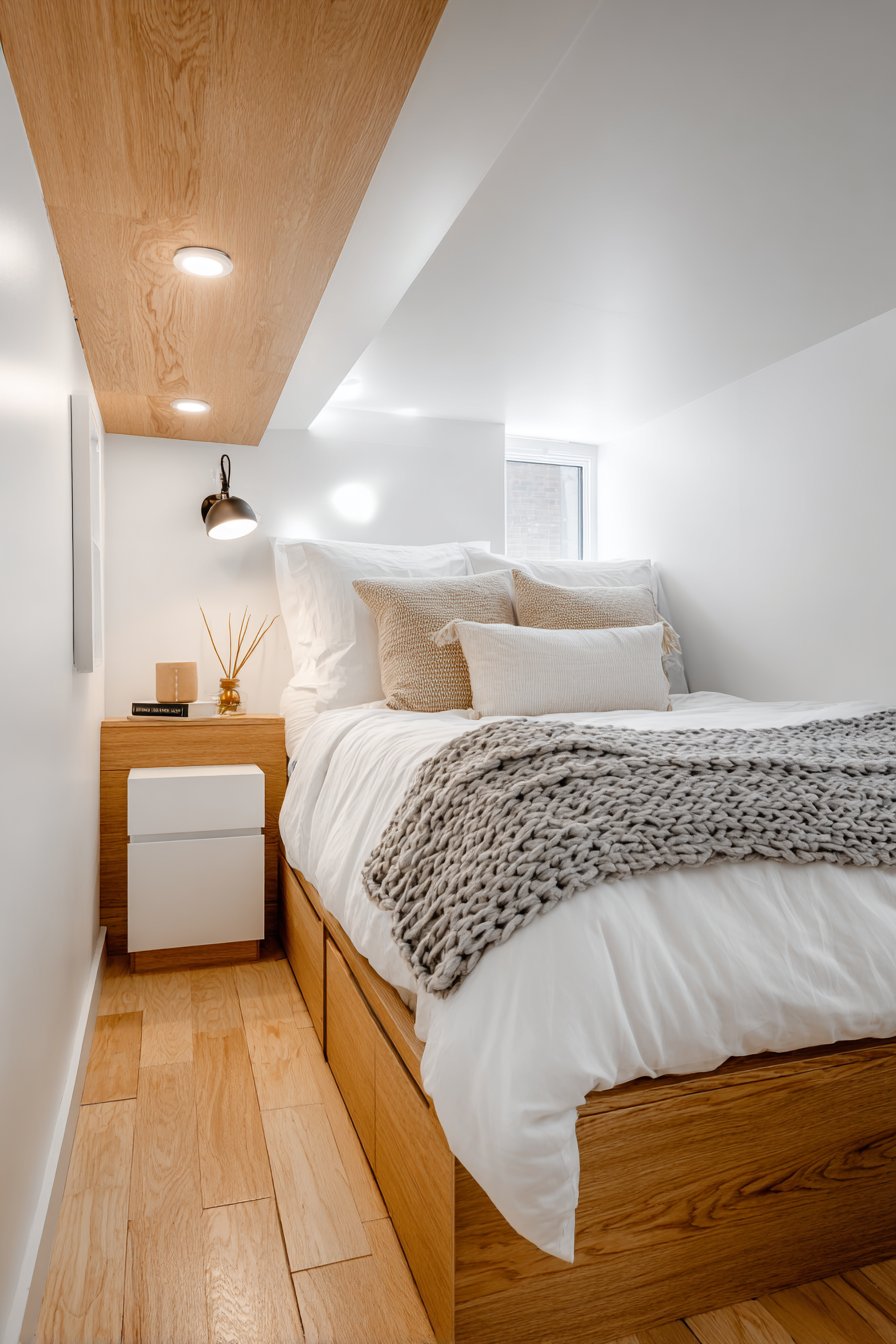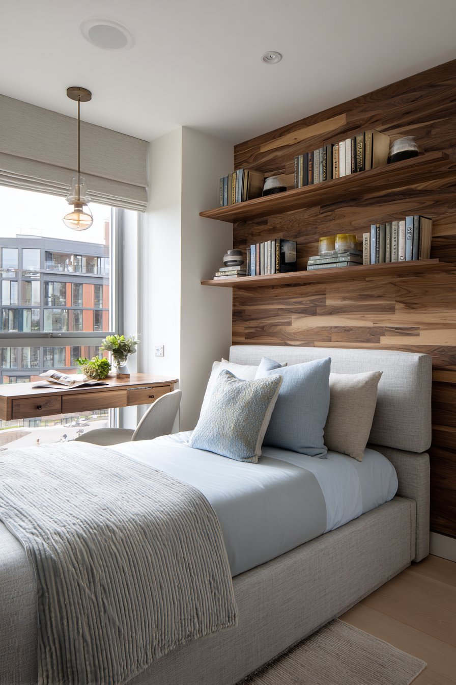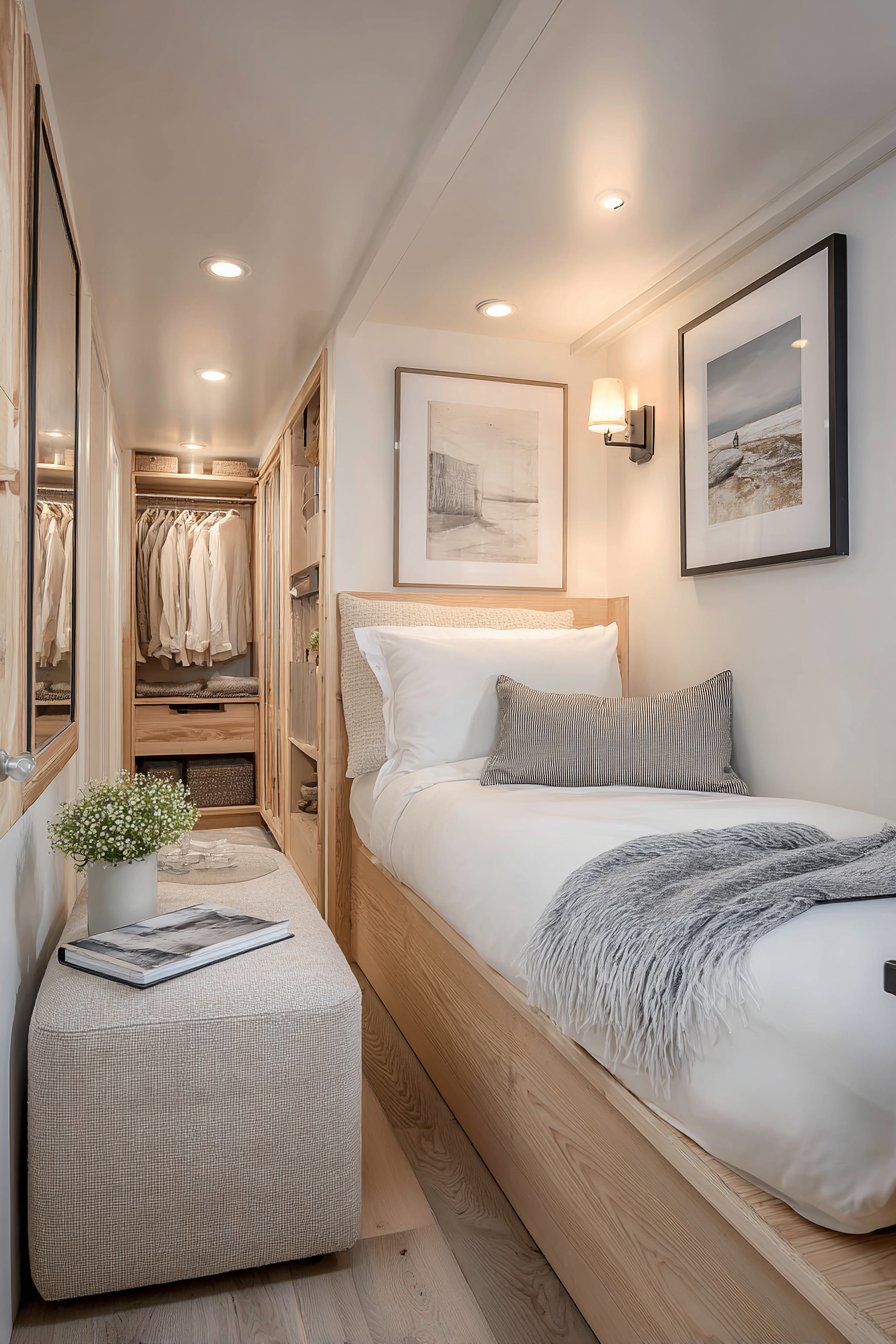 Floating nightstands mounted to the wall beside platform beds complement this tiny bedroom idea perfectly, eliminating the need for bulky bedside tables that consume precious floor space. Wall-mounted reading lamps with adjustable arms provide task lighting without requiring surface space, while the open floor area beneath floating furniture creates an airy feeling that makes the room appear larger. Natural oak or walnut flooring adds warmth and visual interest without competing with the bed’s streamlined design, creating a harmonious balance between functionality and style.