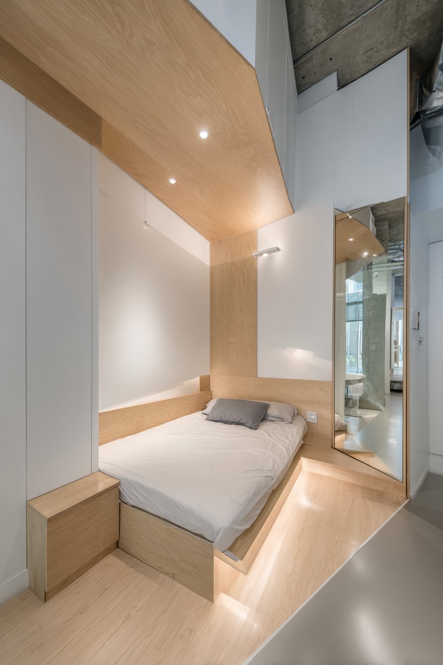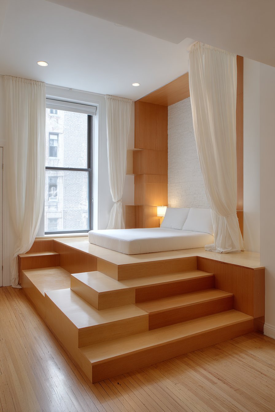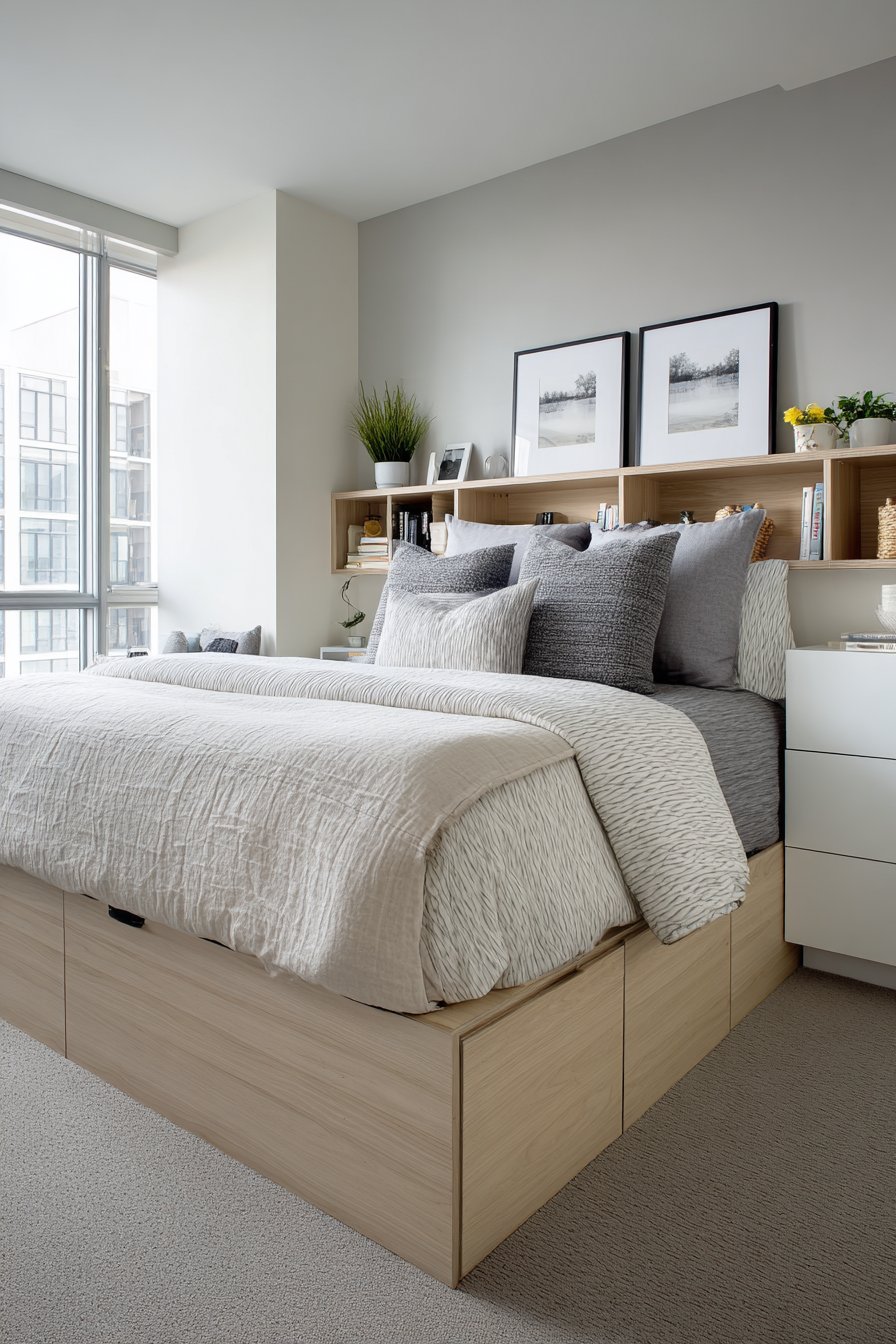 Floating nightstands mounted to the wall beside platform beds complement this tiny bedroom idea perfectly, eliminating the need for bulky bedside tables that consume precious floor space. Wall-mounted reading lamps with adjustable arms provide task lighting without requiring surface space, while the open floor area beneath floating furniture creates an airy feeling that makes the room appear larger. Natural oak or walnut flooring adds warmth and visual interest without competing with the bed’s streamlined design, creating a harmonious balance between functionality and style.