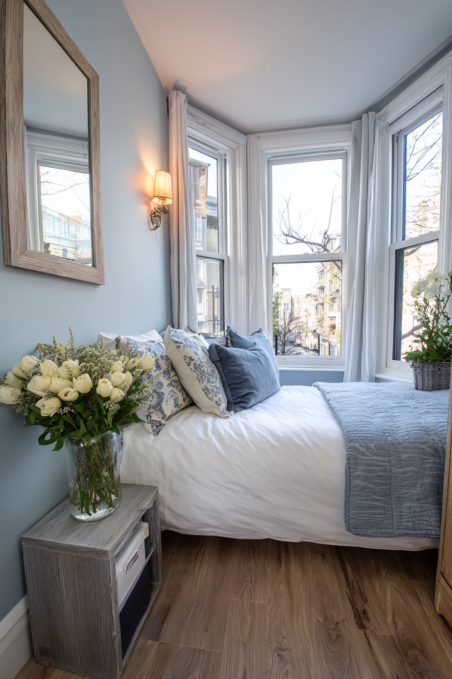 Strategic use of mirrors ranks among the most effective tiny room ideas for bedrooms, and mirrored wardrobe doors serve double duty by providing essential storage while visually doubling the apparent room size. The mirrors reflect natural light from windows and artificial lighting, dramatically brightening the space while creating the illusion of depth. The wardrobe itself features thoughtfully organized interior space with hanging rods, shelving, and possibly drawers that maximize vertical storage capacity. When the mirrored doors are closed, the storage disappears from view while the mirrors continue their space-enhancing work.