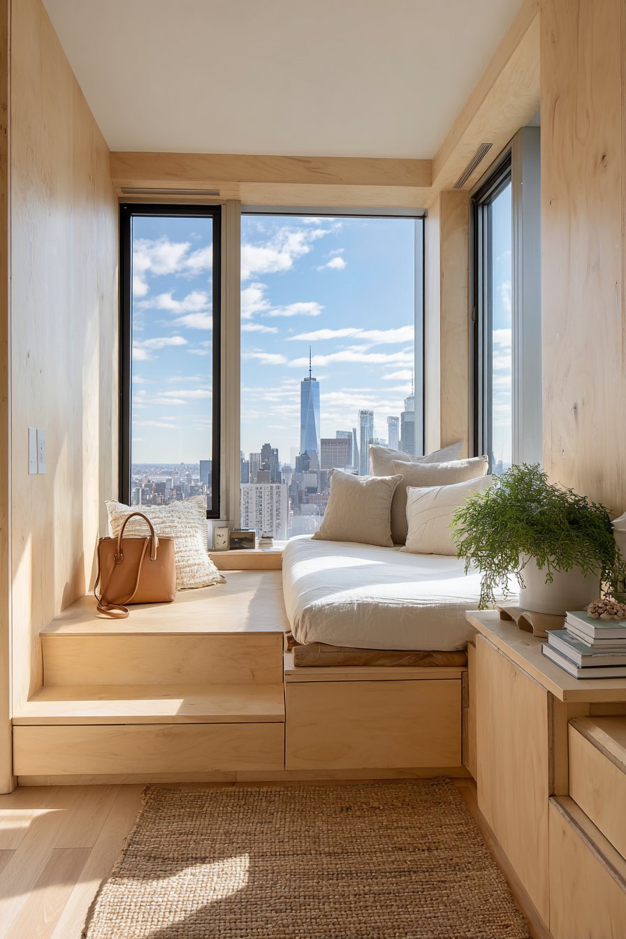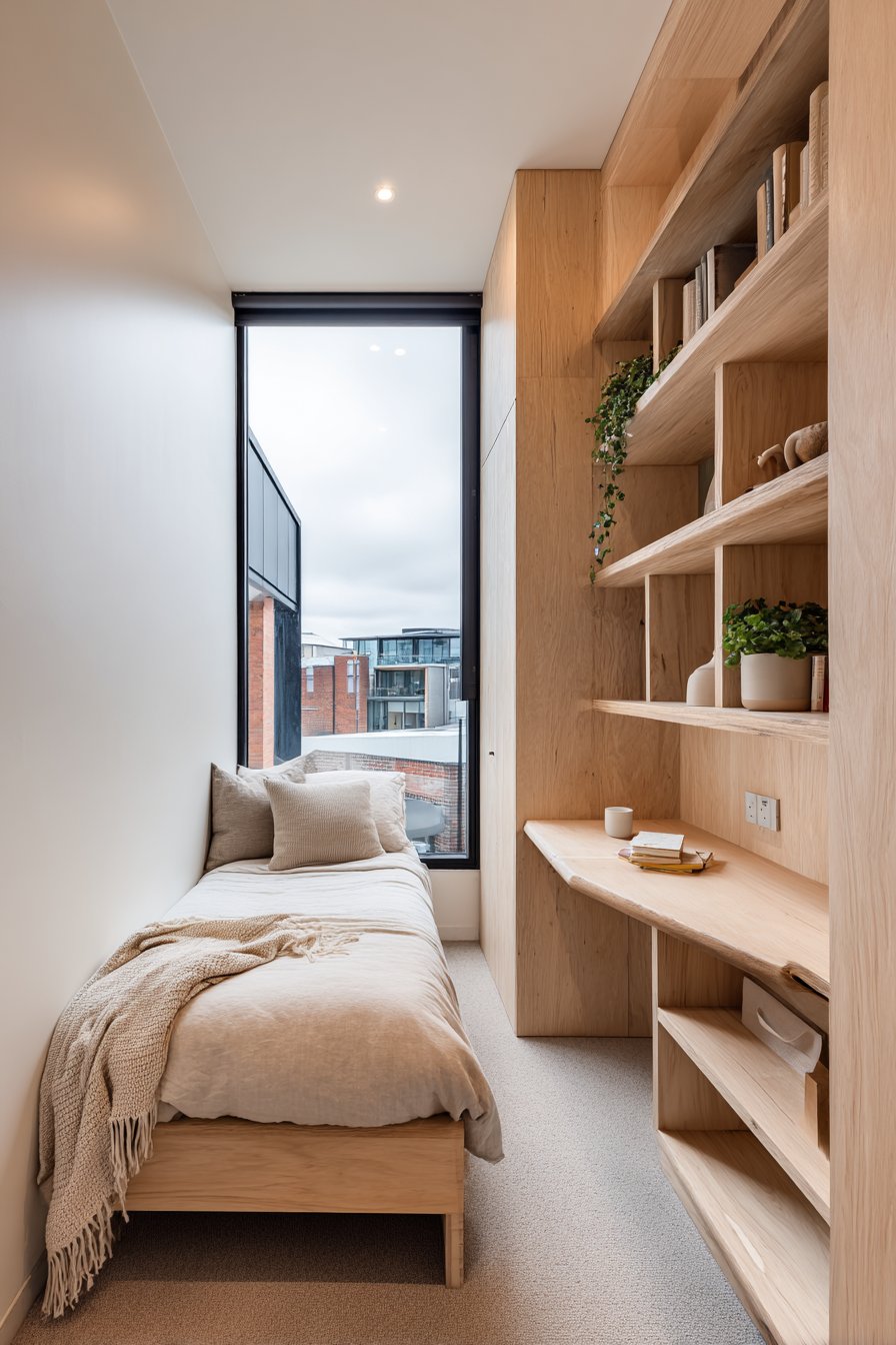 A narrow bed with a simple frame occupies the opposite wall, maintaining adequate circulation space between the bed and window seat. Light hardwood flooring reflects natural light streaming through the window, enhancing the room’s brightness and making it feel more spacious than its dimensions would suggest. The window seat becomes a favorite spot for reading, daydreaming, or simply enjoying natural light, adding significant quality-of-life value that transcends its practical storage function. This integration of form and function exemplifies sophisticated tiny bedroom design.
