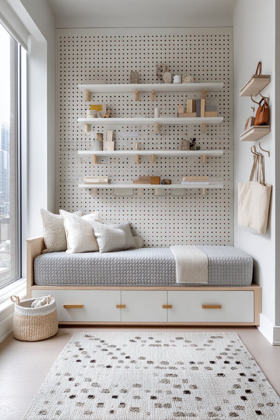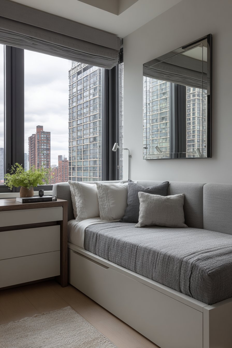 Multifunctional furniture pieces represent essential tiny room ideas for bedrooms, and daybeds with trundle configurations exemplify this principle beautifully. During daytime hours, the daybed functions as a comfortable sofa for reading, working on a laptop, or socializing with friends, dressed with bolster pillows and a fitted cover in light gray linen that emphasizes its dual nature. The clean lines and sofa-like proportions prevent the room from feeling like a bedroom during waking hours, creating psychological separation between sleeping and living spaces—an important consideration in studio apartments or multipurpose rooms.