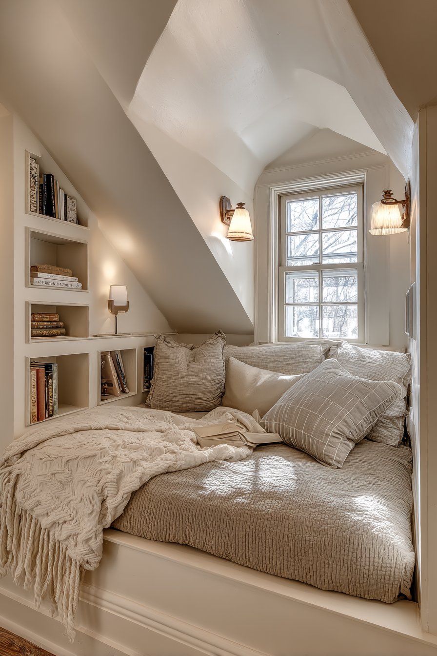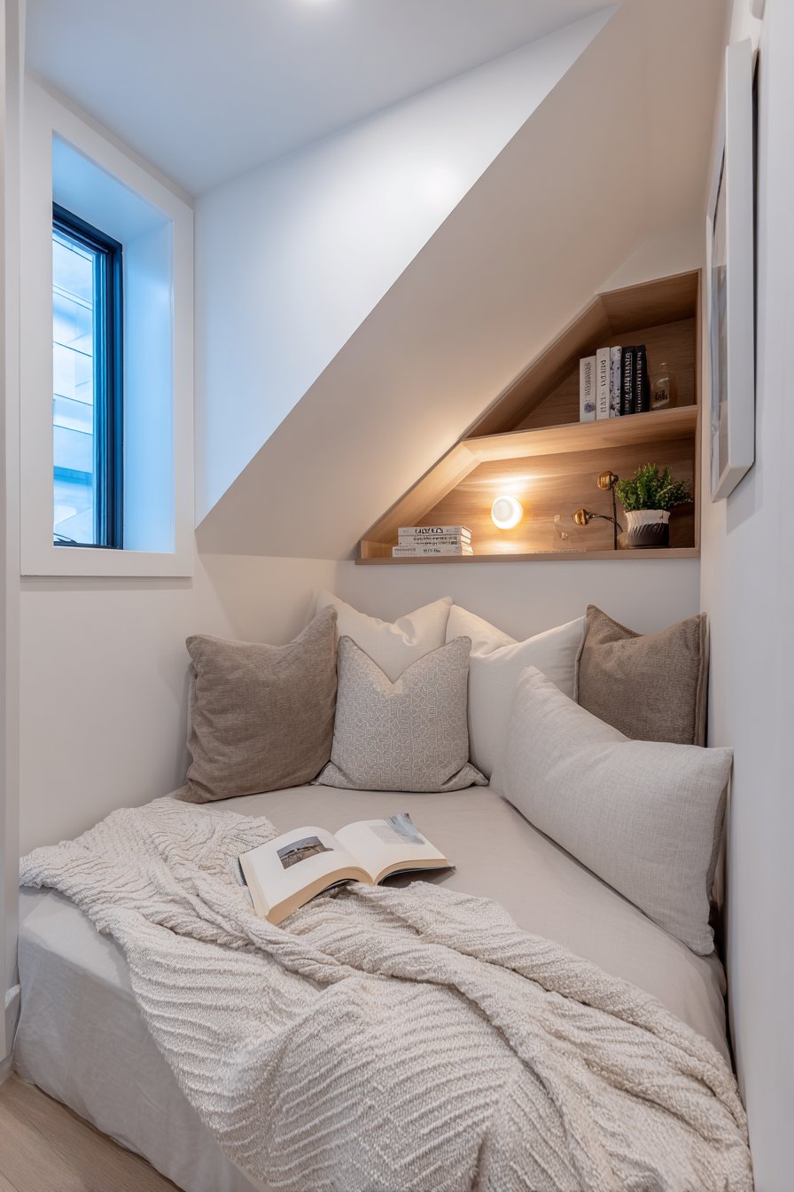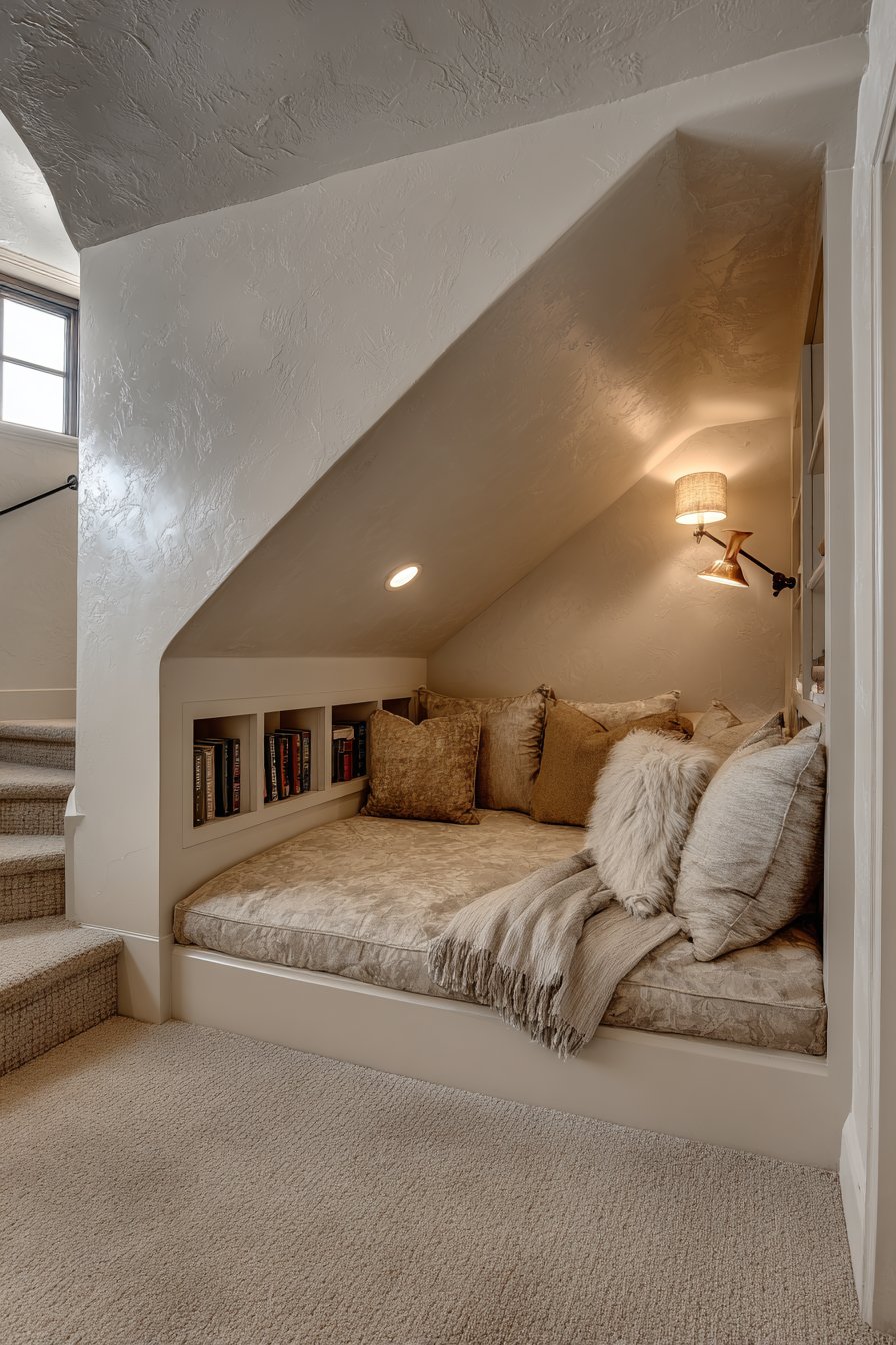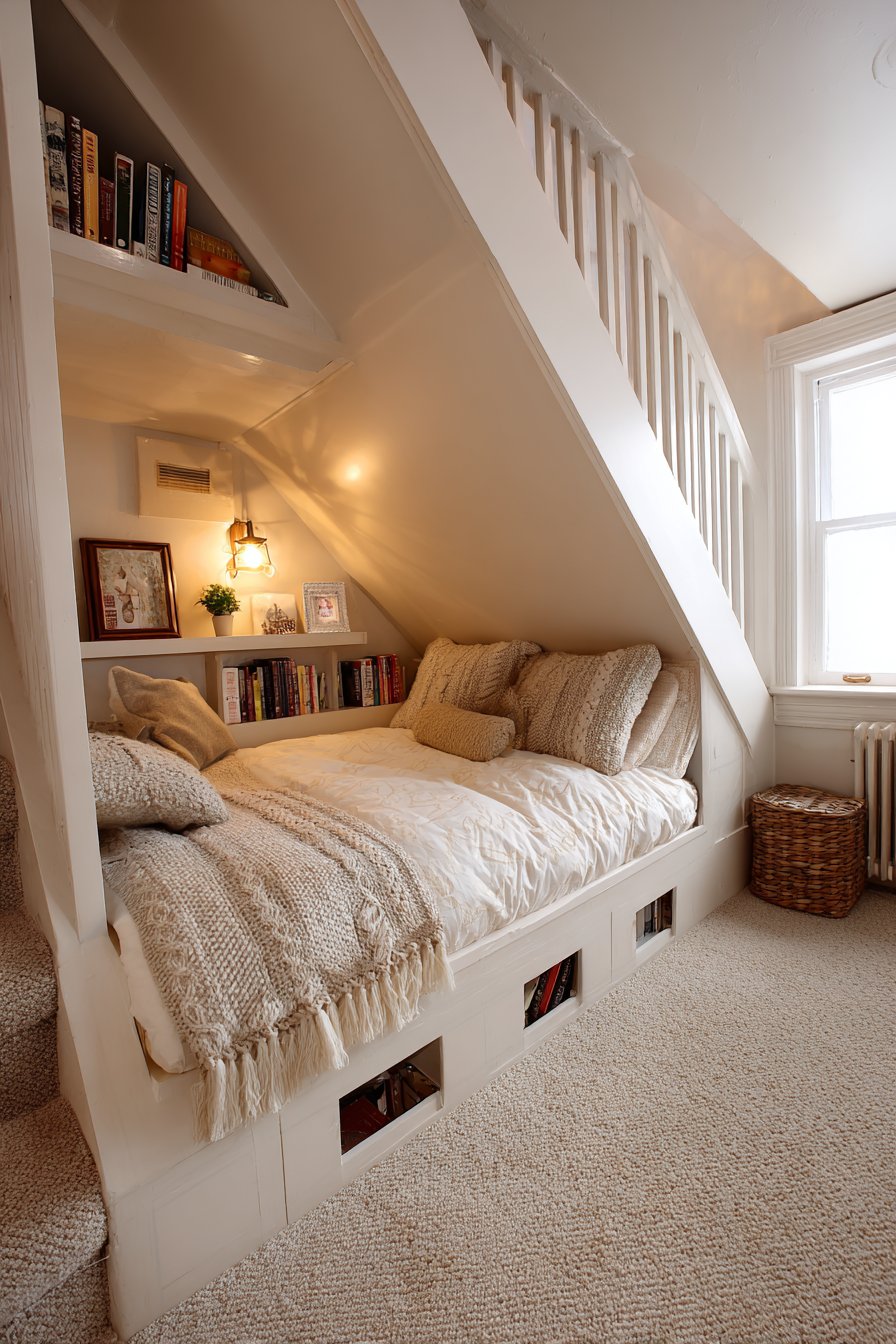 Soft white paint on all surfaces keeps the space feeling open despite its compact dimensions and unconventional angles. The paint color should have warm undertones to prevent the nook from feeling cold or clinical, creating instead a cozy, welcoming atmosphere. Small storage cubbies built into the walls surrounding the sleeping area provide convenient places for books, devices, water bottles, and other bedtime essentials. These built-ins make efficient use of the otherwise awkward spaces created by the stair structure overhead, turning potential dead space into functional storage.
