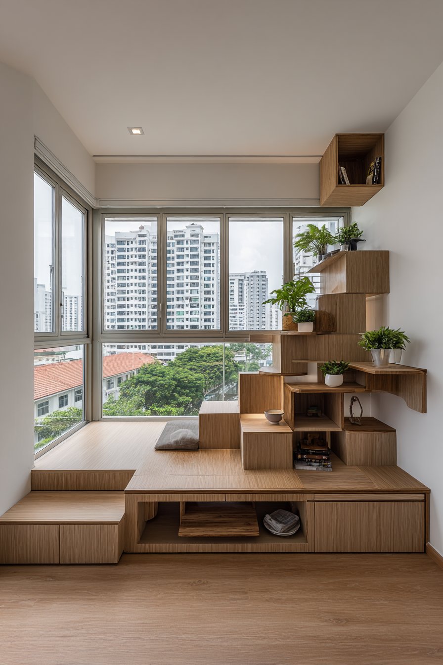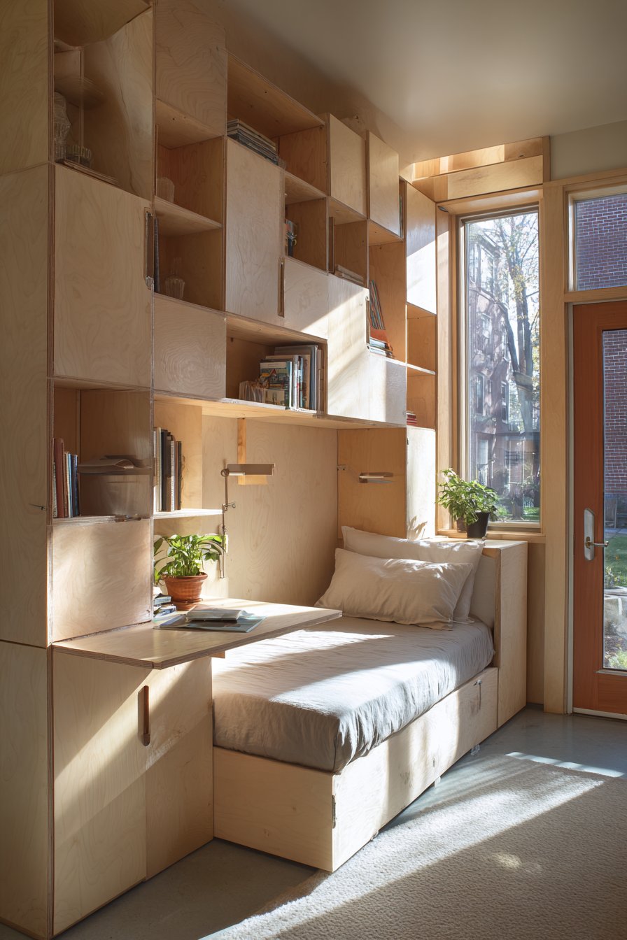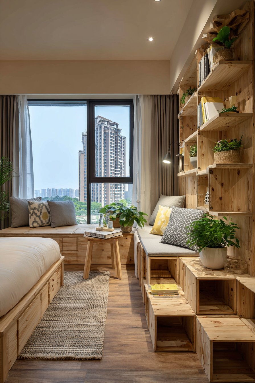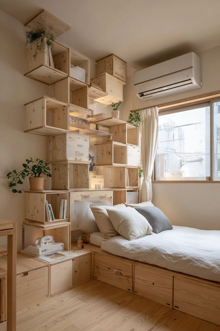 The beauty of modular systems lies in their problem-solving flexibility. Need a higher nightstand? Stack another cube. Require more book storage? Rearrange the configuration. Moving to a new space with different dimensions? The modular pieces adapt to new layouts without waste. This sustainable approach to furnishing tiny bedrooms reduces consumption while maintaining high functionality, and the natural wood finish brings warmth and organic texture that prevents the space from feeling cold or institutional despite its practical focus.
