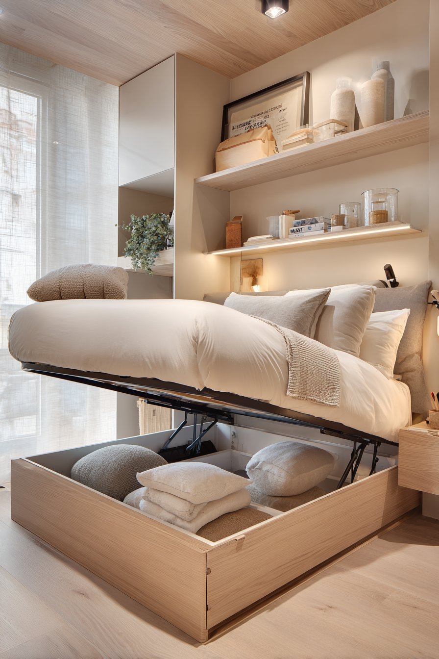 Innovation in furniture design yields impressive tiny room ideas for bedrooms, and hydraulic lift beds represent cutting-edge space optimization. These beds feature a gas-piston system that allows the entire mattress platform to lift upward, revealing substantial storage space underneath for seasonal items, extra bedding, luggage, or bulky belongings that don’t require frequent access. The hydraulic mechanism makes lifting even a loaded bed platform effortless for a single person, and safety features prevent unexpected lowering. This design provides storage capacity equivalent to several large dressers while consuming only the bed’s footprint.