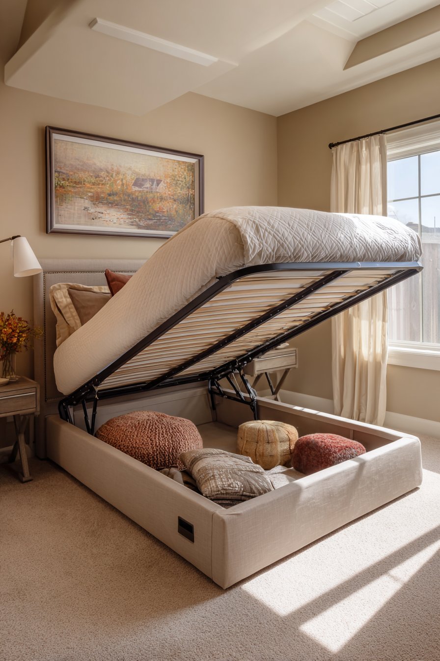 Professional interior photography would capture this innovative storage solution with natural lighting that emphasizes the mechanical functionality while maintaining the bedroom’s inviting character. The space-saving benefits are dramatic—all the storage capacity of traditional under-bed drawers without protruding hardware, handles, or tracking systems. The smooth lifting motion and the surprise of substantial hidden storage create an almost magical quality, transforming what appears to be a simple platform bed into a storage powerhouse for tiny bedrooms.