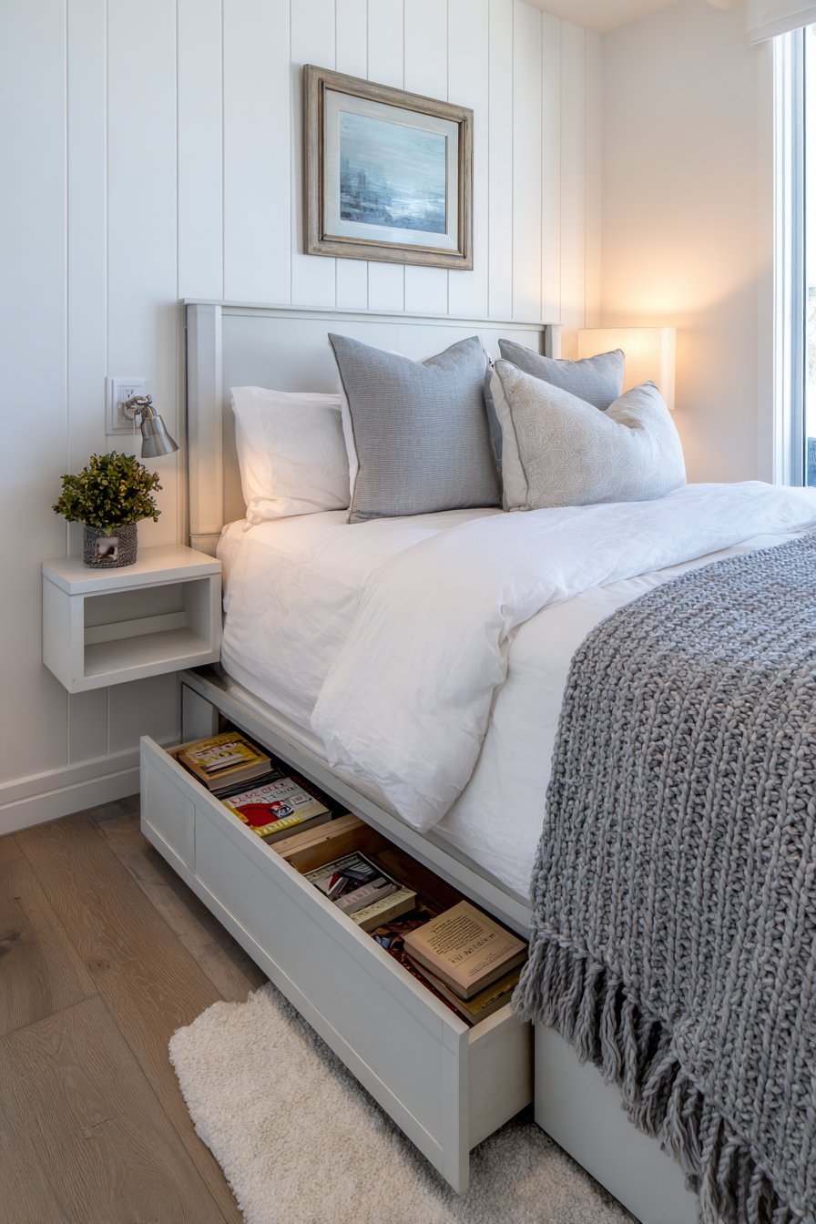 Embracing minimalism offers powerful tiny room ideas for bedrooms, proving that less truly can be more when space is limited. This approach features a simple bed frame elevated just enough to accommodate storage boxes underneath, dressed in neutral bedding that creates a calm, uncluttered aesthetic. The under-bed storage boxes in natural canvas or woven materials maintain the minimalist visual while providing essential storage for off-season clothing, extra linens, or items used infrequently. The key to this design’s success lies in its restraint—every item serves a purpose, and nothing extraneous clutters the space.