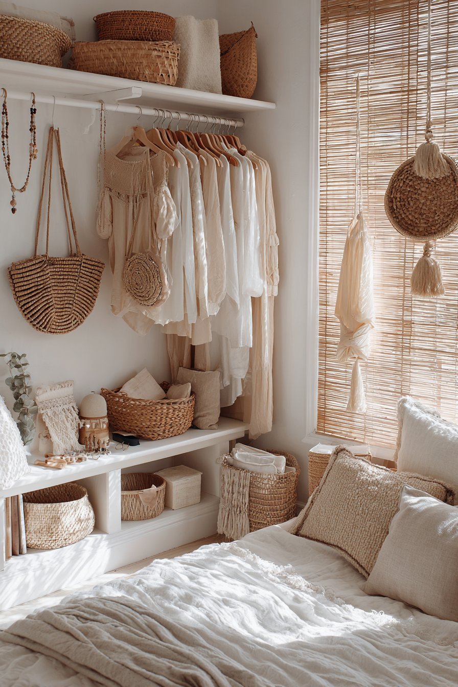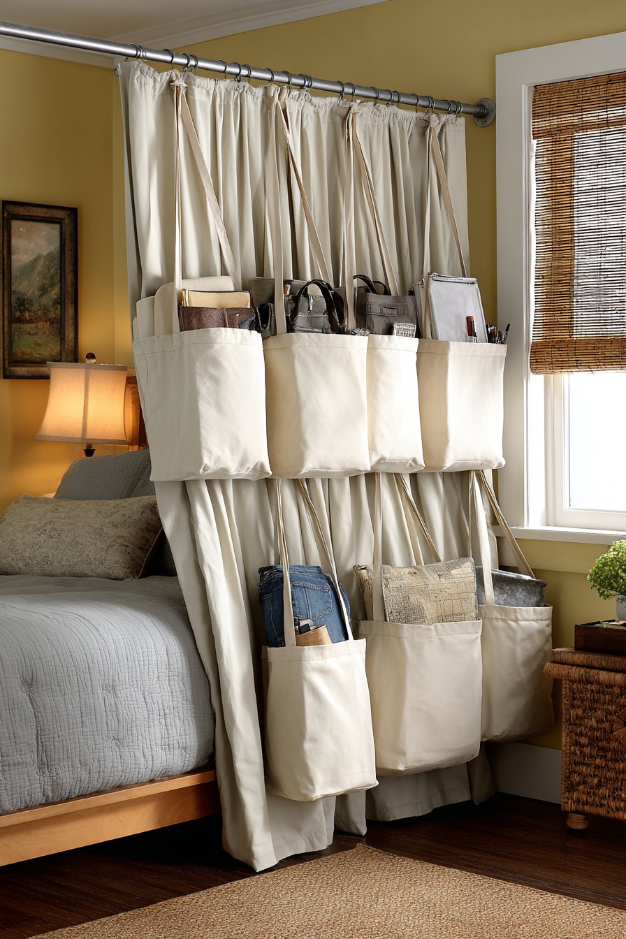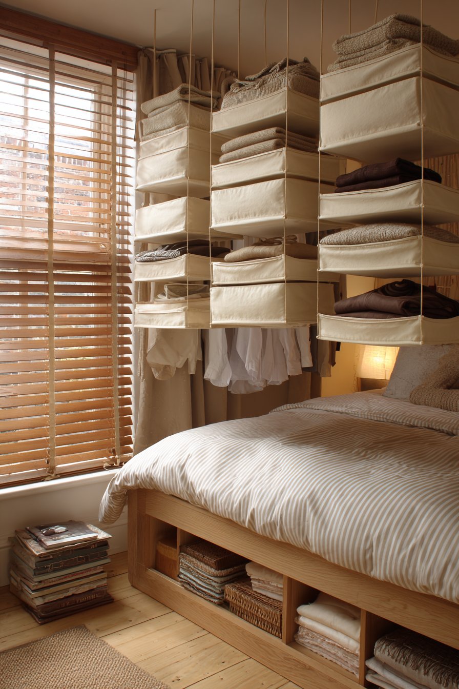 A simple bed frame with minimal design occupies the floor space below the hanging storage, demonstrating how vertical layering creates storage capacity in three-dimensional space rather than just horizontal surface area. Natural light filtering through bamboo blinds creates striped shadow patterns that add visual interest to the otherwise simple room. The bamboo blinds’ warm tones complement the canvas organizers, creating a cohesive natural material palette that feels organic and calming.