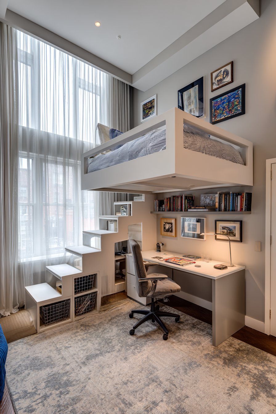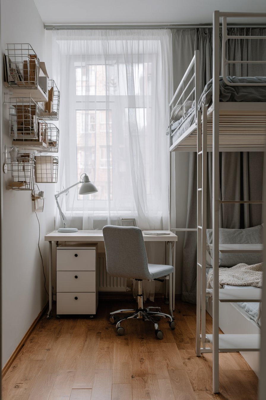 Natural light from windows becomes especially important in loft bed configurations, as the elevated sleeping area can sometimes feel enclosed. Sheer white curtains filter harsh sunlight while maintaining brightness throughout the day, and the study area benefits from this natural illumination for reading and computer work. The desk’s integrated task lighting supplements natural light during evening hours or on overcast days, ensuring the workspace remains functional regardless of ambient conditions. This thoughtful approach to lighting prevents the loft area from feeling cave-like while maintaining the study zone’s productivity.