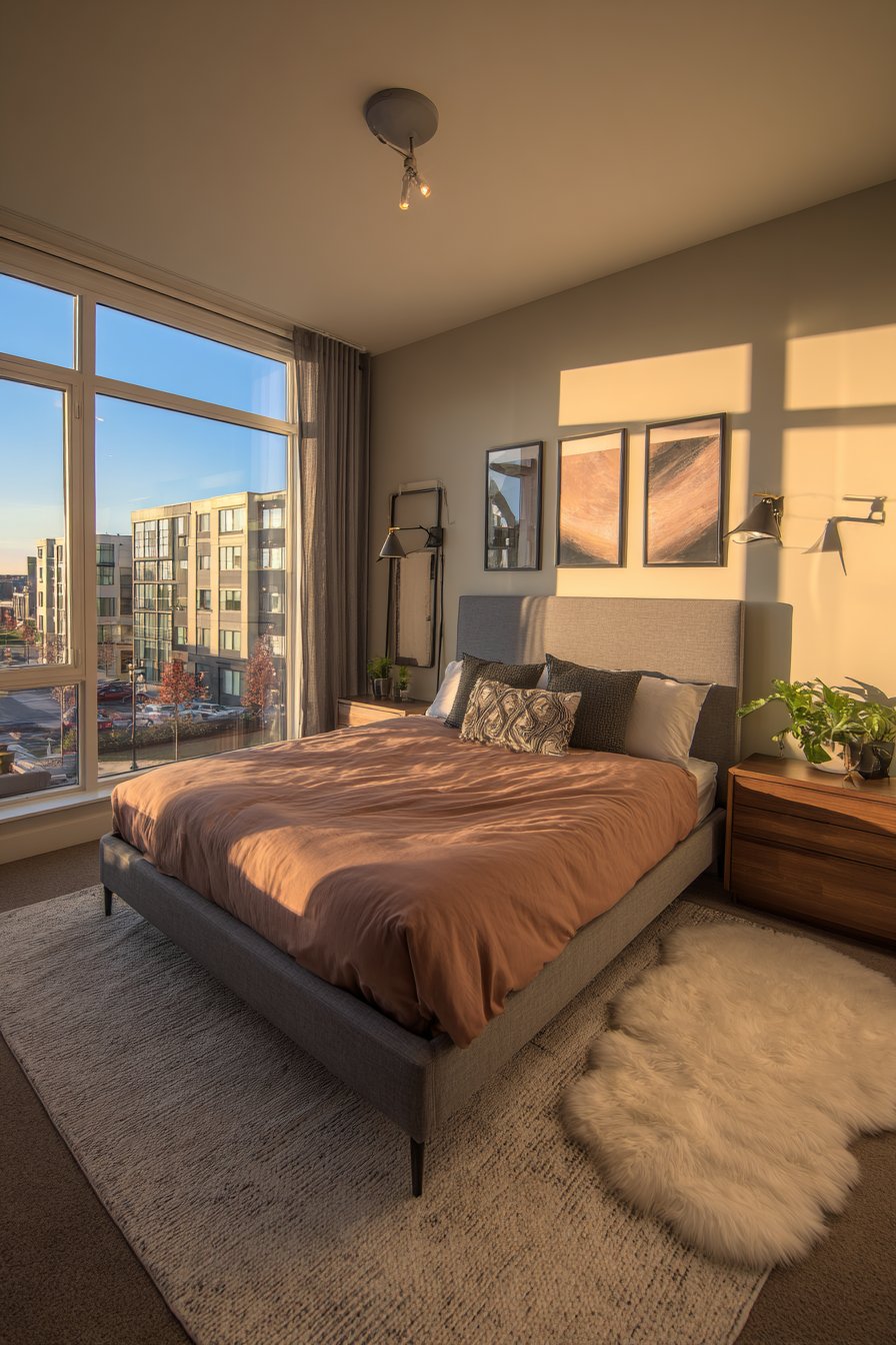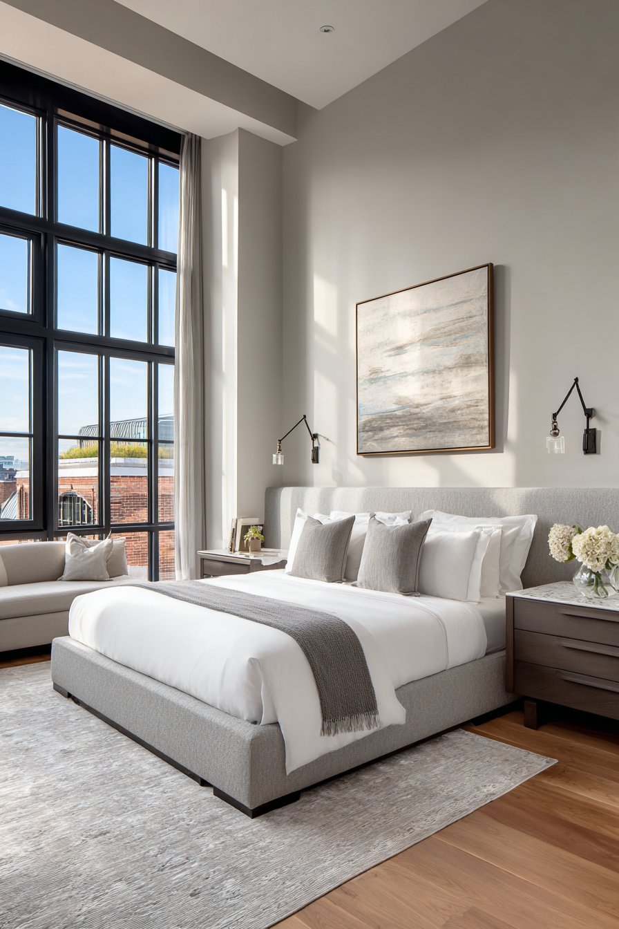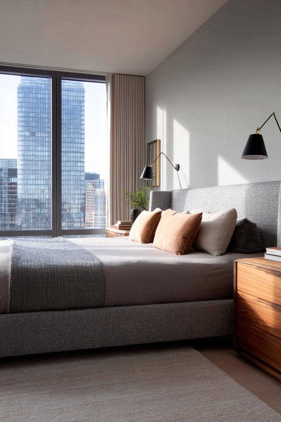 A low-profile upholstered headboard in soft gray fabric provides comfort for sitting up in bed while reading or using a laptop, without adding visual bulk that might make the corner feel cramped. The upholstered surface also prevents cold walls from being uncomfortable during winter months. Wall-mounted swing-arm reading lights positioned on both adjacent walls eliminate the need for nightstands and table lamps, freeing up valuable floor space while providing adjustable, directed lighting exactly where needed. These articulating fixtures can be swung close to the wall when not in use, maintaining the room’s streamlined appearance.