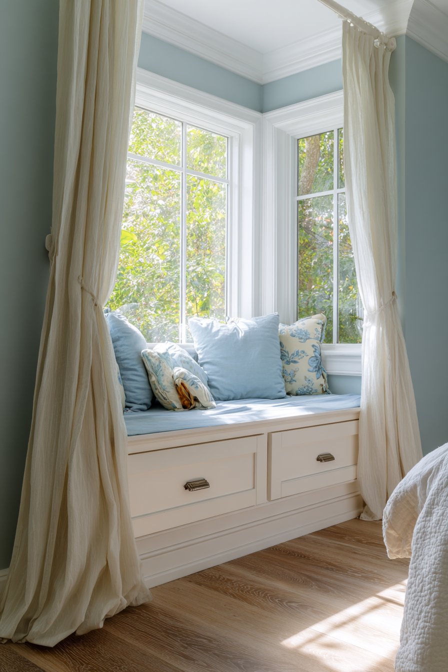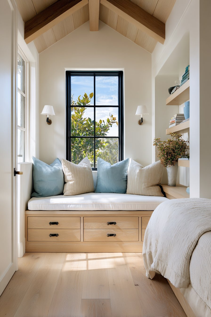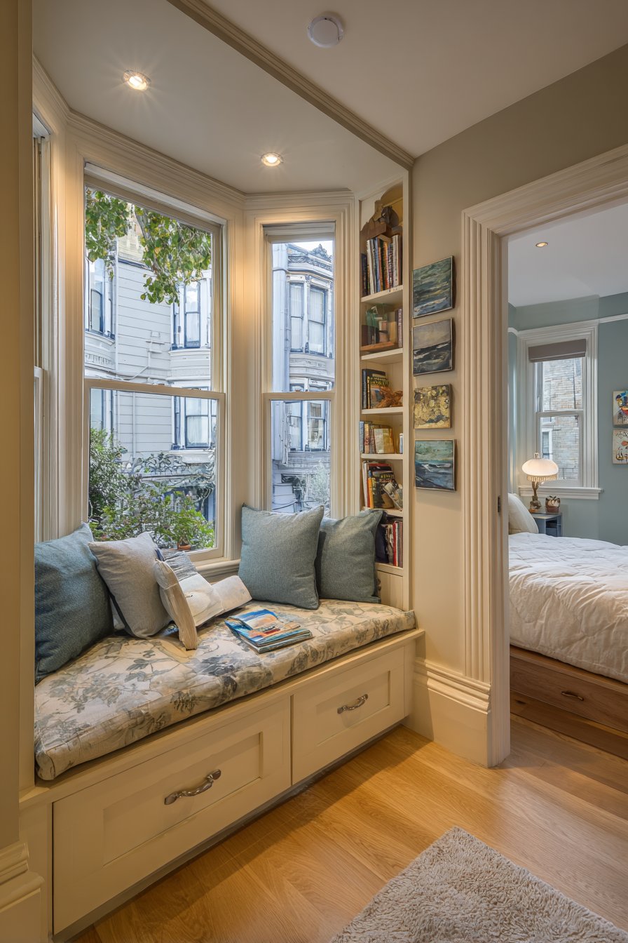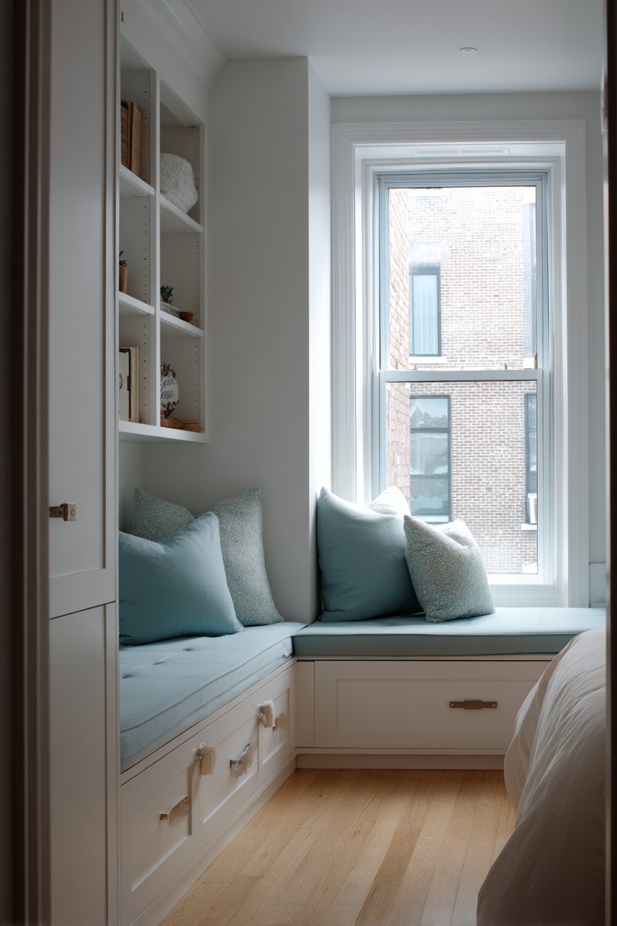 Capitalizing on architectural features presents excellent tiny room ideas for bedrooms, and built-in window seats exemplify how to transform underutilized spaces into functional design elements. This approach incorporates storage drawers beneath a cushioned window seat, creating a cozy reading nook while providing valuable storage capacity that doesn’t consume additional floor space. The window seat typically spans the full width of the window, with custom-built cabinetry that matches the room’s trim work and creates a polished, intentional appearance rather than looking like an afterthought.