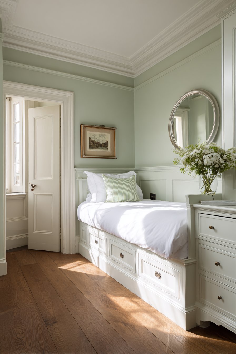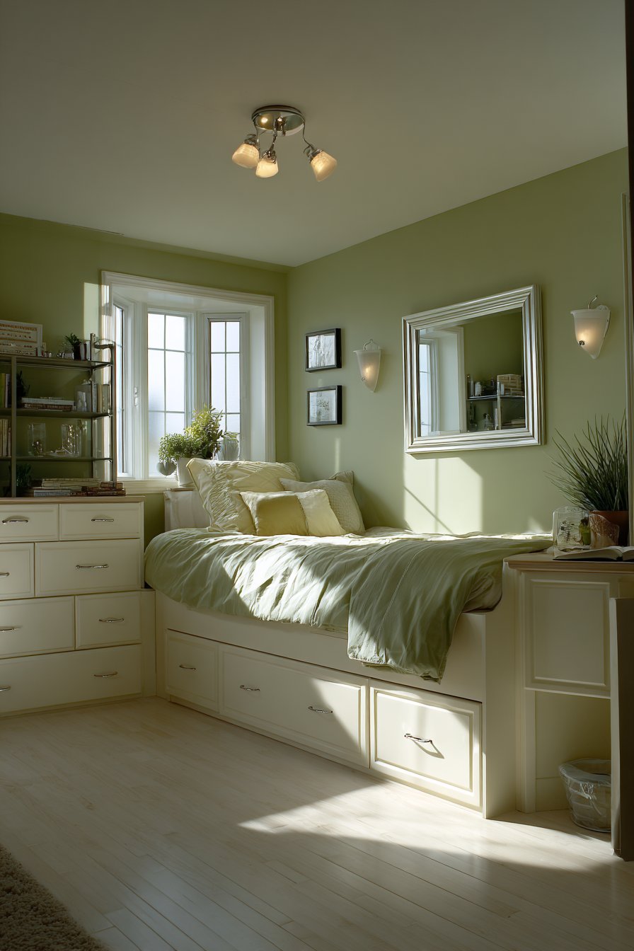 The bed’s central positioning with sufficient clearance on both sides creates a balanced, symmetrical layout that feels intentional and well-planned. Walls painted in pale sage green create a calming atmosphere that promotes rest and relaxation while maintaining a sense of spaciousness. The color choice reflects current design trends favoring nature-inspired hues that create psychological comfort without overwhelming small spaces. A single wall-mounted mirror above a small dresser (for items requiring a flat surface, like jewelry boxes or perfumes) enhances the sense of space by reflecting natural light throughout the room.