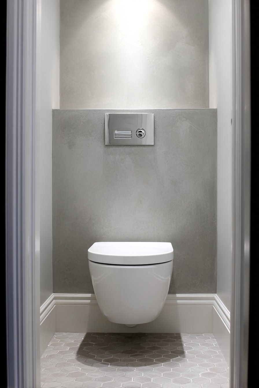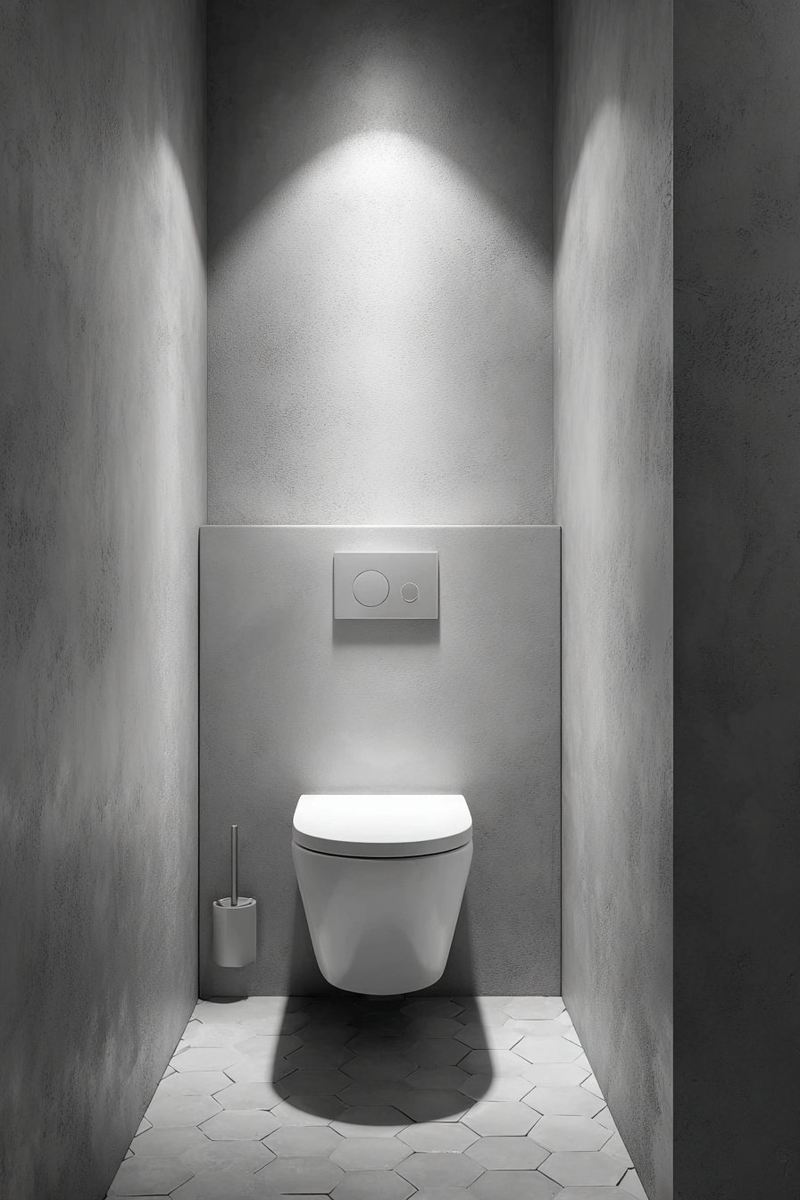 The contemporary minimalist approach to toilet design emphasizes clean lines, uncluttered spaces, and seamless integration of fixtures into the overall bathroom aesthetic. A wall-mounted toilet with a concealed cistern system represents the pinnacle of minimalist design philosophy, creating a floating effect that not only looks striking but also simplifies floor cleaning and maintenance. The compact powder room setting features light grey textured walls that add subtle visual interest without overwhelming the space, while hexagonal floor tiles introduce geometric pattern in a sophisticated, understated manner.