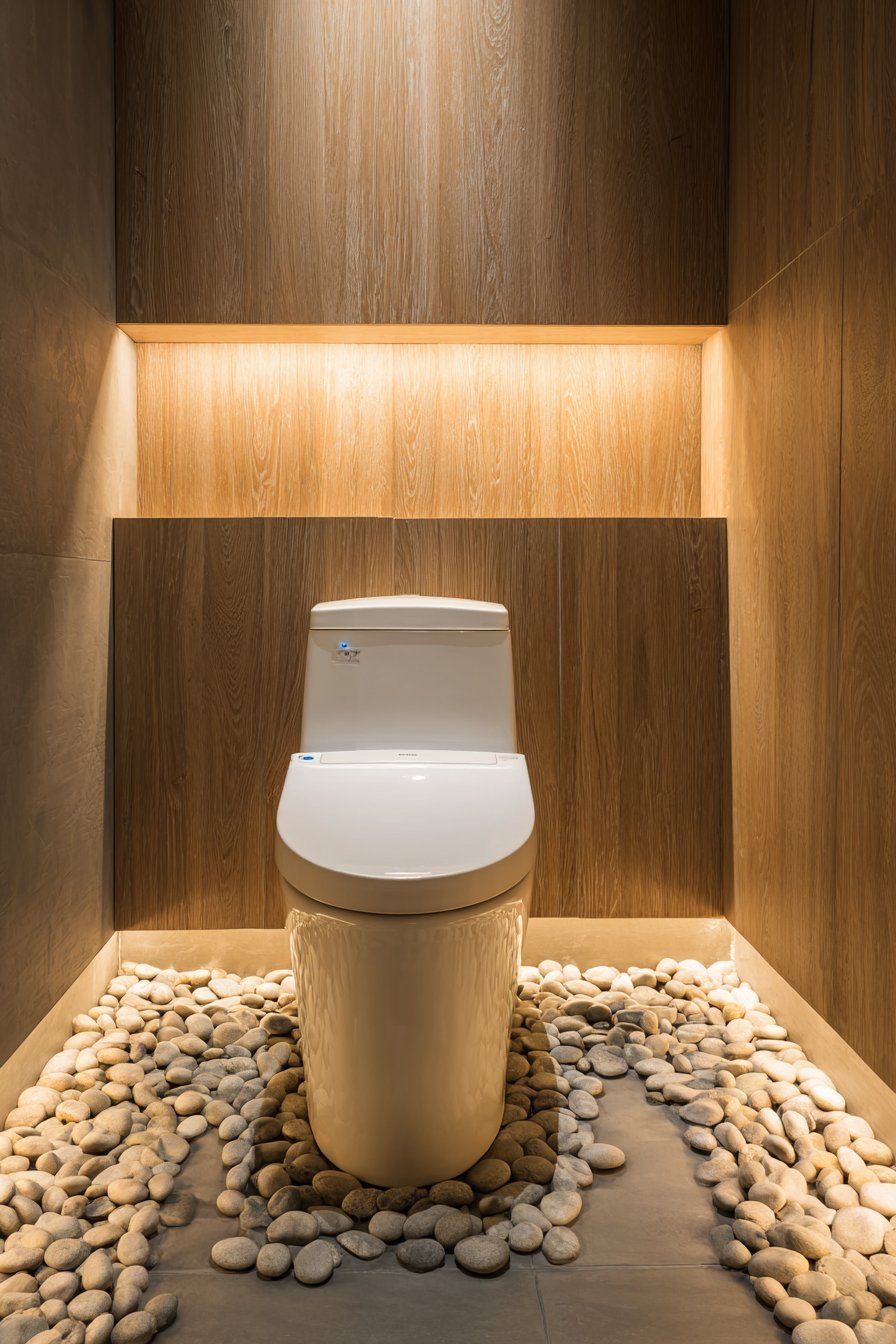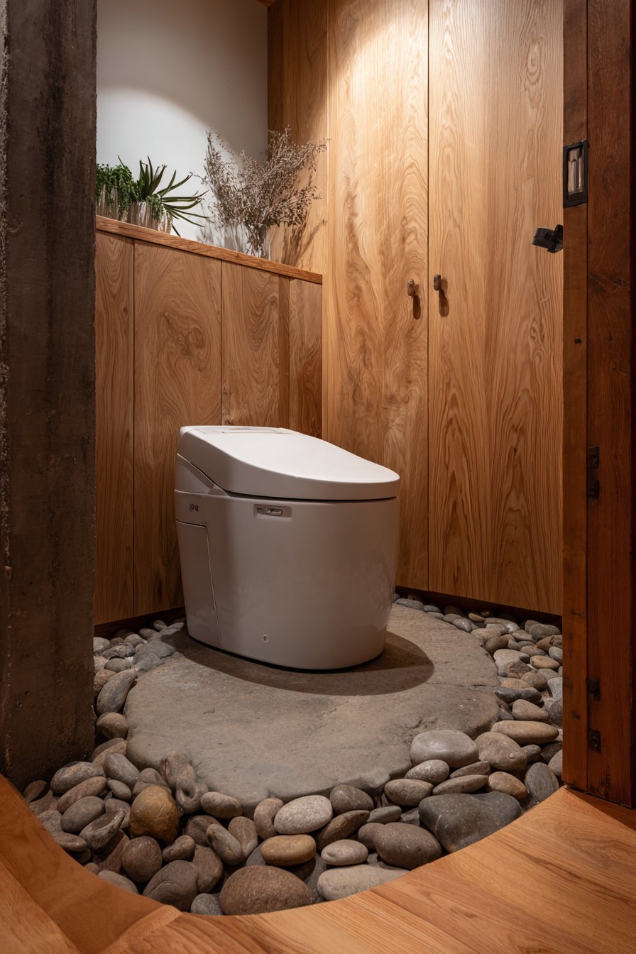 River rock floor border adds organic texture and creates a subtle threshold that defines the toilet area while maintaining visual flow with the broader bathroom space. These natural stones, smoothed by water over countless years, bring a sense of geological time and natural processes into the human-scaled space, grounding the design in the natural world. Soft diffused lighting creates a peaceful ambiance free from harsh shadows or glare, supporting the meditative quality essential to zen-inspired design.