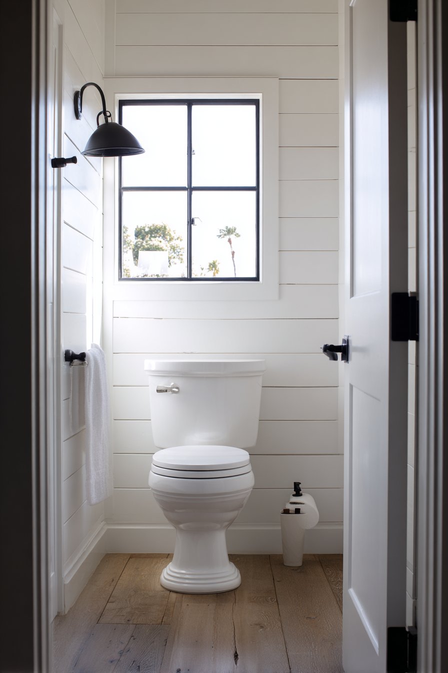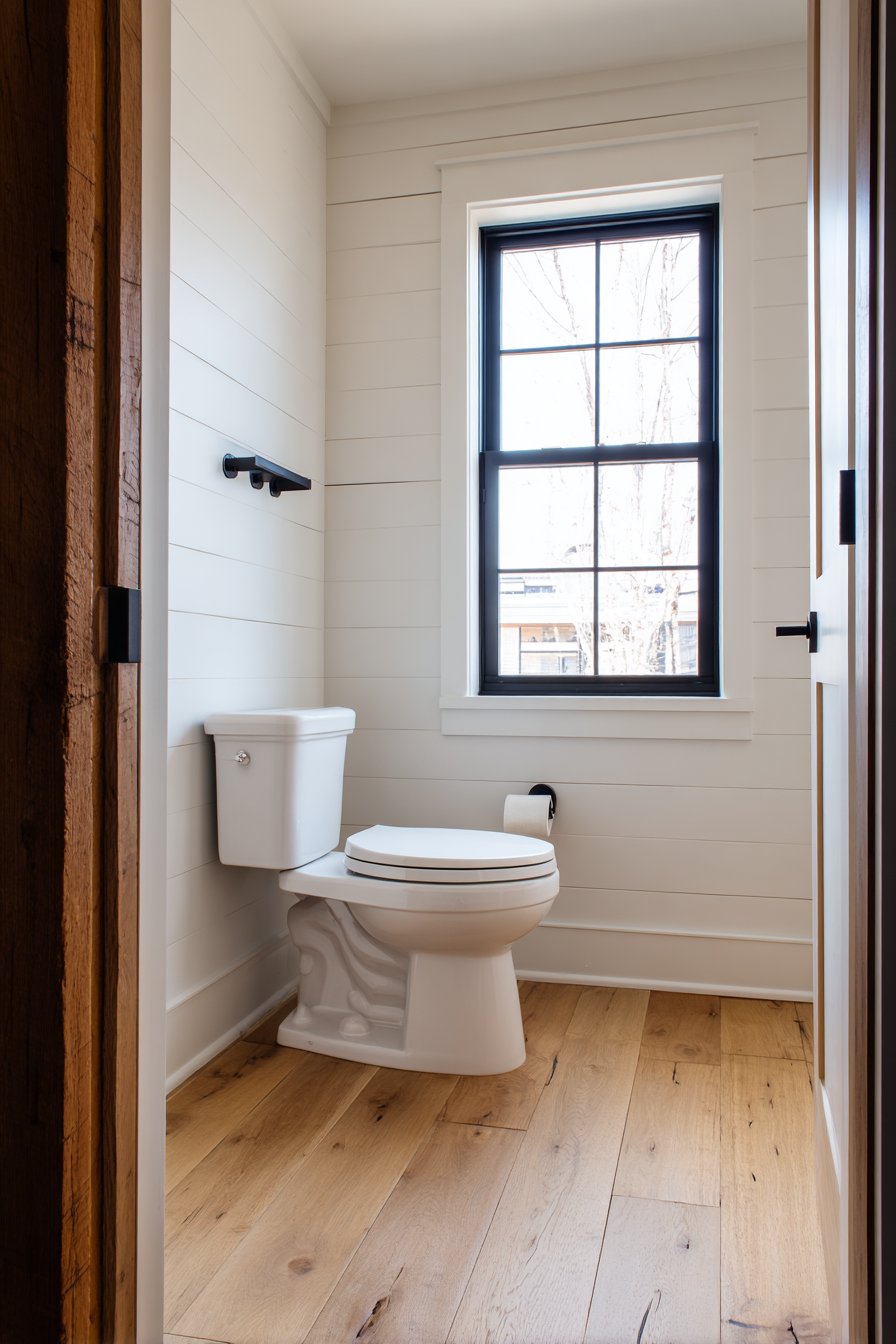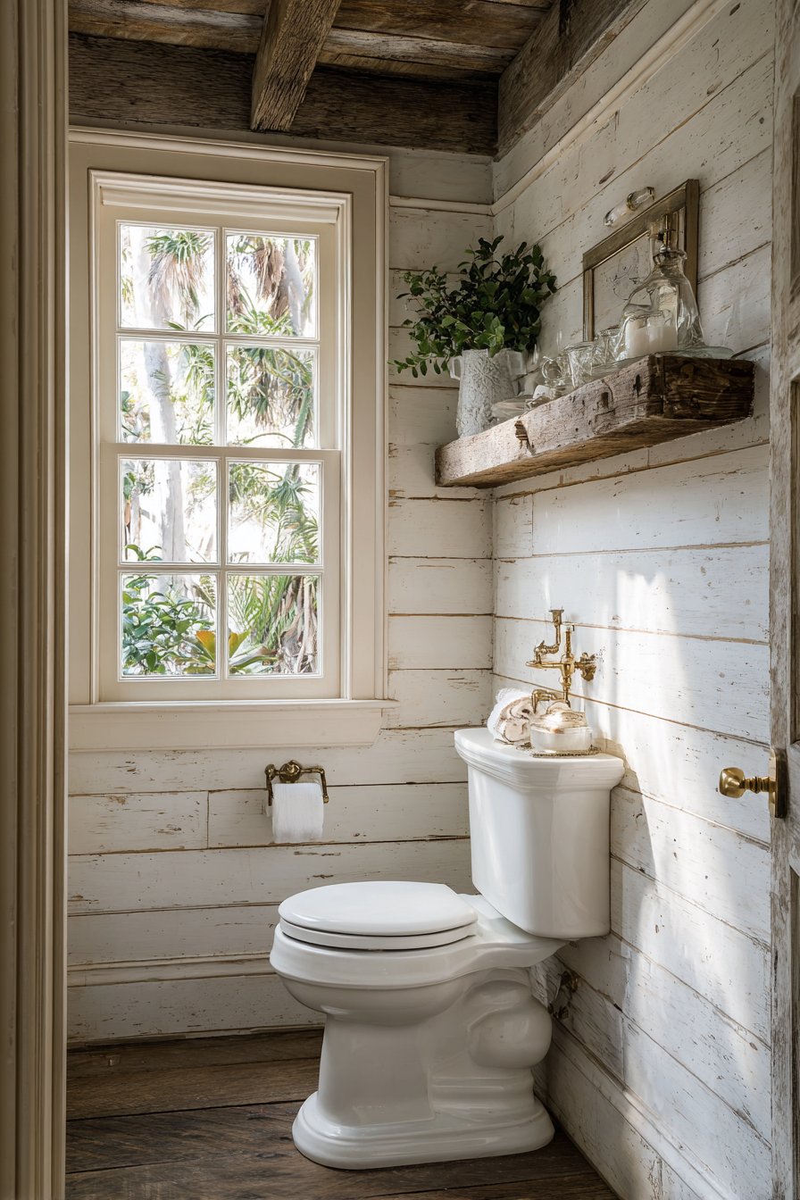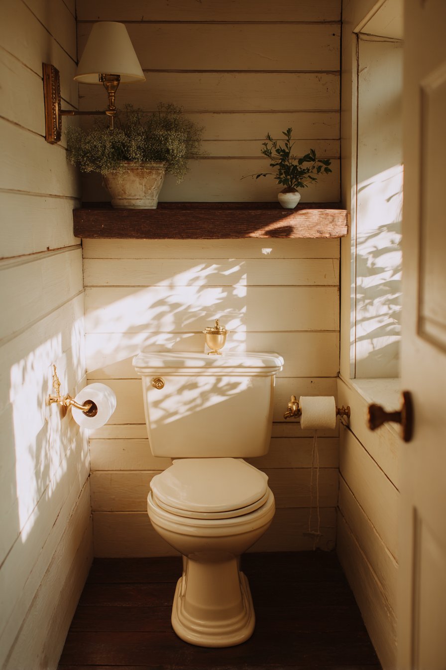 The rustic farmhouse toilet design celebrates traditional aesthetics and timeless materials, creating spaces that feel warm, welcoming, and full of character. A traditional two-piece toilet in classic white serves as the centerpiece, its familiar form providing comfort through its very conventionality. Shiplap walls painted in soft cream create the quintessential farmhouse backdrop, their horizontal lines adding visual rhythm while evoking rural American architecture. Vintage-style brass toilet paper holder and pull-chain flush mechanisms aren’t merely decorative choices—they’re authentic period details that reinforce the historical aesthetic.