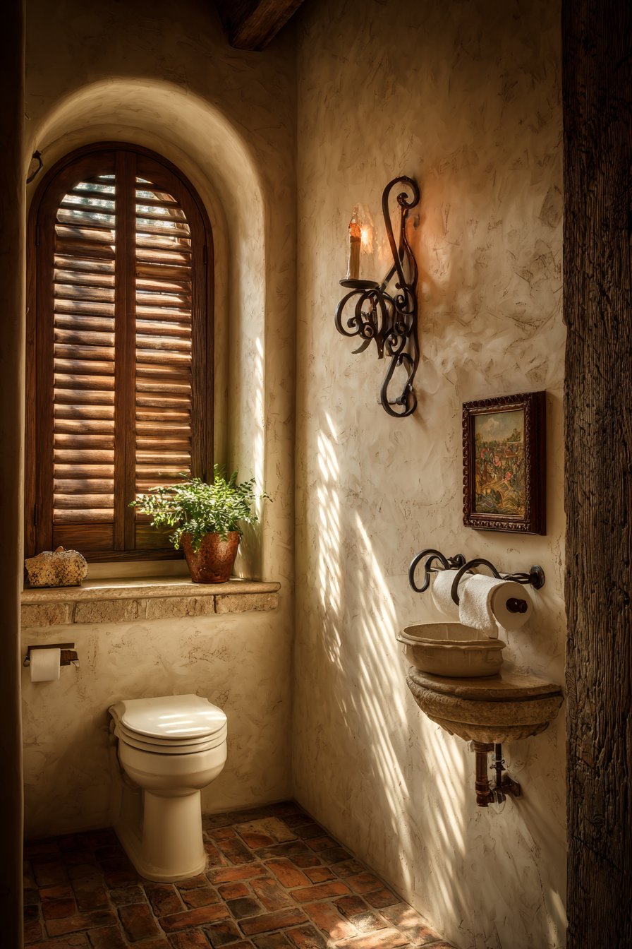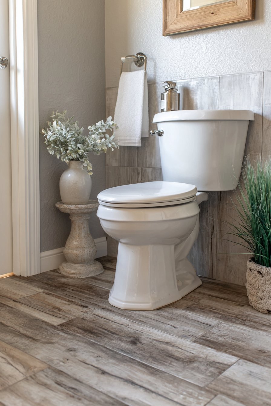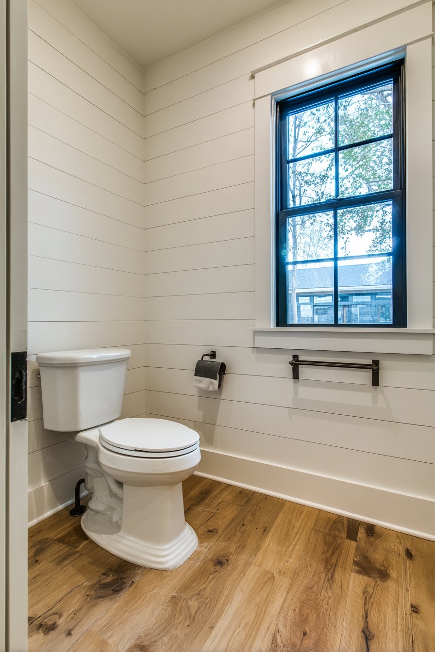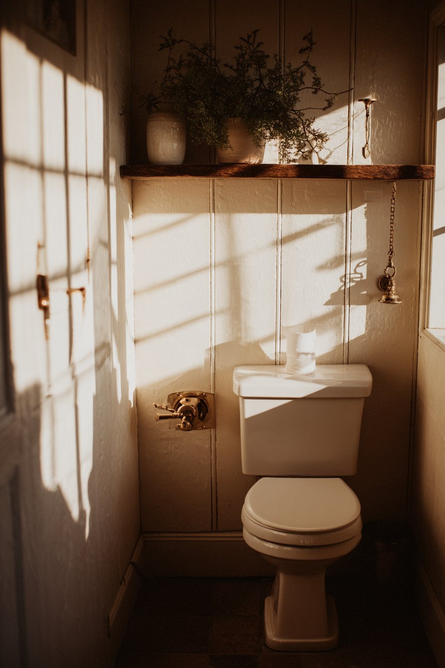 The rustic farmhouse toilet design celebrates traditional aesthetics and timeless materials, creating spaces that feel warm, welcoming, and full of character. A traditional two-piece toilet in classic white serves as the centerpiece, its familiar form providing comfort through its very conventionality. Shiplap walls painted in soft cream create the quintessential farmhouse backdrop, their horizontal lines adding visual rhythm while evoking rural American architecture. Vintage-style brass toilet paper holder and pull-chain flush mechanisms aren’t merely decorative choices—they’re authentic period details that reinforce the historical aesthetic.