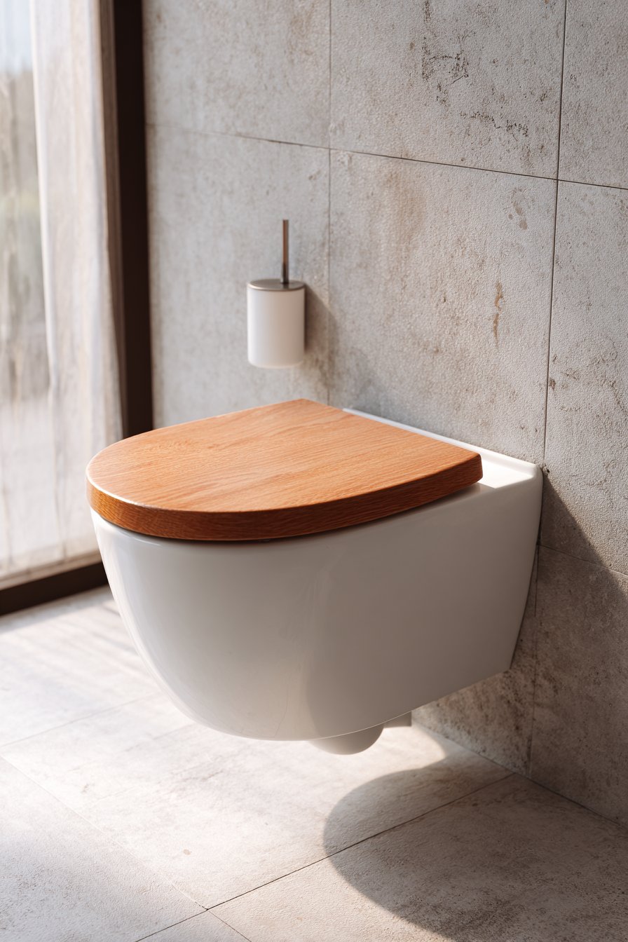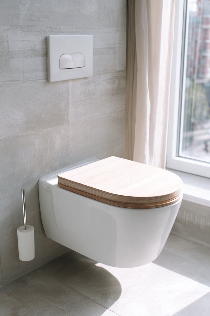 The Scandinavian toilet design embodies the Nordic philosophy of functional beauty, where every element serves a purpose while contributing to an atmosphere of calm simplicity. A wall-mounted toilet in matte white provides the clean, floating aesthetic characteristic of Scandinavian design, while an oak wood toilet seat introduces natural warmth that prevents the space from feeling cold or clinical. Light grey concrete-look tiles covering walls and floors create a neutral backdrop that highlights the beauty of natural materials and allows light to become a primary design element.