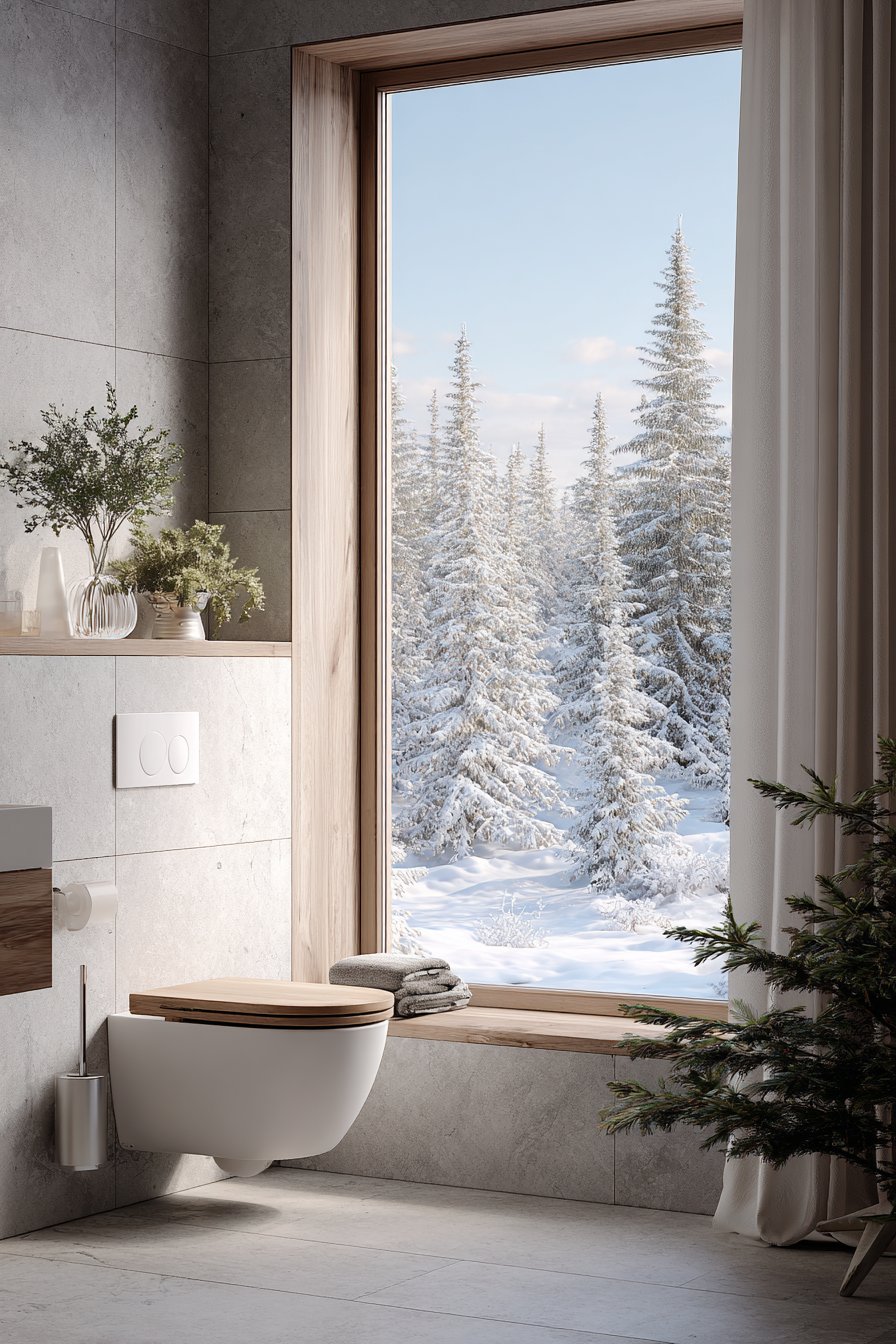 Minimalist accessories—a white toilet brush holder and simple toilet paper dispenser—maintain the clean aesthetic without adding visual clutter or unnecessary decoration. The restraint demonstrated in these choices reflects the Scandinavian principle that the most beautiful spaces often contain the fewest objects, each selected with care and intention. A large window with sheer curtain floods the space with natural Nordic light, that particular quality of brightness that characterizes northern latitudes and that Scandinavian design works so hard to maximize and celebrate.