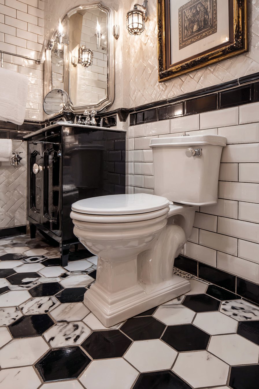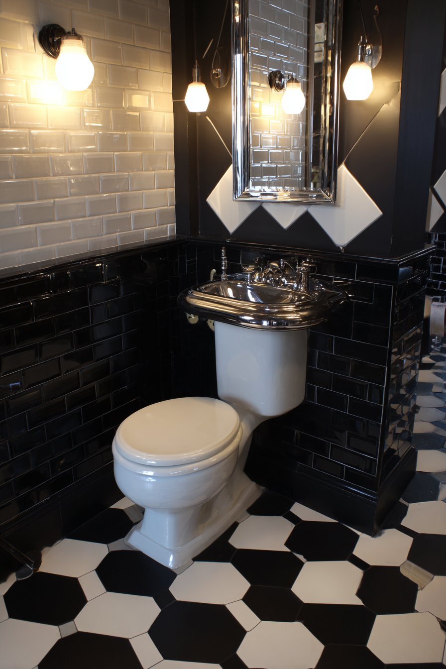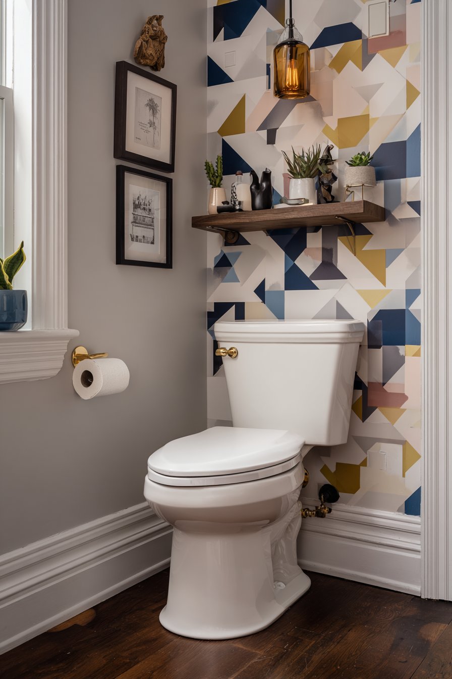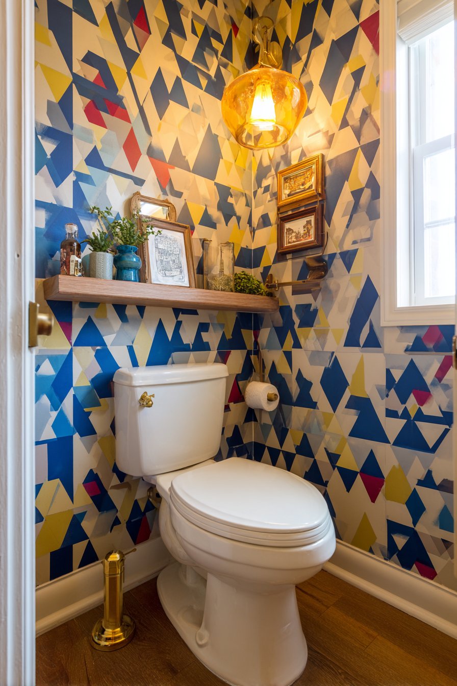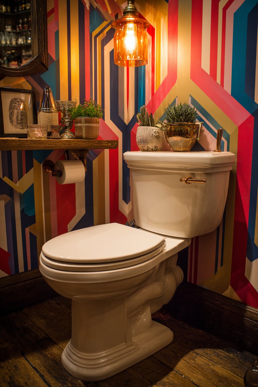 The colorful eclectic toilet design celebrates personality, creativity, and artistic confidence, creating a powder room that functions as a gallery space as much as a functional bathroom. A standard white toilet provides a neutral anchor in an otherwise exuberant space, allowing the surrounding design elements to take center stage. Bold geometric wallpaper in navy and gold transforms walls into art pieces, its pattern and color creating immediate visual impact and establishing the room’s distinctive character. The combination of deep navy and metallic gold evokes both Art Deco glamour and contemporary graphic design.