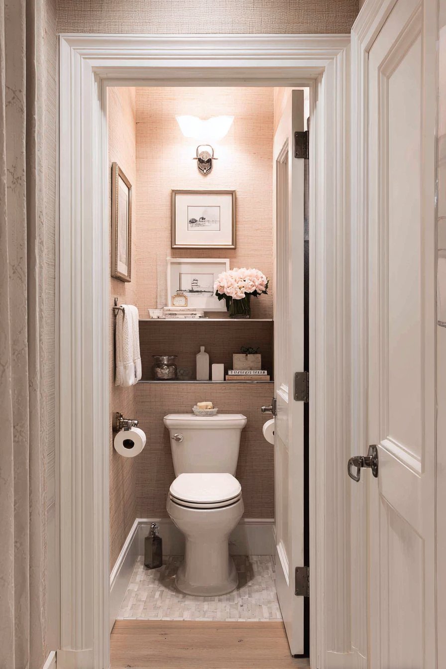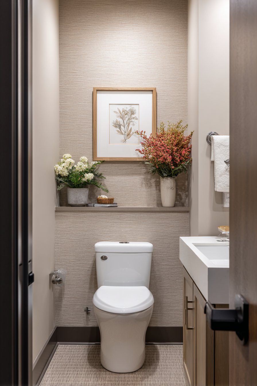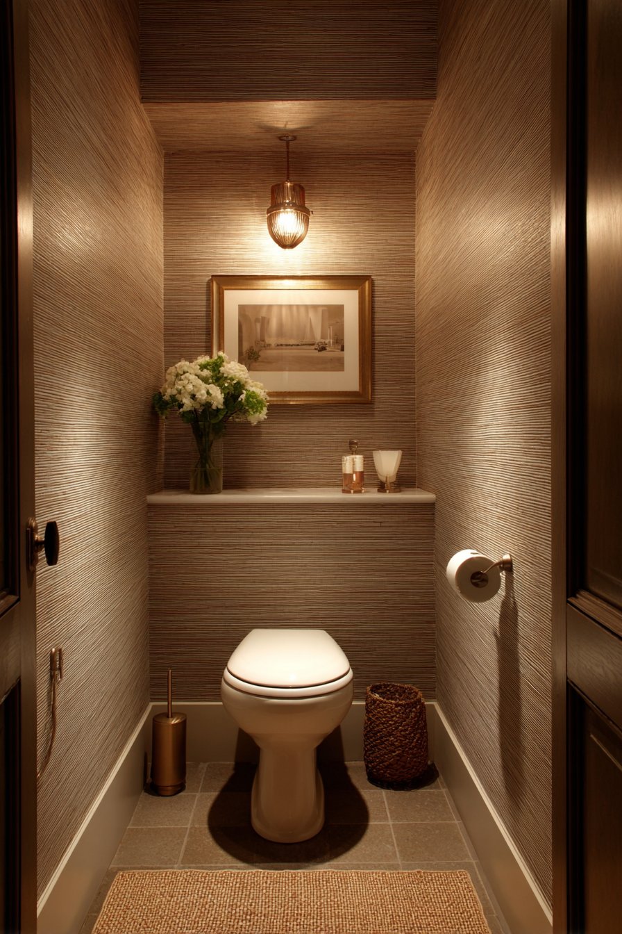 The guest bathroom toilet design creates spaces that make visitors feel comfortable, valued, and welcome. A compact elongated toilet with soft-close seat provides modern comfort while maintaining an appropriately modest footprint for secondary bathrooms. Grasscloth wallpaper in natural beige introduces organic texture and warmth, creating a sophisticated backdrop that feels both luxurious and approachable. Polished nickel fixtures add refined touch without excessive formality, their warm metallic tone creating a welcoming glow.