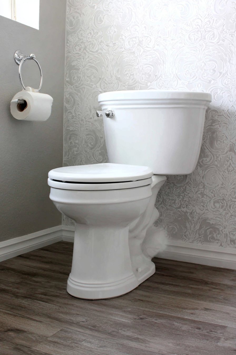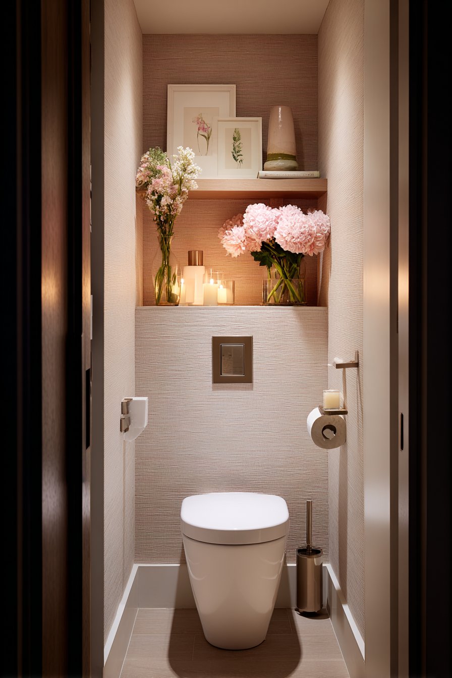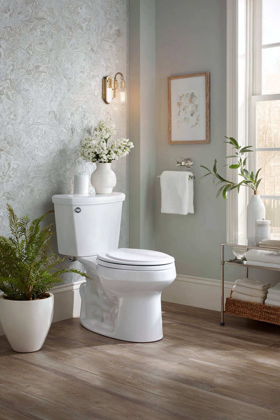 The guest bathroom toilet design creates spaces that make visitors feel comfortable, valued, and welcome. A compact elongated toilet with soft-close seat provides modern comfort while maintaining an appropriately modest footprint for secondary bathrooms. Grasscloth wallpaper in natural beige introduces organic texture and warmth, creating a sophisticated backdrop that feels both luxurious and approachable. Polished nickel fixtures add refined touch without excessive formality, their warm metallic tone creating a welcoming glow.