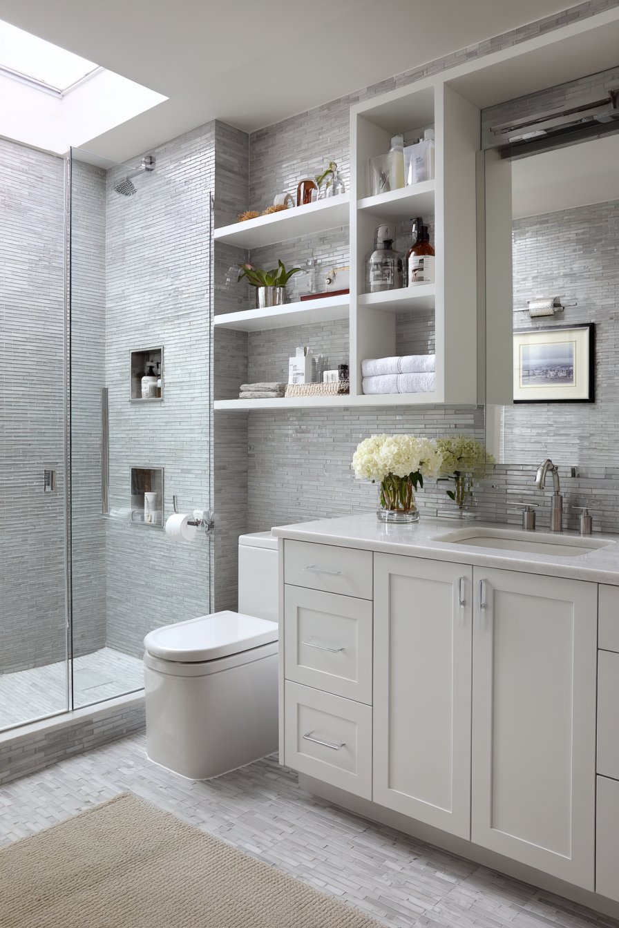 - Use matching tiles and fixtures for cohesive, intentional appearance