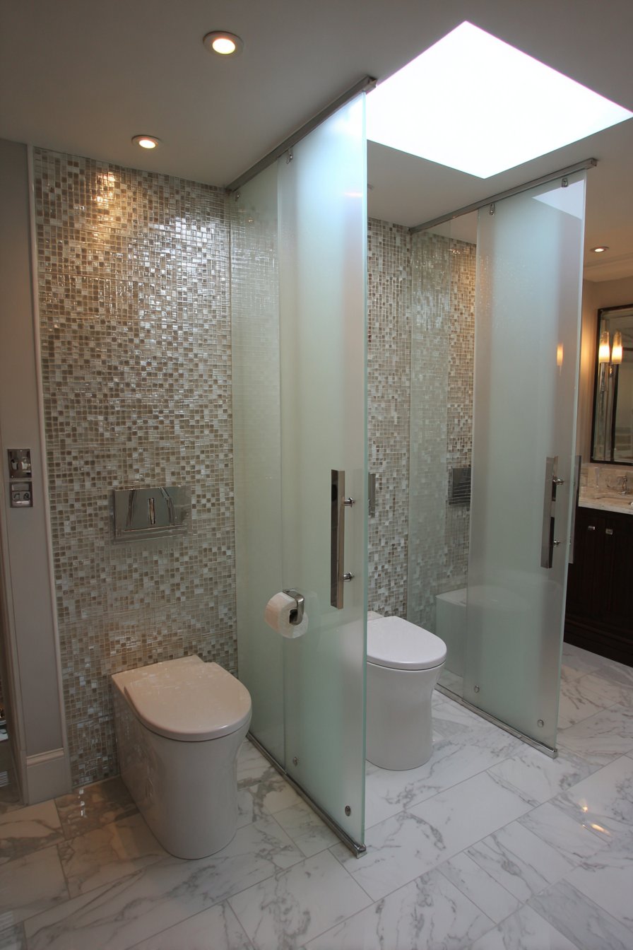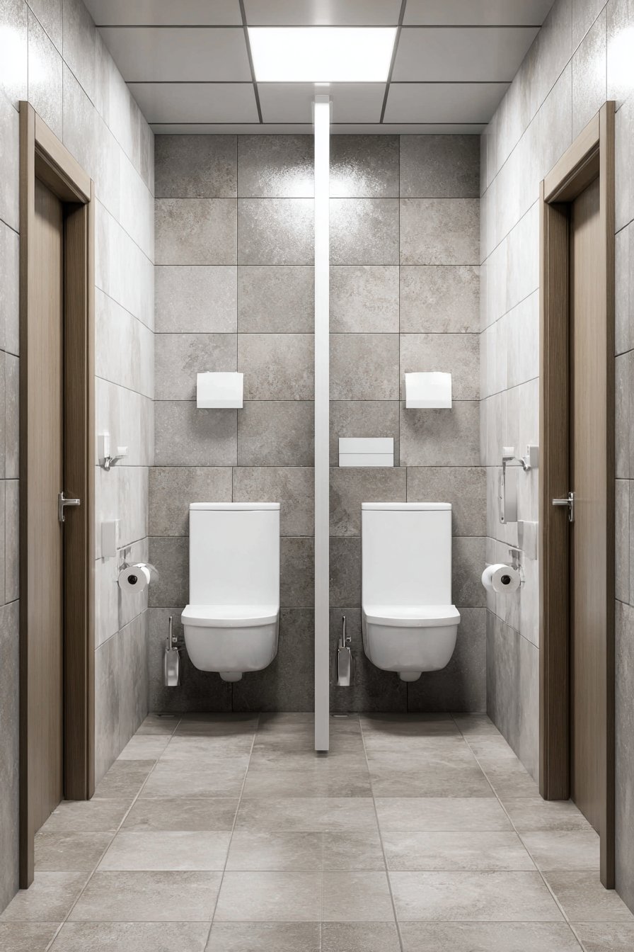 The double toilet design for master bathrooms addresses the practical needs of busy households while maintaining appropriate privacy and aesthetic appeal. Two wall-hung toilets with a privacy partition in frosted glass between them provide simultaneous access without sacrificing individual privacy. Matching grey porcelain wall tiles and white fixtures create a cohesive look that treats the dual toilets as intentional design elements rather than awkward necessities. Individual toilet paper holders and small storage niches for each position ensure both function and fairness.