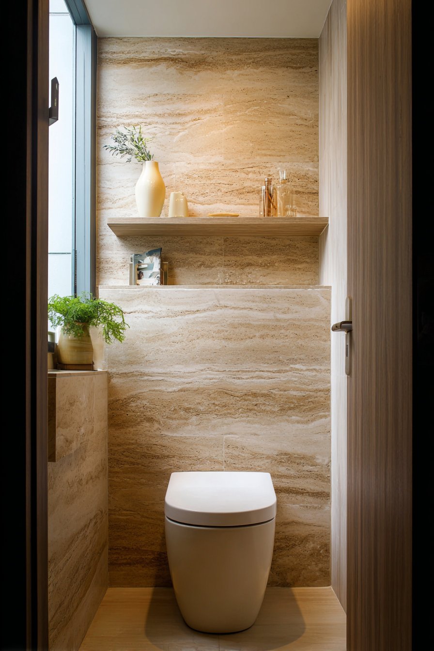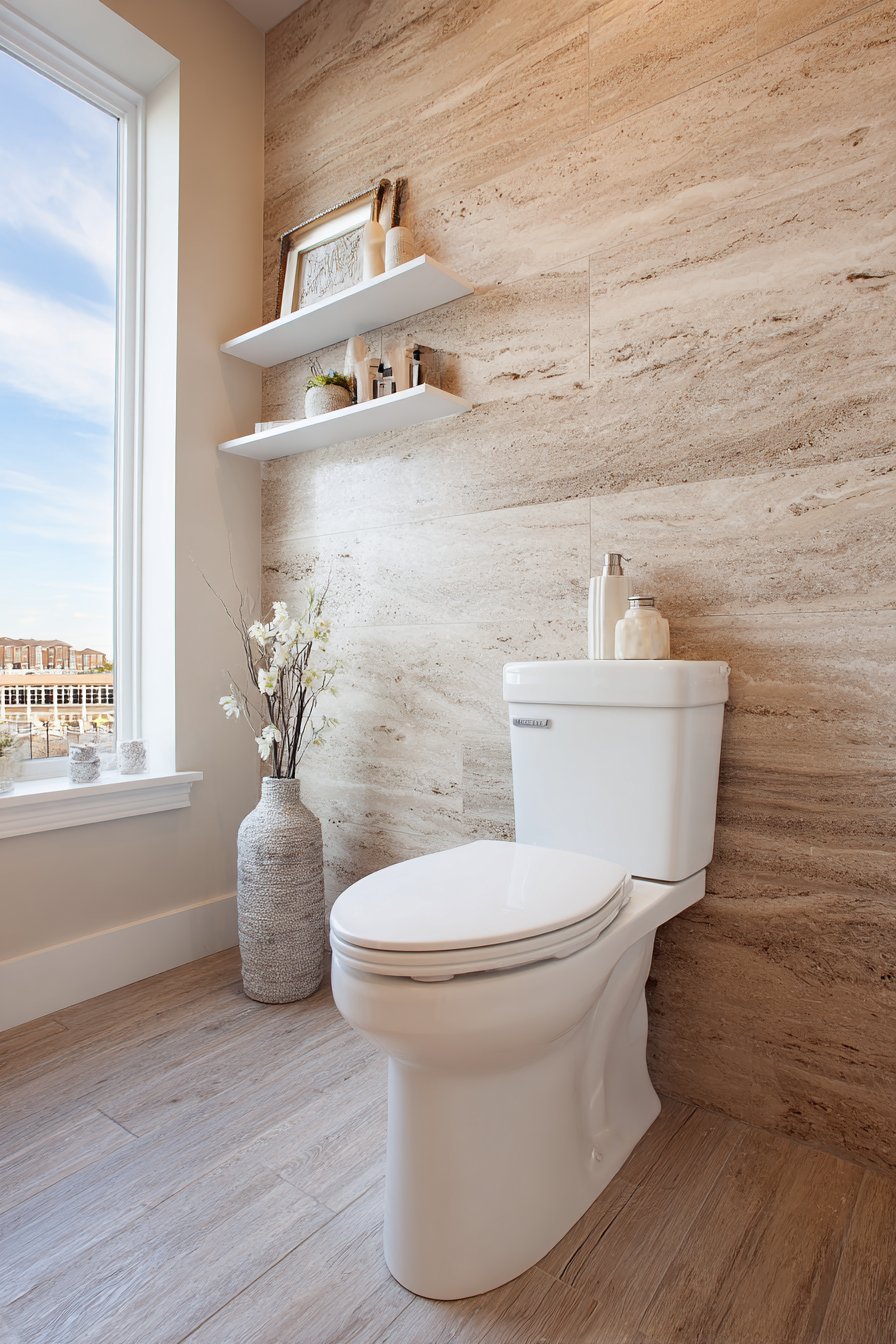 Creating a spa-inspired toilet area transforms a functional necessity into a daily retreat, offering moments of tranquility in even the busiest households. This design concept centers on a comfort-height elongated toilet with a soft-close lid, prioritizing user comfort while maintaining aesthetic appeal. The natural stone accent wall featuring warm beige travertine tiles brings organic texture and earthy warmth into the space, creating an immediate connection to nature that defines spa aesthetics. The varied patterns and subtle color variations inherent in natural stone add visual richness that manufactured materials simply cannot replicate.