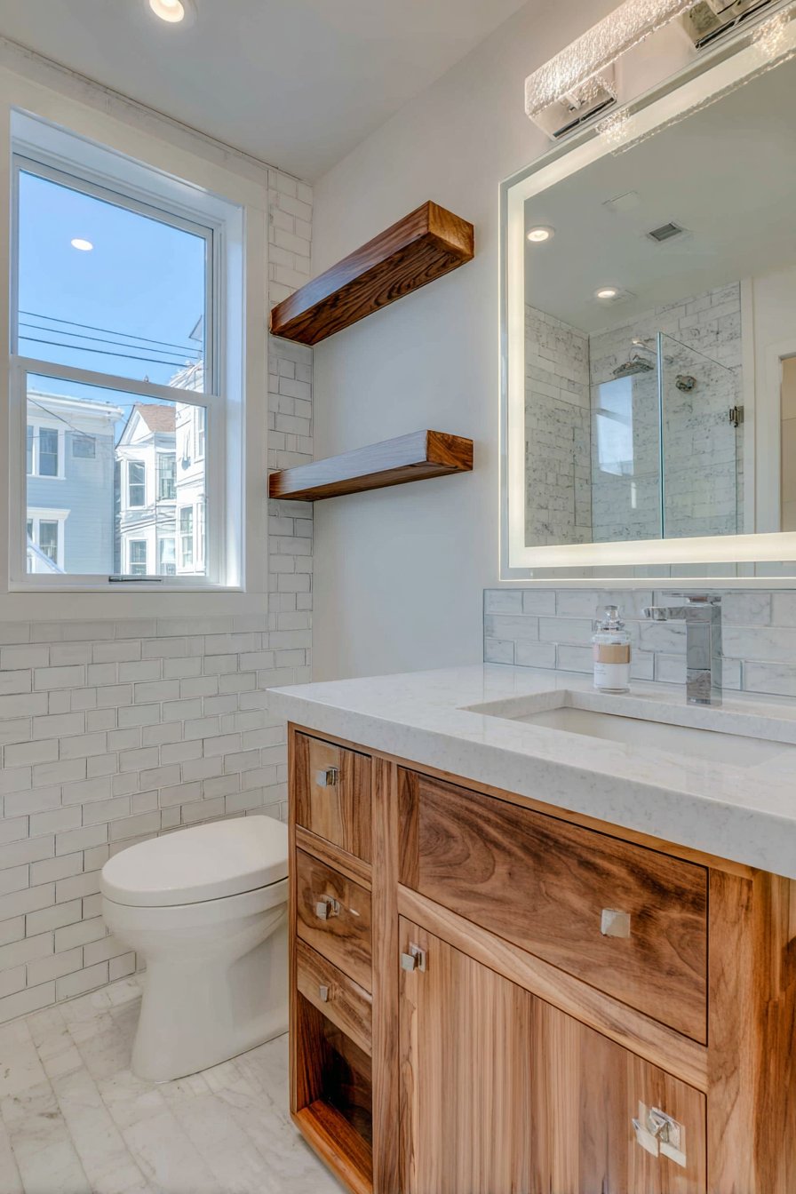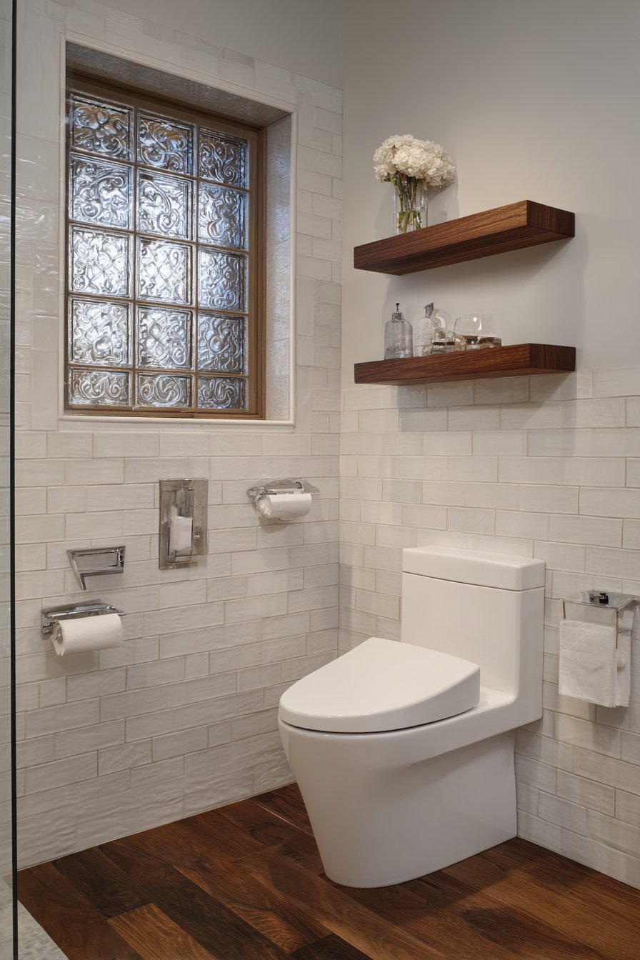 A floating wood shelf in medium walnut tone adds warmth and organic texture, its suspended form reading as contemporary while its wood material maintains traditional warmth. Natural light through textured glass window creates soft glow while maintaining privacy, the translucent glass suggesting contemporary sensibility while the window form remains traditionally scaled and positioned. Interior photography balances timeless appeal with current design trends, capturing how transitional design takes the best elements from both traditional and contemporary aesthetics.