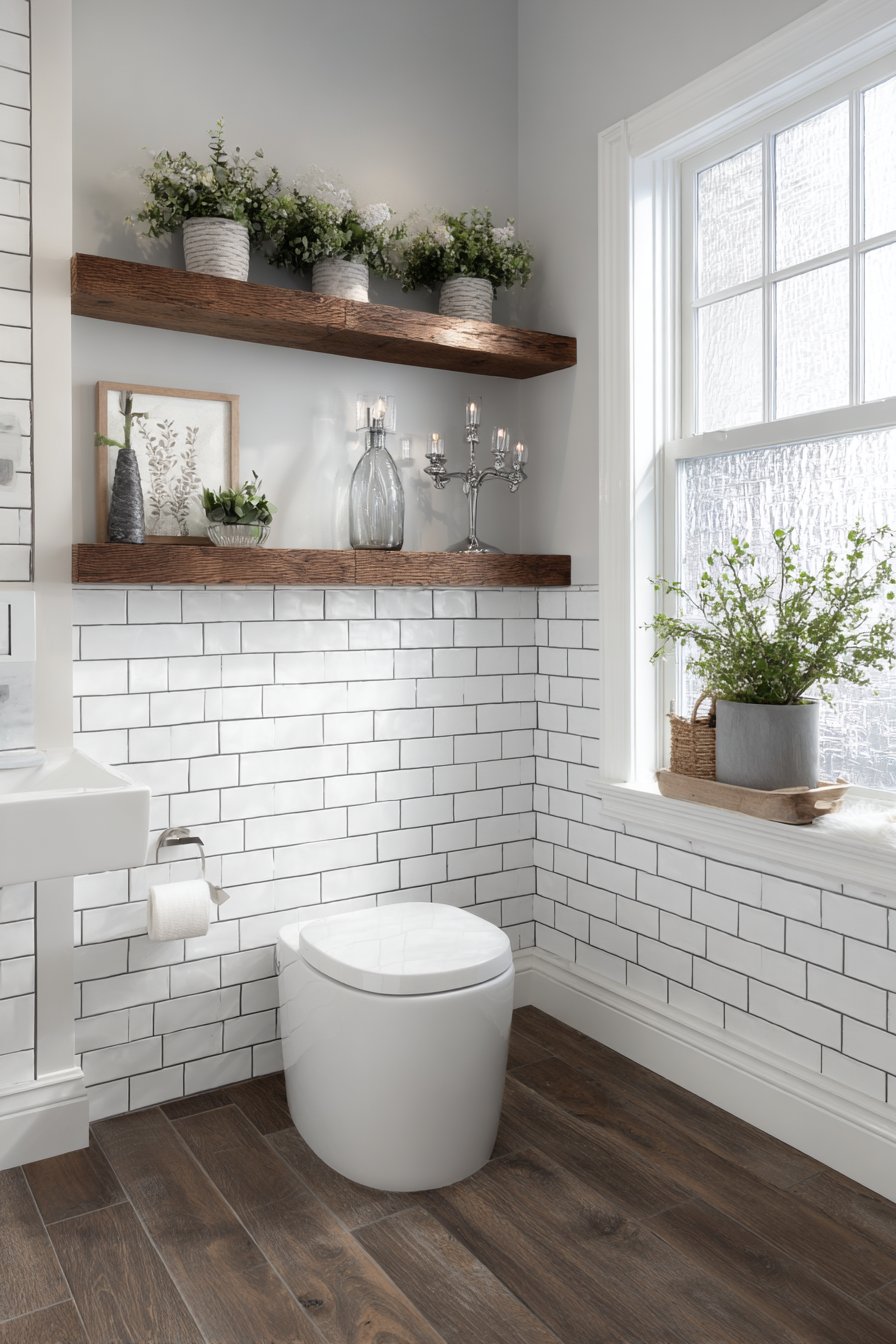 The reclaimed wood floating shelf brings organic warmth and texture into the space while providing practical storage and display opportunities. Displaying simple greenery—perhaps a small potted herb or trailing ivy—the shelf adds life and freshness to the room, connecting the indoor space to the natural world beyond. Natural window light streaming into the space creates warm shadows that enhance the cozy, lived-in quality central to farmhouse design philosophy. This authentic approach to rustic design avoids the pitfalls of manufactured nostalgia, instead creating a space that genuinely honors traditional craftsmanship and materials.