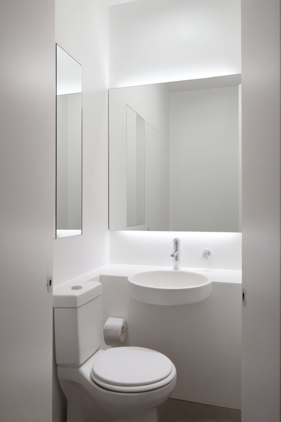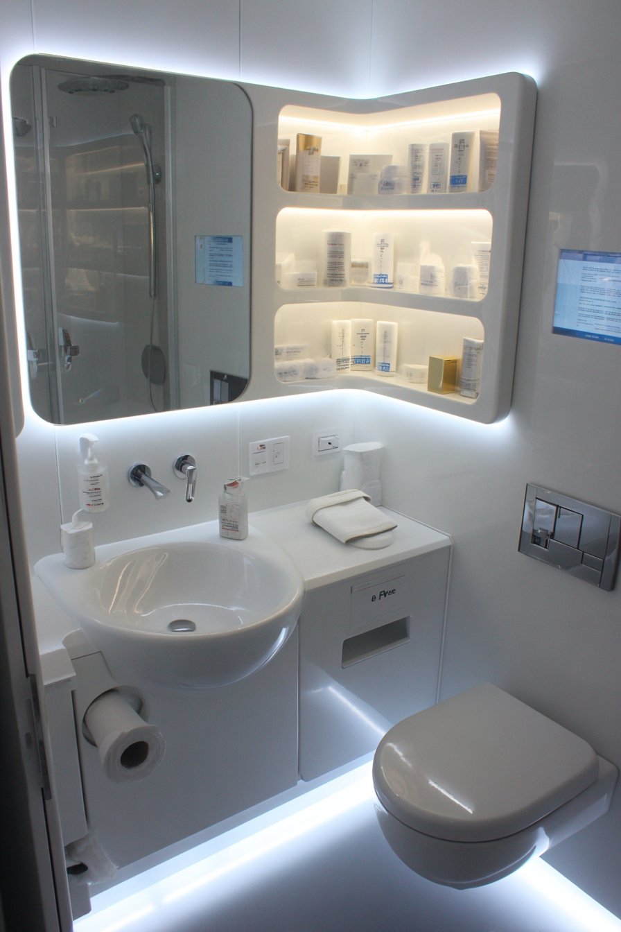 Recessed medicine cabinet provides hidden storage that doesn’t project into the limited space, keeping toiletries and necessities accessible without visual clutter. Bright LED lighting eliminates shadows that could make the small space feel dark or cramped, while the white surfaces reflect and multiply the light throughout the space. Photography demonstrates smart spatial planning and visual expansion techniques, showing how constraint can inspire creativity and innovation.