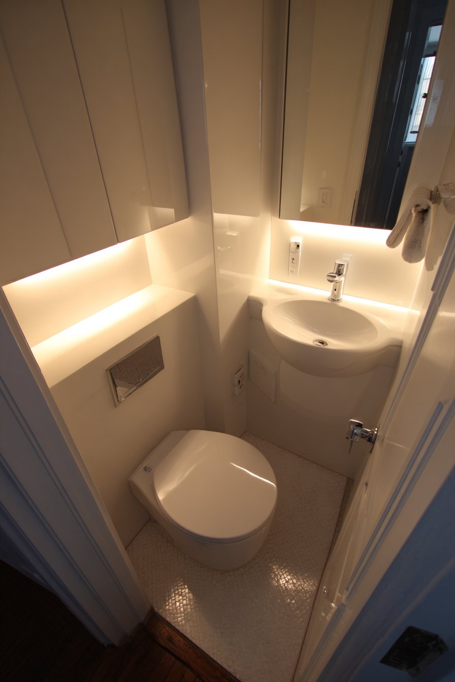 - Install compact elongated toilets that provide comfort in appropriately scaled fixtures