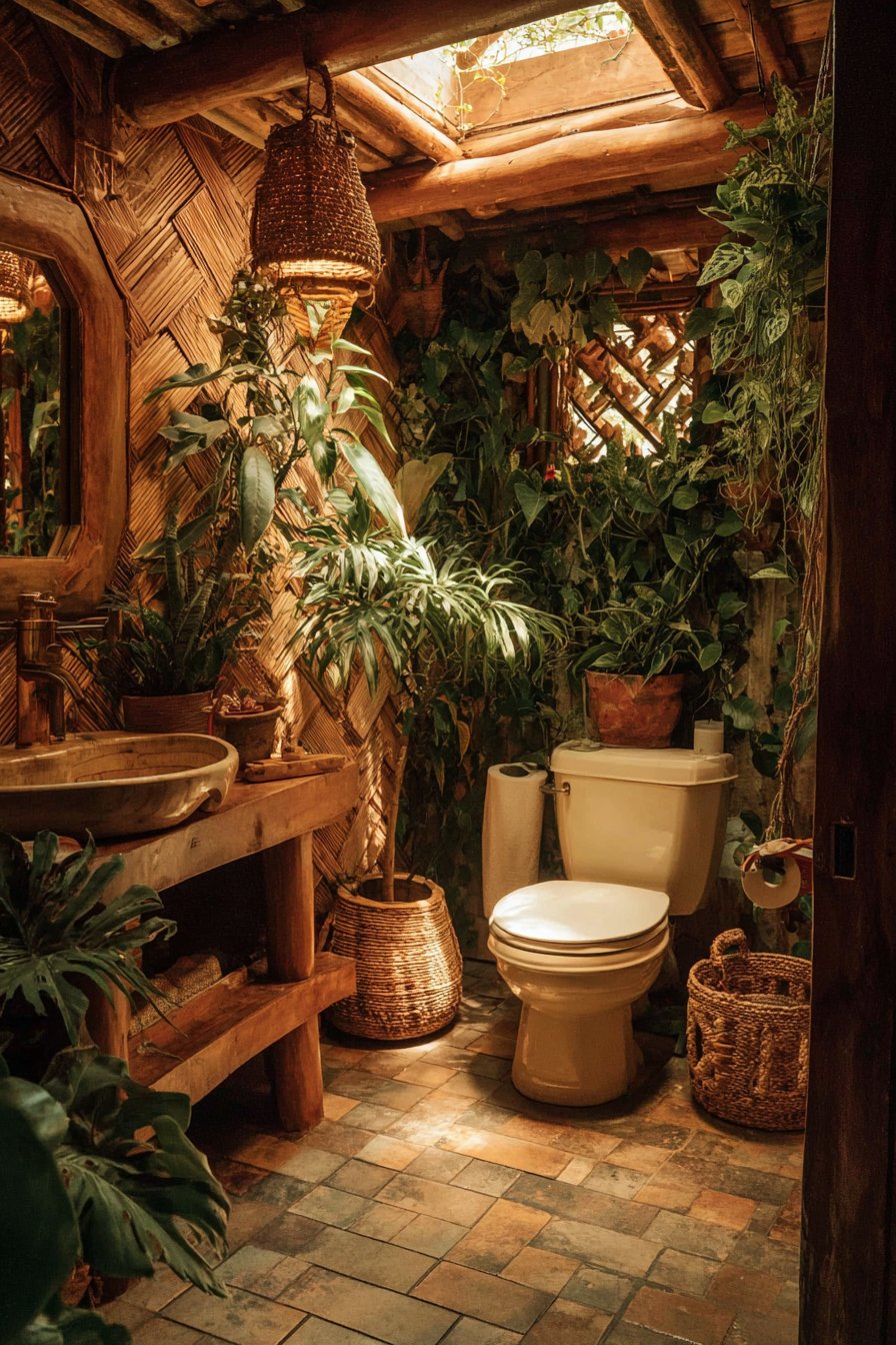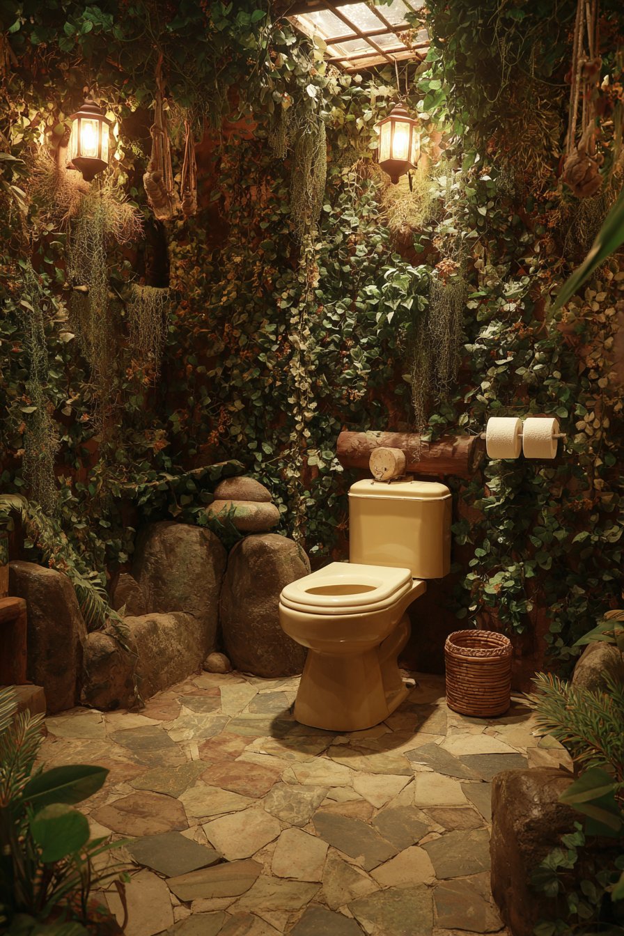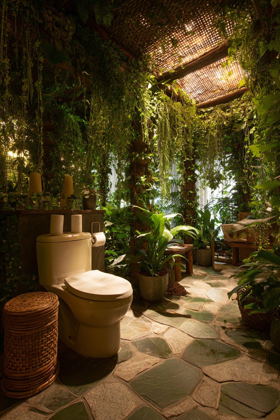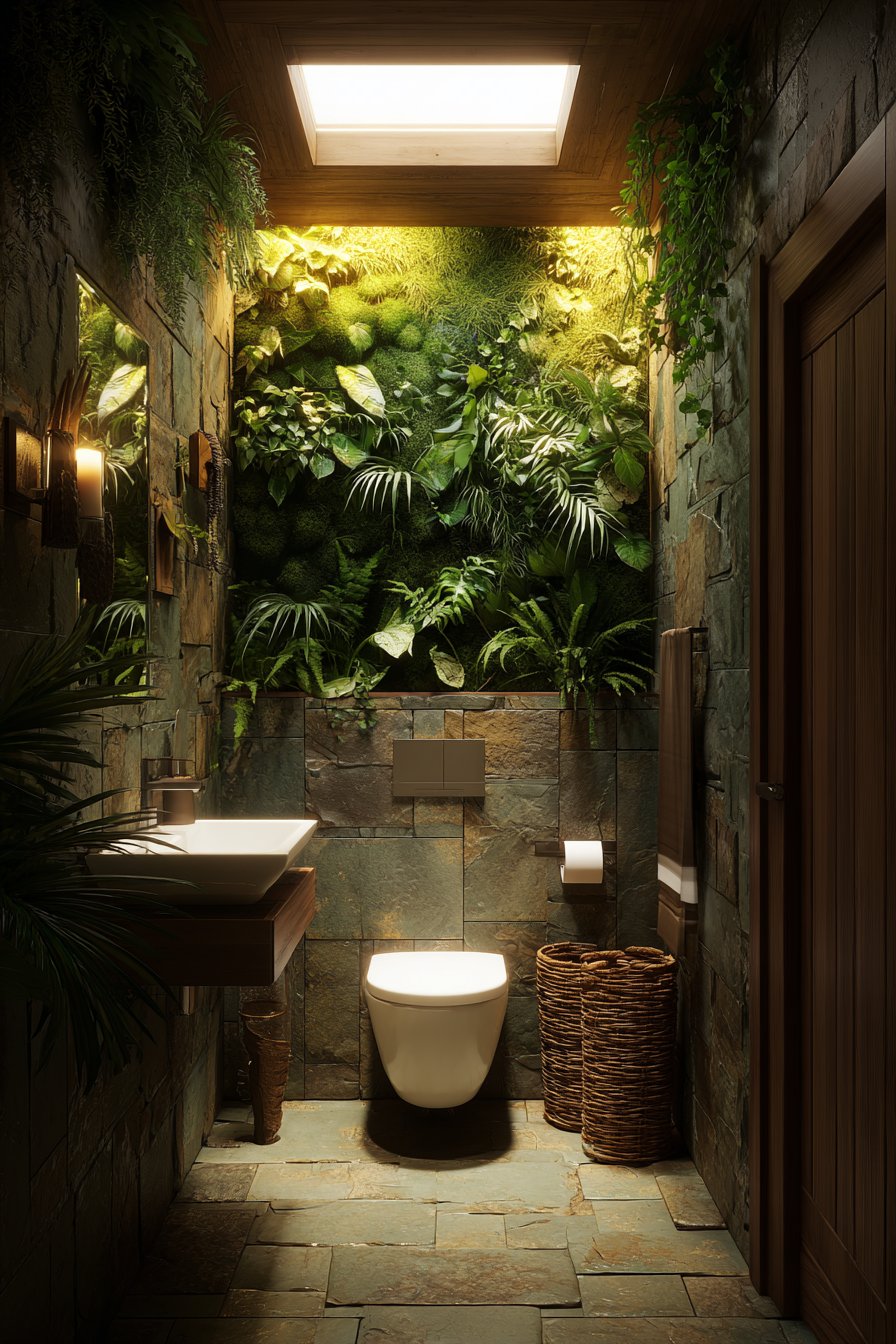 The nature-inspired toilet design embraces biophilic principles, creating a bathroom environment that maintains strong connection to the natural world. A standard toilet sits within a bathroom featuring a living plant wall behind it, creating a lush green backdrop that brings nature directly into the space. Natural stone floor tiles and wooden accents reinforce the organic theme, their varied textures and warm tones echoing materials found in natural settings. A skylight provides natural illumination for both the plants and the space, connecting interior and exterior through light and supporting the plants’ biological needs.