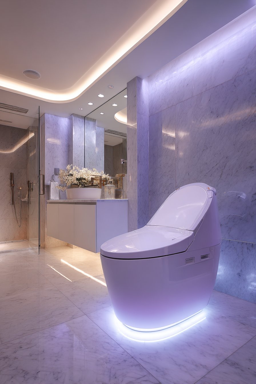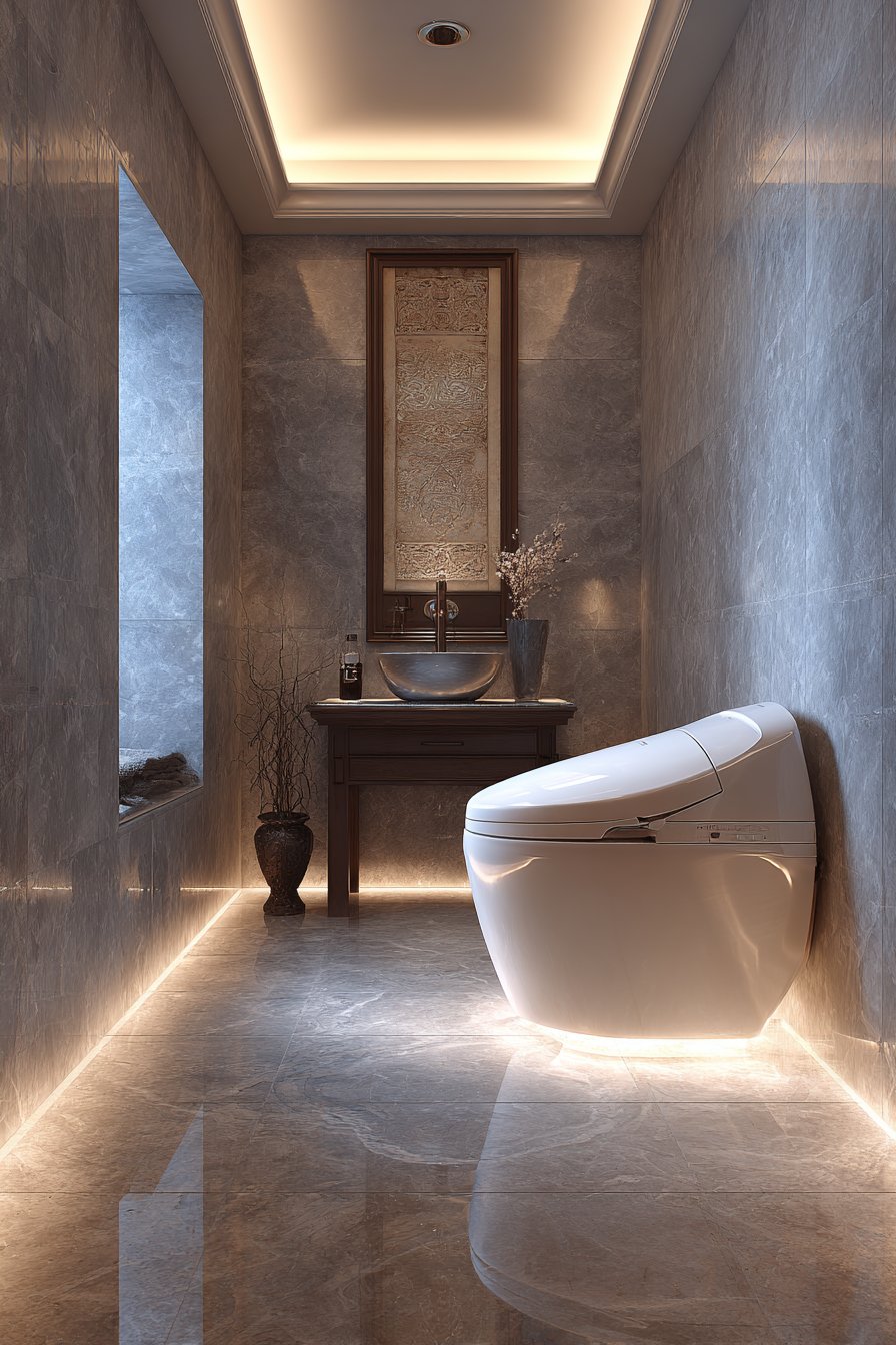 The luxury spa toilet design represents the pinnacle of bathroom technology and material excellence. A high-end intelligent toilet with automatic opening lid, heated seat, air dryer, and deodorizer transforms daily routines into pampered experiences. Floor-to-ceiling marble slabs in soft grey create an elegant backdrop that speaks to luxury and permanence, their book-matched veining creating symmetrical patterns that add formal elegance. Indirect LED lighting in ceiling cove provides gentle ambient glow that enhances the marble’s depth and variation while creating the soft, flattering light characteristic of high-end spa environments.