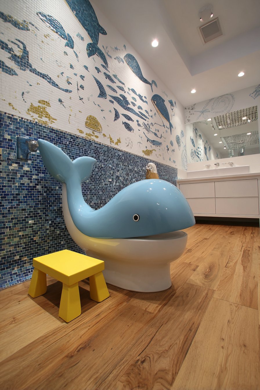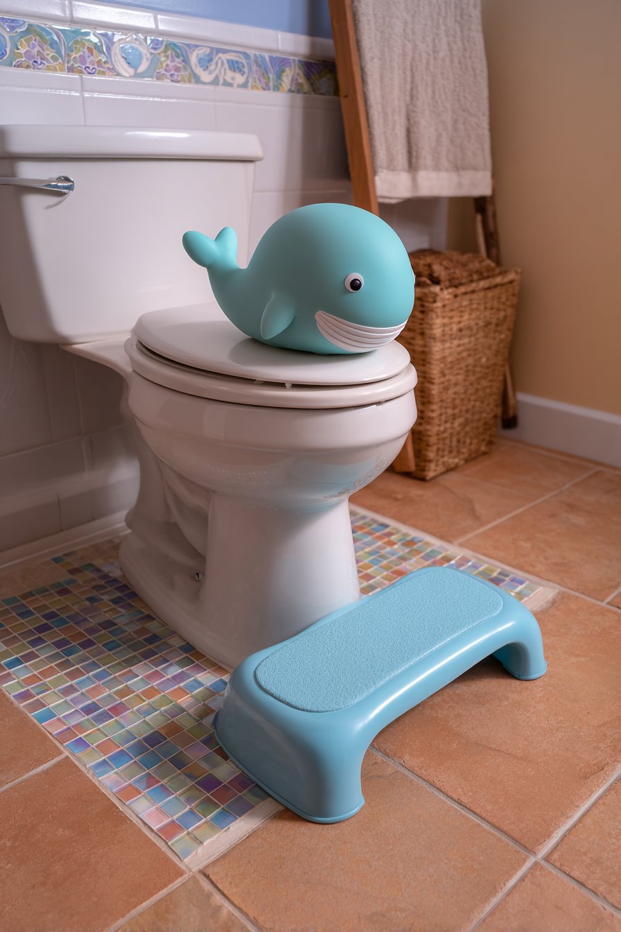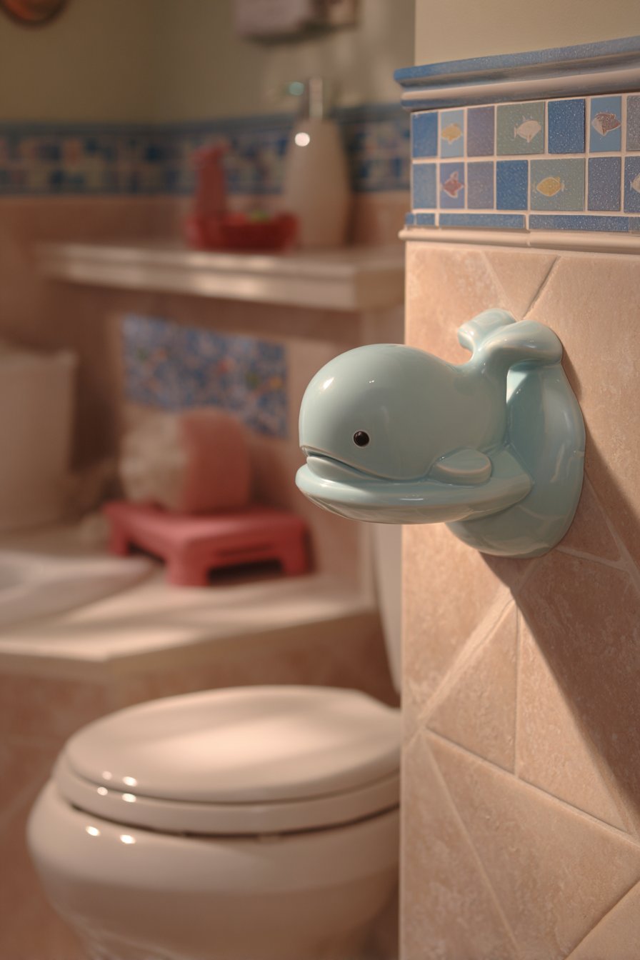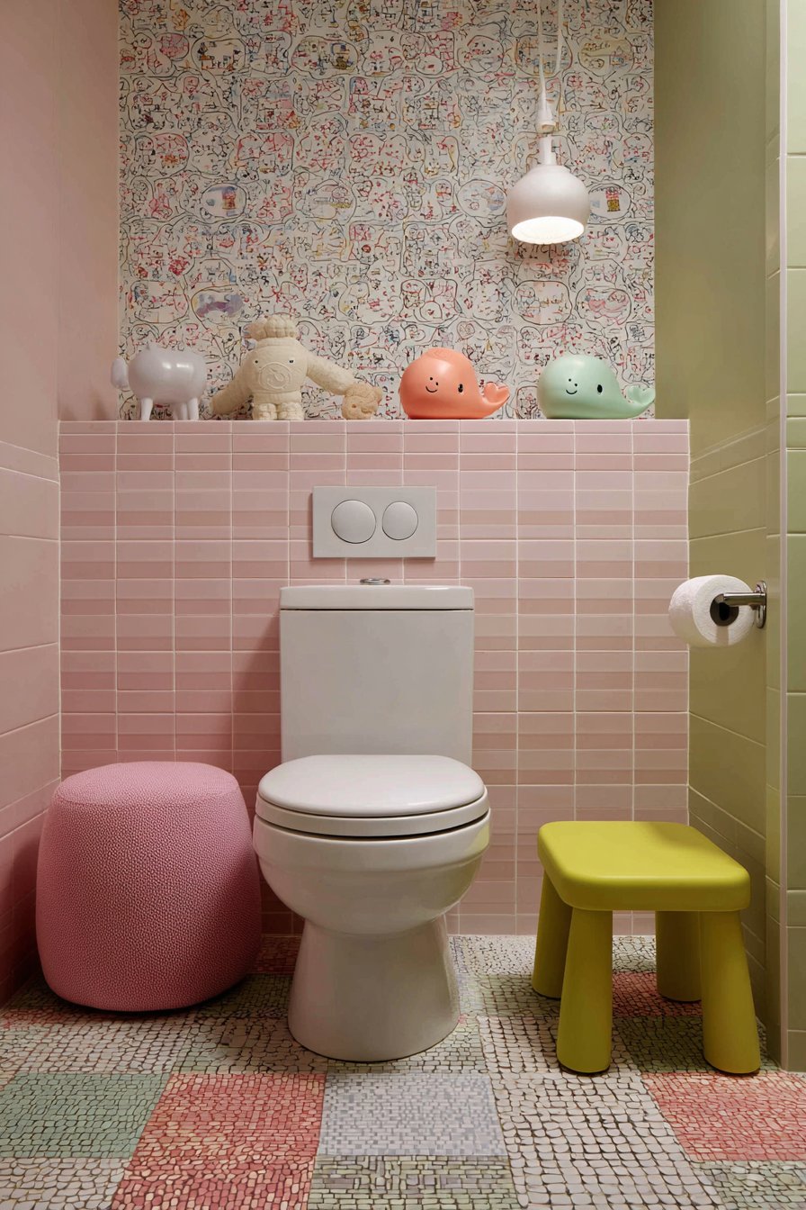 The kids’ bathroom toilet design creates spaces that work for children while growing with them through changing developmental stages. A comfort-height toilet with fun whale-shaped toilet paper holder makes necessary functions more engaging for young children while the toilet height remains appropriate into adolescence. Colorful mosaic tile border positioned at child eye-level adds visual interest where children can appreciate it, creating decoration scaled to young users. A sturdy step stool in bright color provides easy access for small children while its simple form ensures it remains useful for years.