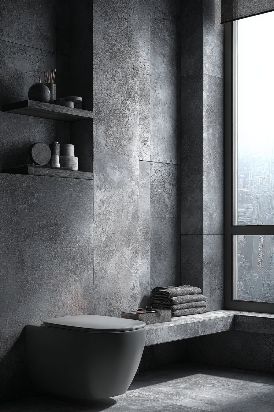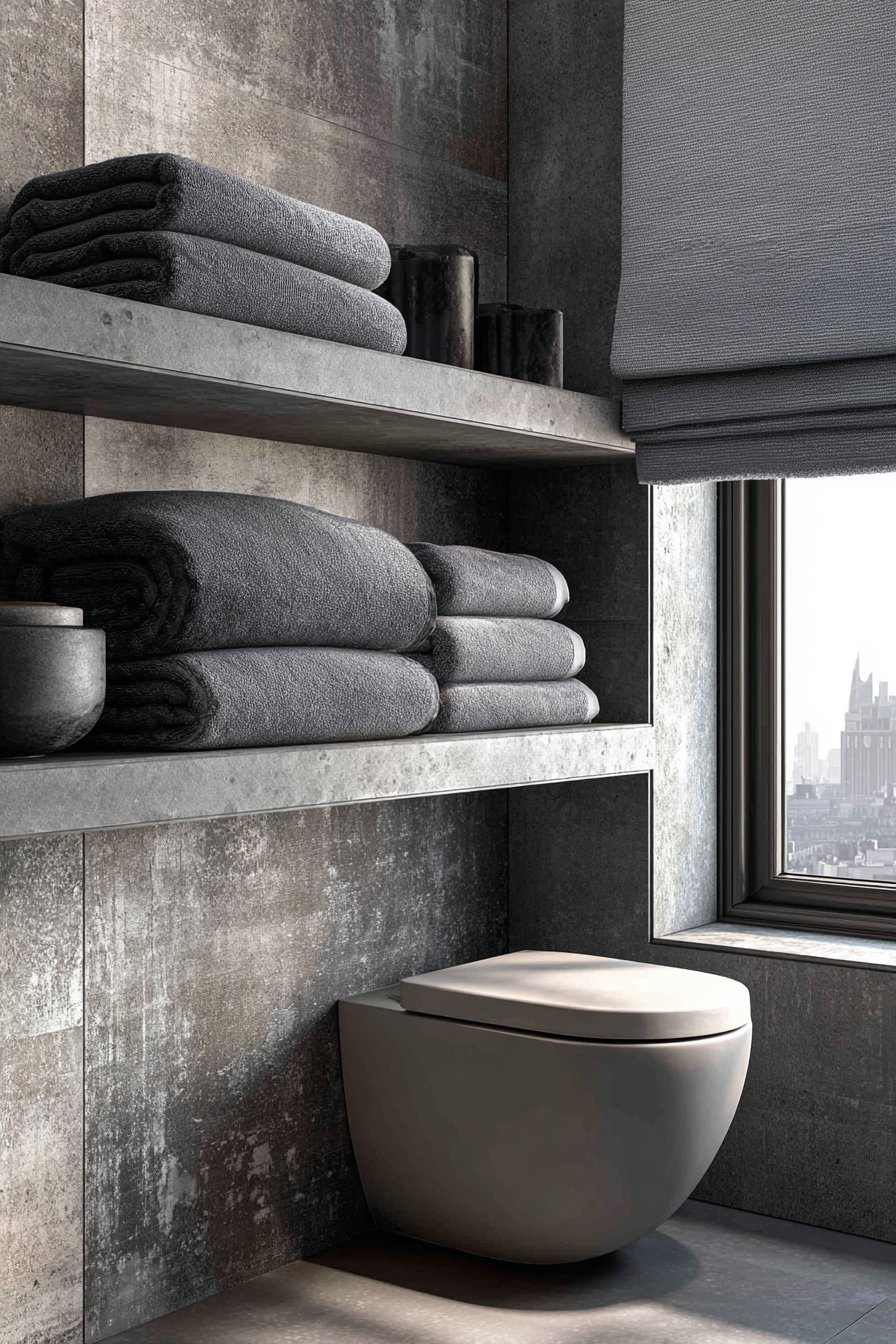The monochromatic grey toilet design explores the surprising complexity available within a single color family. A wall-mounted toilet in light grey ceramic stands against darker grey textured tiles, the tonal variation creating depth and interest without introducing multiple colors. Grey concrete-look floating shelf holds grey towels and accessories, creating layers of grey that range from nearly white to almost charcoal. Matte grey fixtures complete the sophisticated palette, their low-sheen finish adding another textural variation to the monochromatic scheme.