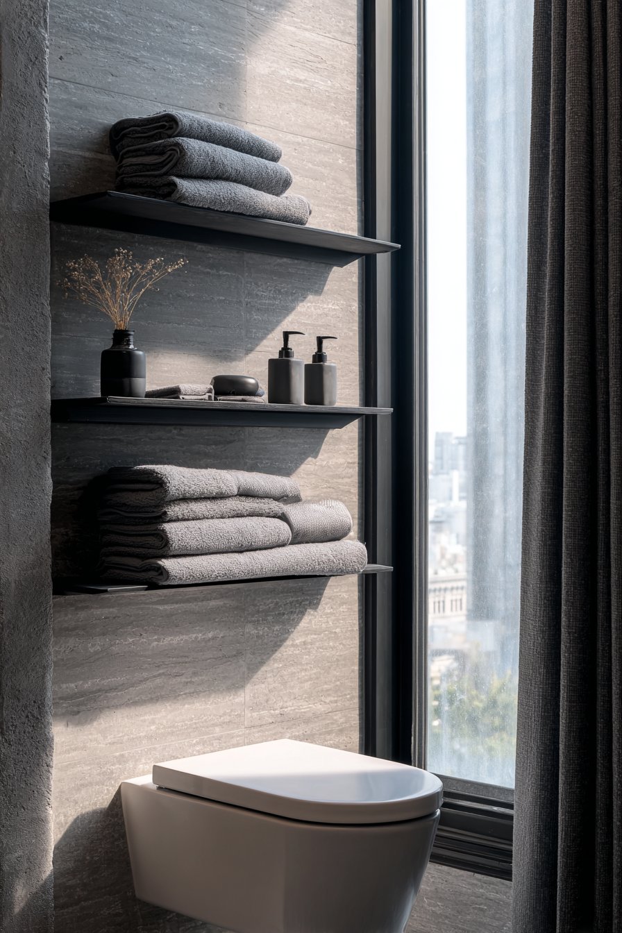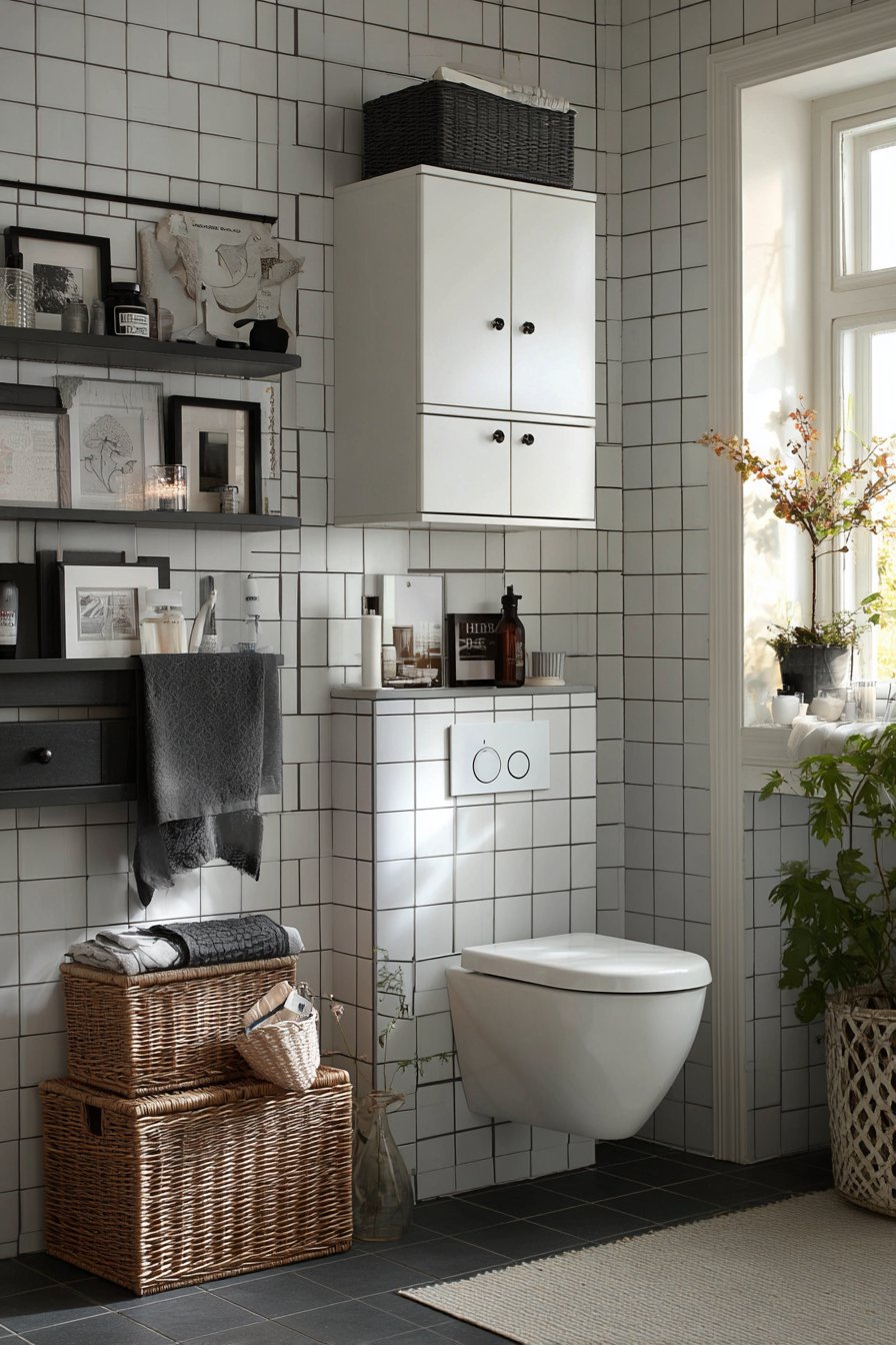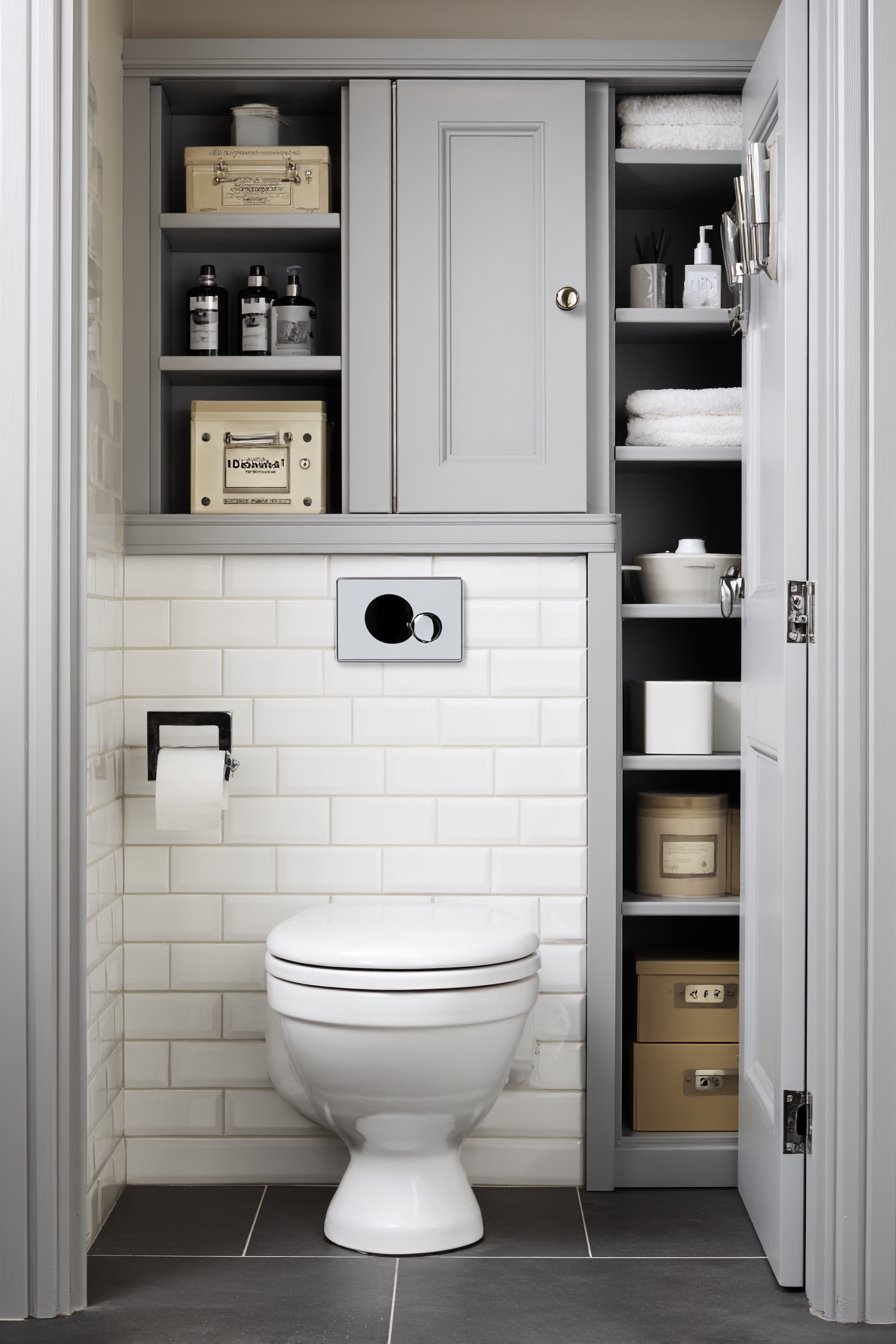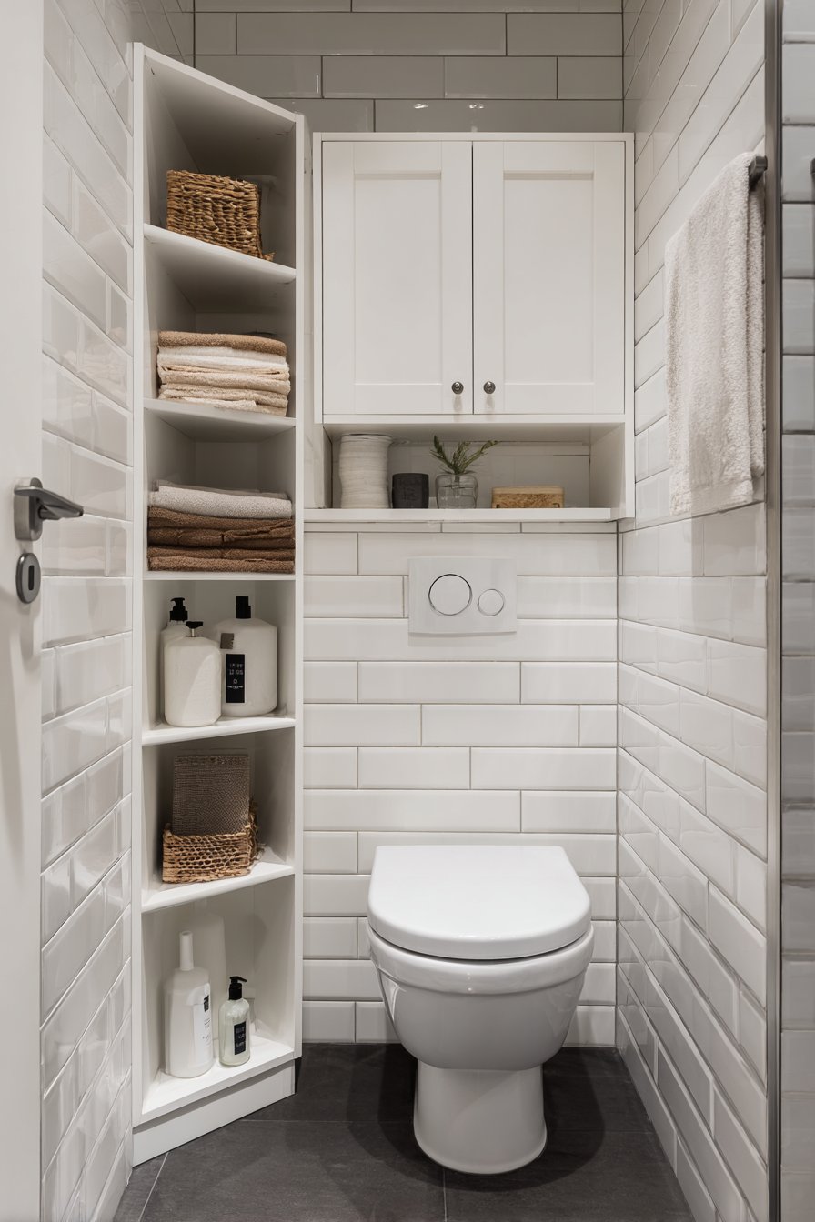 - Install wall-mounted cabinets above toilets for efficient vertical storage
